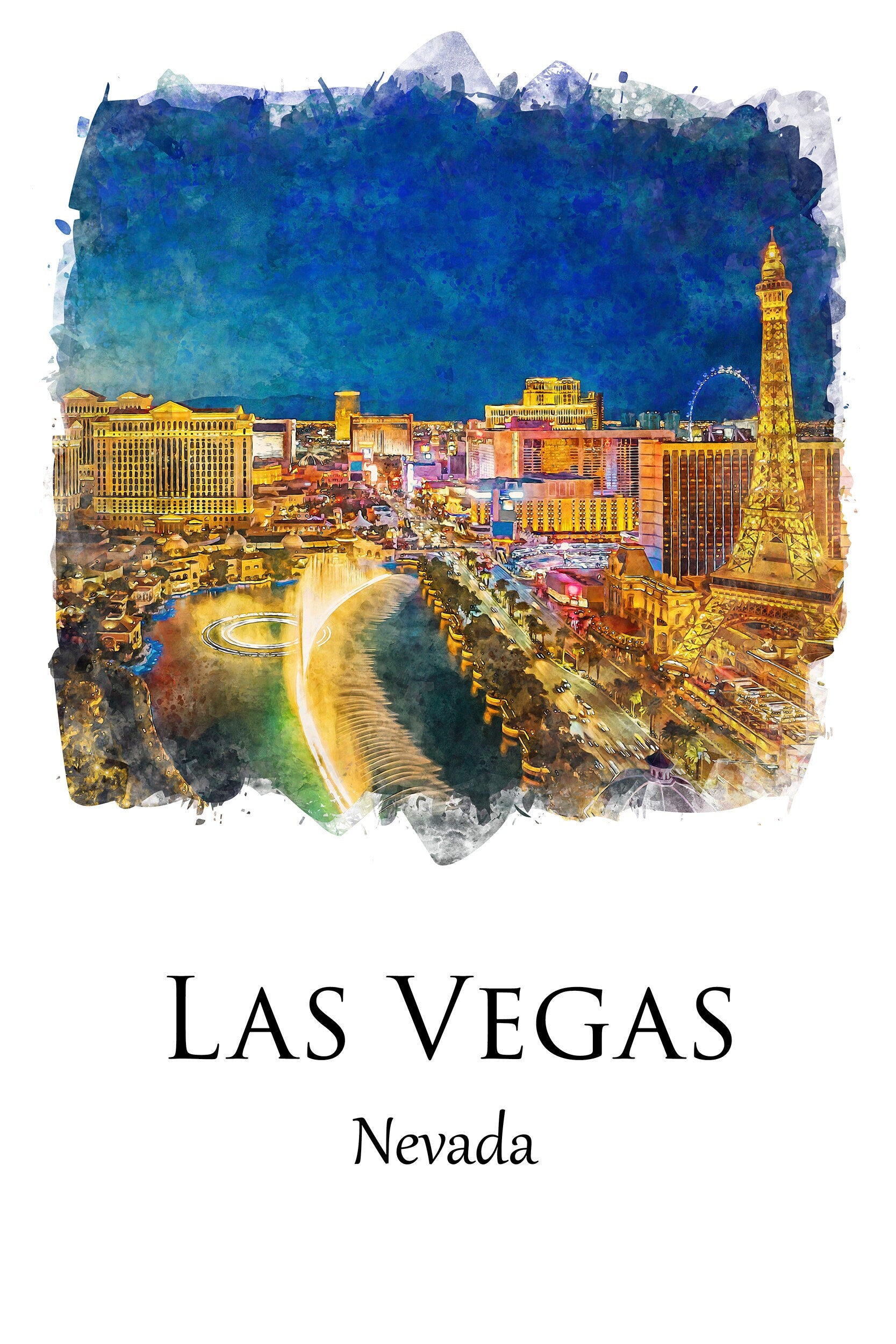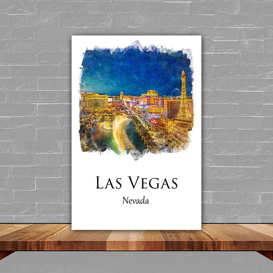 Infuse your living space with the vibrant essence of Las Vegas art print with this stunning Las Vegas watercolor travel art canvas print. The bold, bright colors and whimsical watercolor technique capture the essence of this bustling city’s bright lights and dynamic energy.