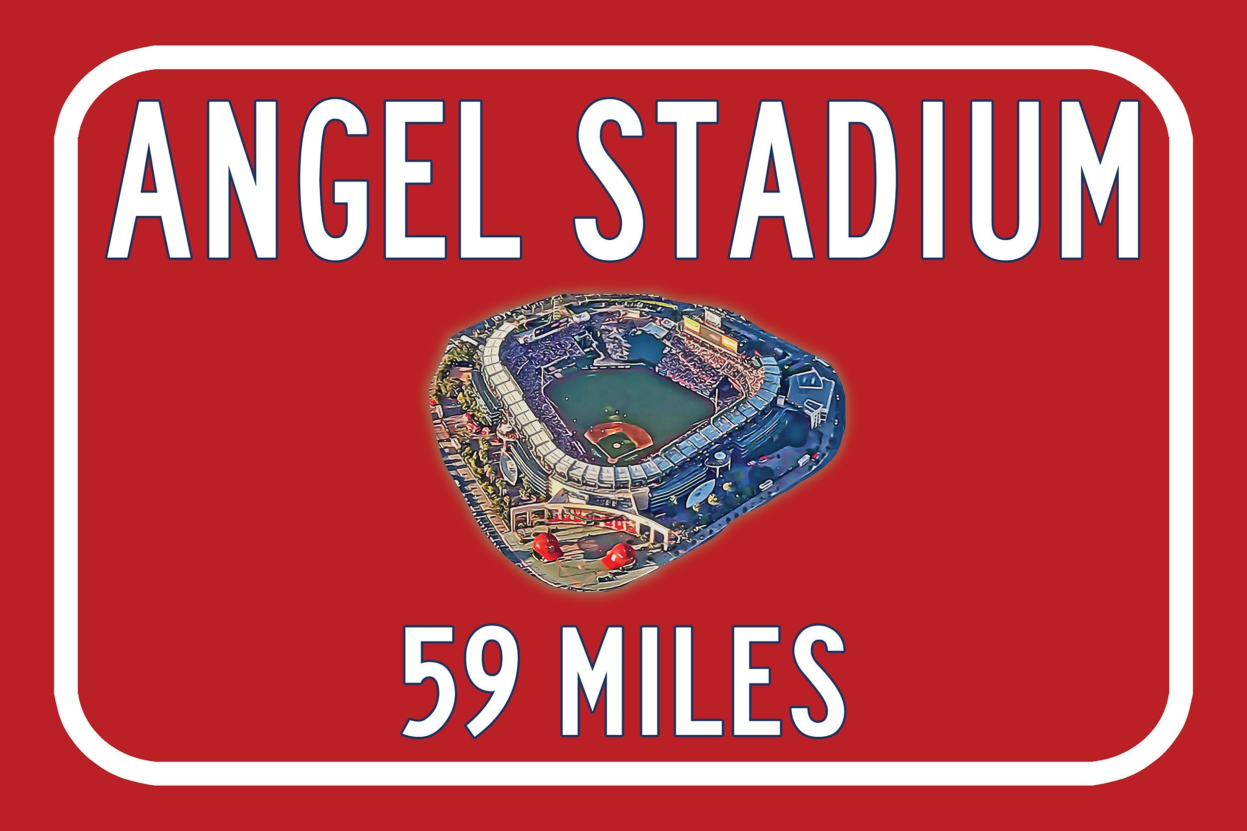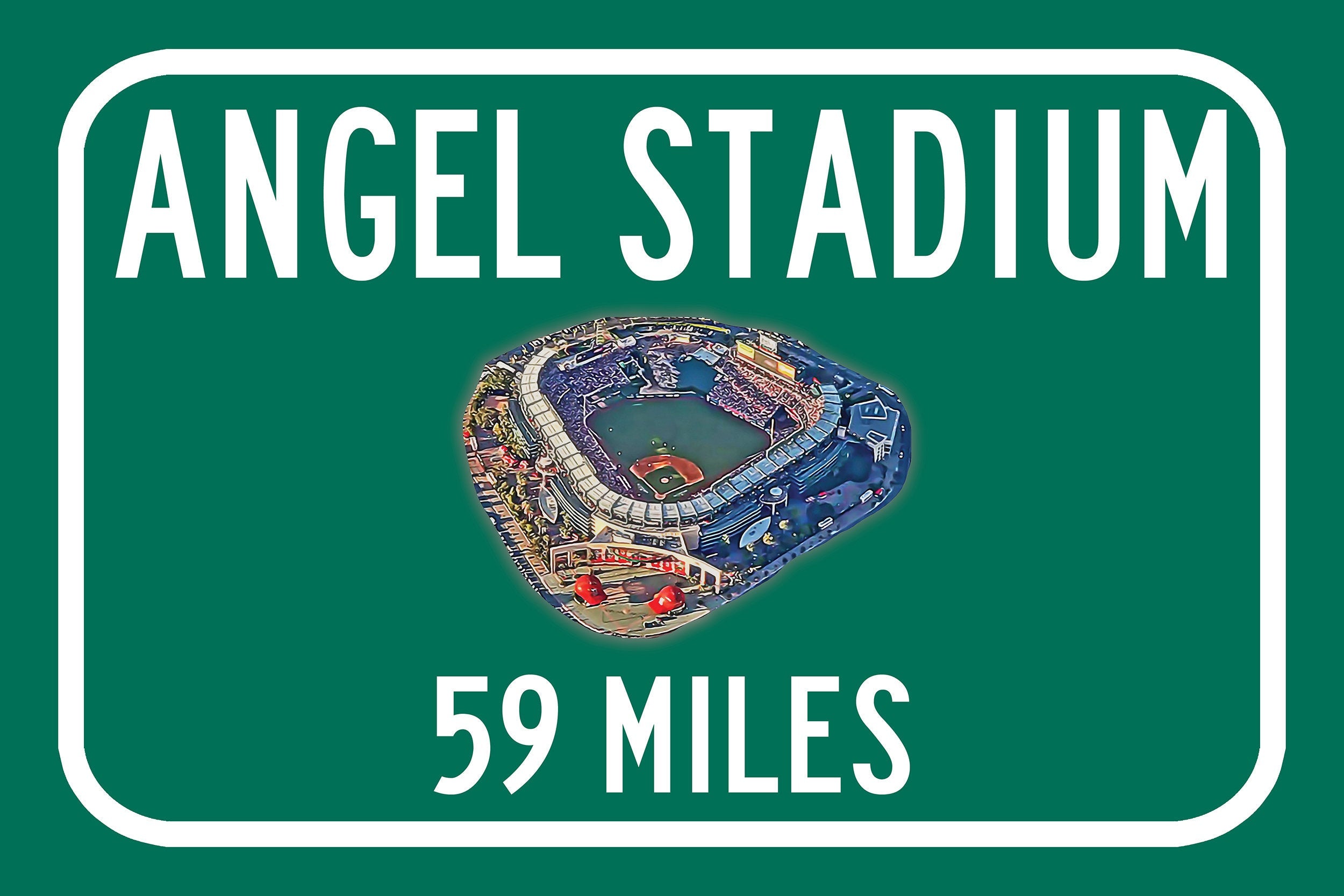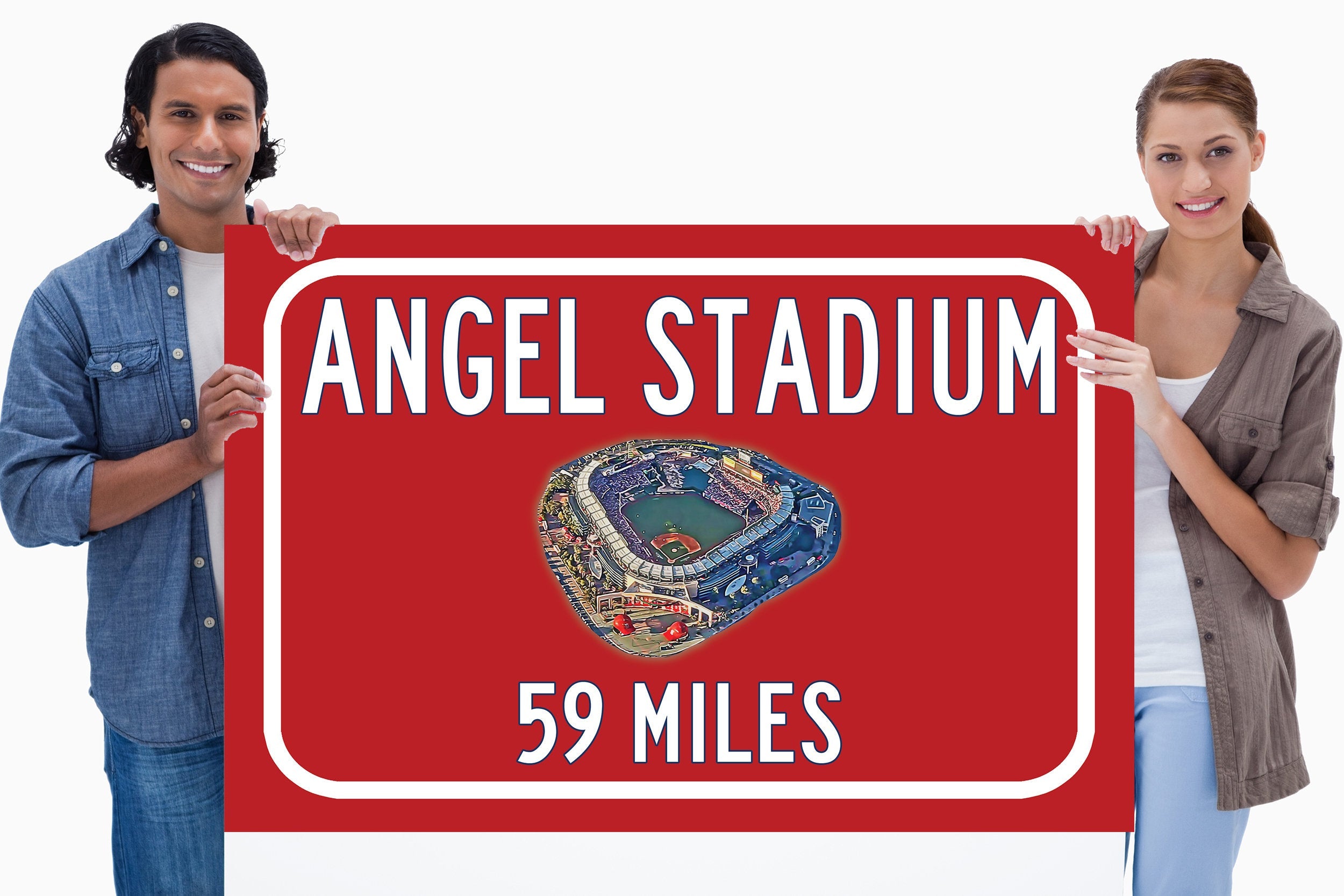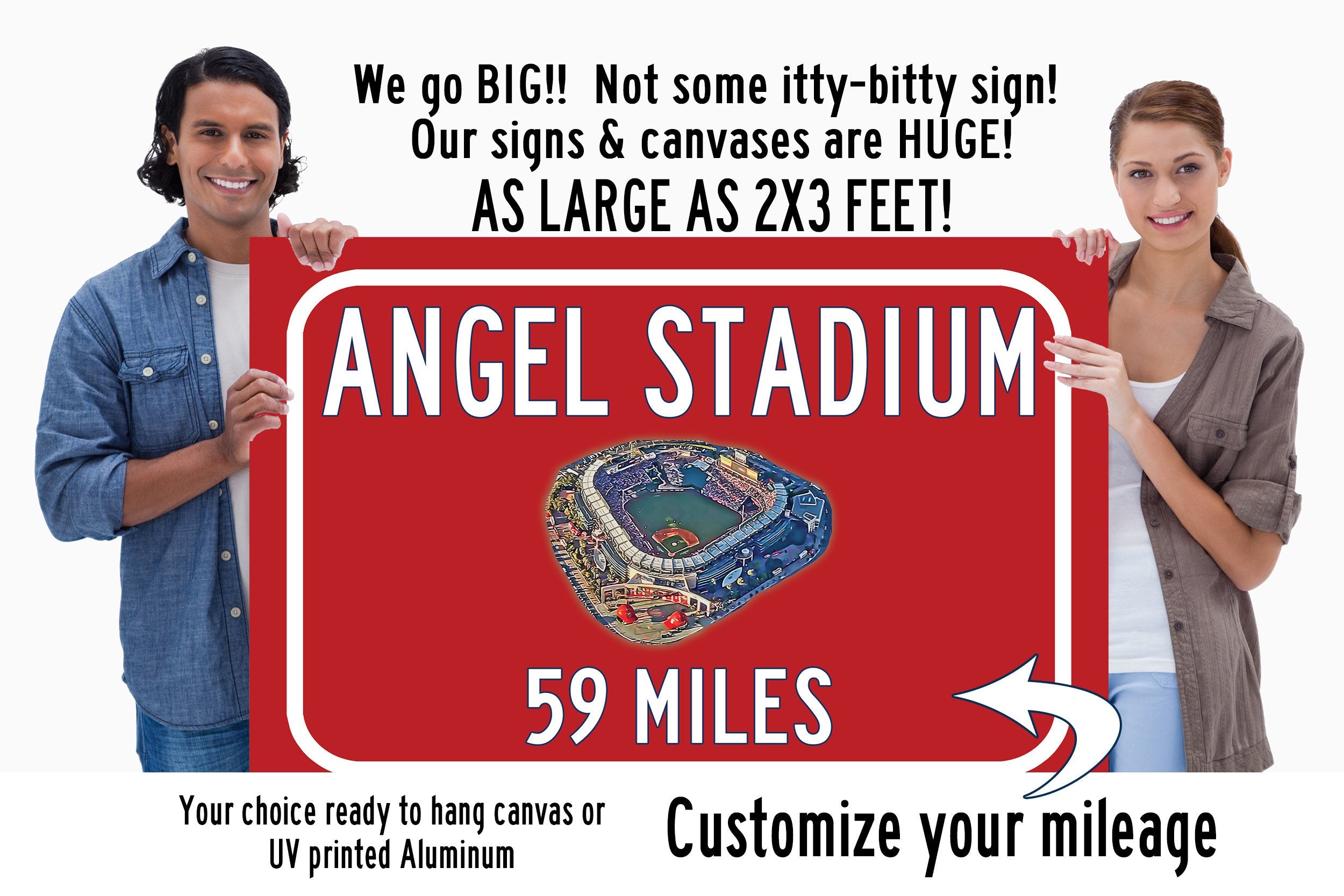 Personalized Highway Distance sign to Angels Stadium in Anaheim. Custom replica road sign, with a watercolor photo of the stadium made with real distance from you to Angels Stadium. WE GO HUGE!! Not some itty-bitty sign, Our signs are as large as 2 x 3 FEET! Angels Stadium highway sign. Los Angeles Angels sign