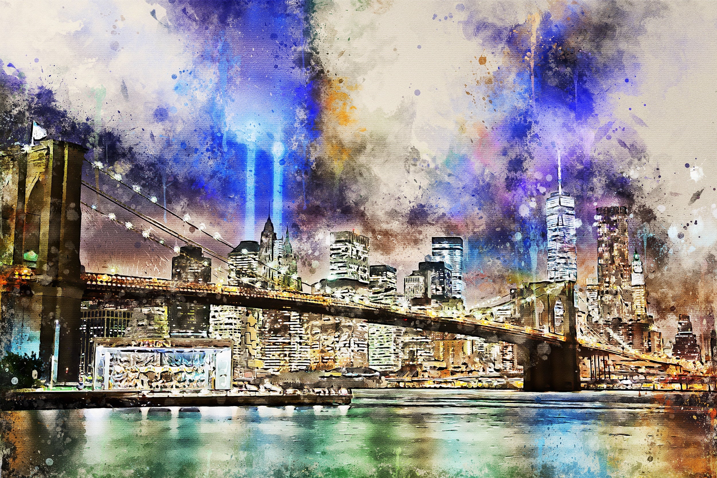 Stunning print of the Manhattan watercolor skyline at night. New York City watercolor. Great for a piece of wall art. Great for a piece of wall art. Available as a single canvas at 16″ x 24″ , 24″ x 36″ , or 32″ x 48″ or we can make you a special 3 panel work of art or purchase our digital download to print yourself (no product will be sent)
