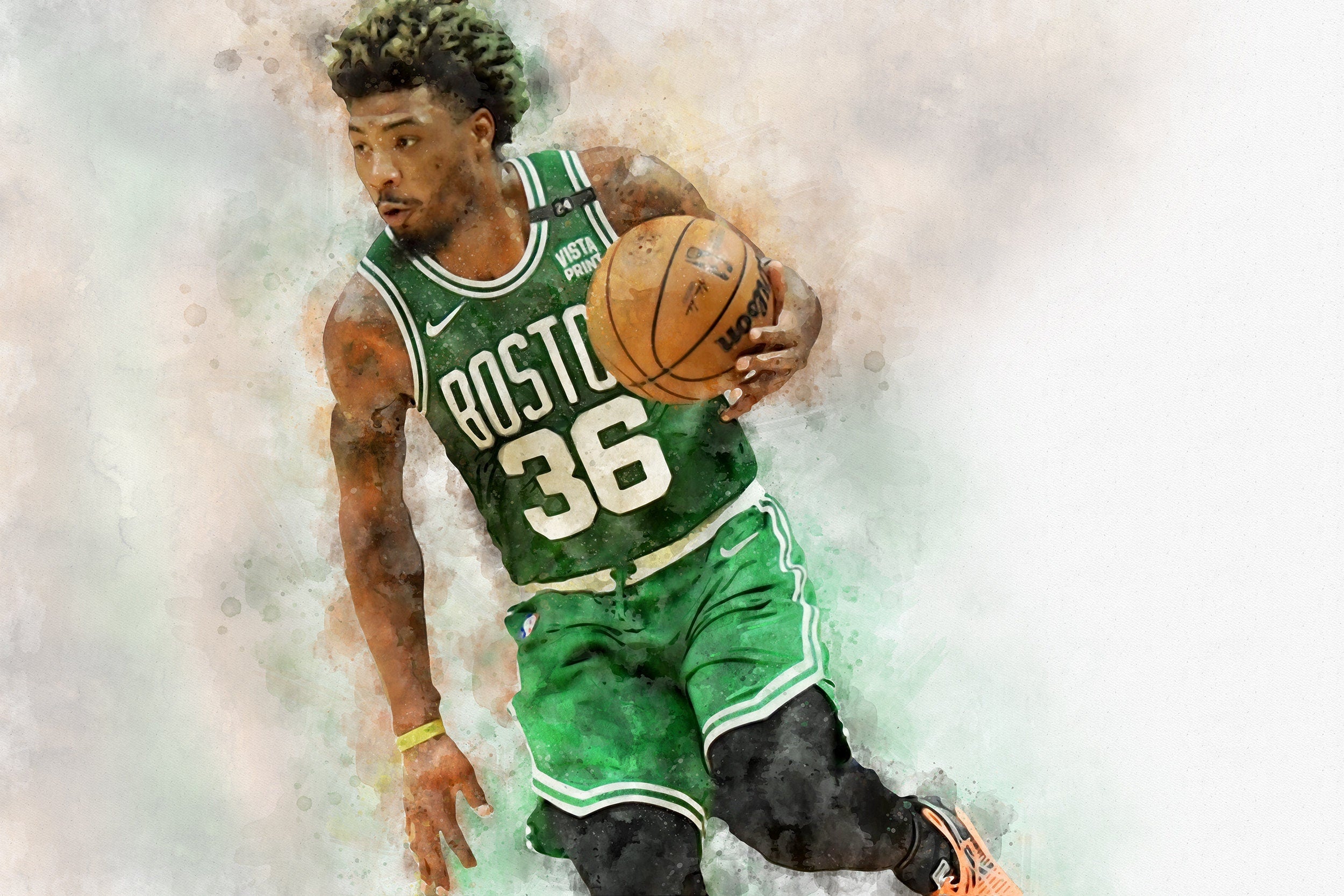Beautiful watercolor of Marcus Smart playing for the Boston Celtics.