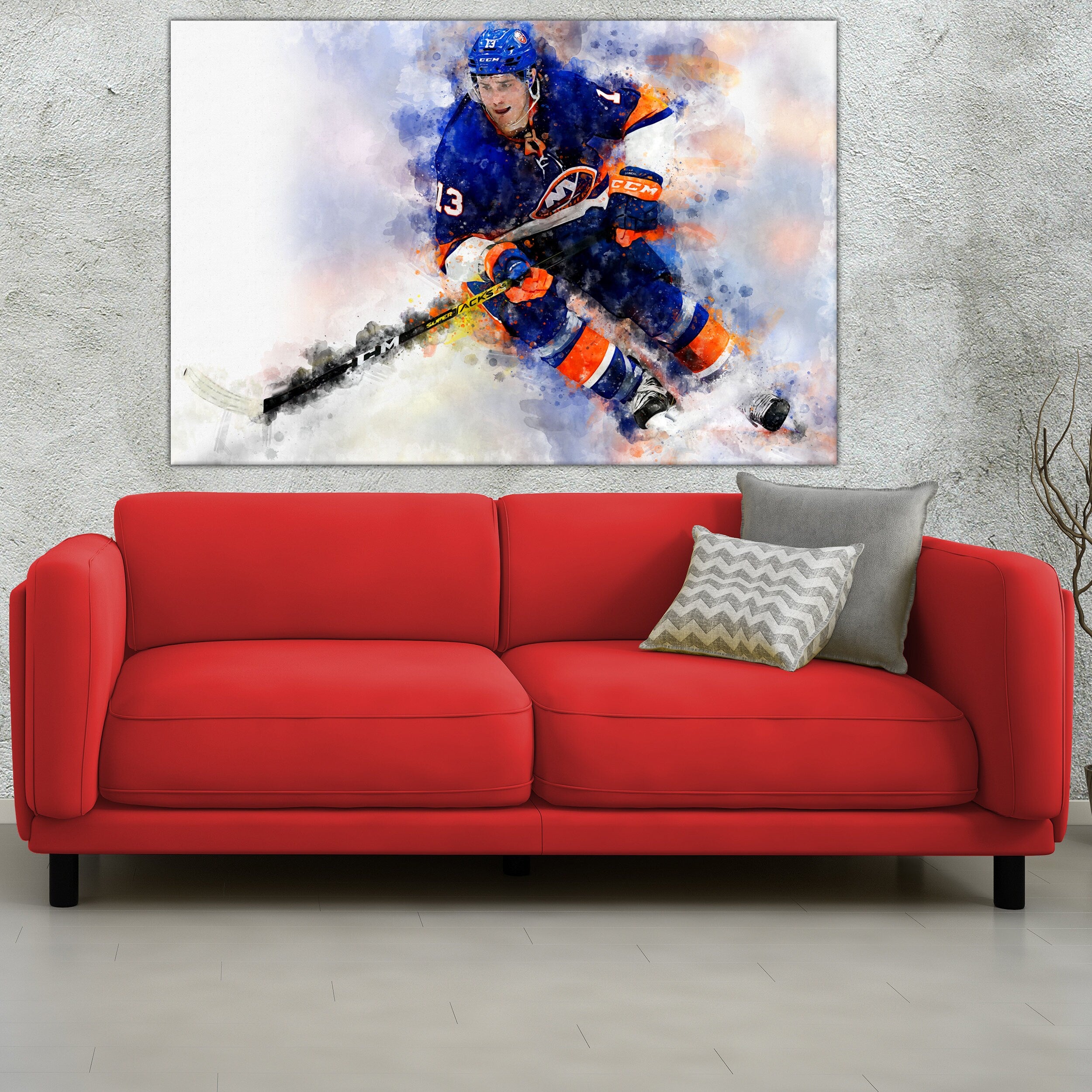 Great for a piece of Mathew Barzal wall art. Available in several sizes as an unframed print or a ready to hang mounted canvas