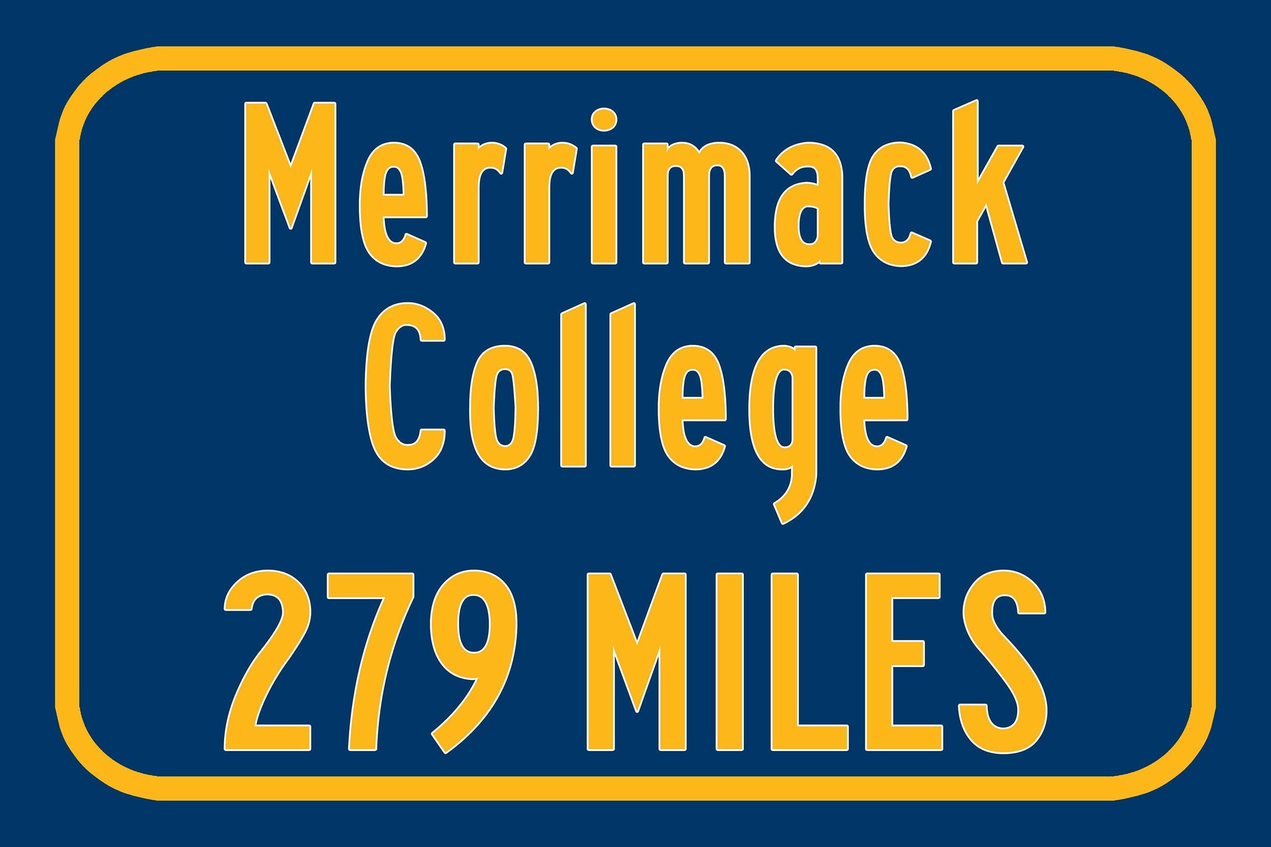 Personalized Highway Distance sign to Merrimack College / Merrimack Warriors / North Andover Massachusetts /