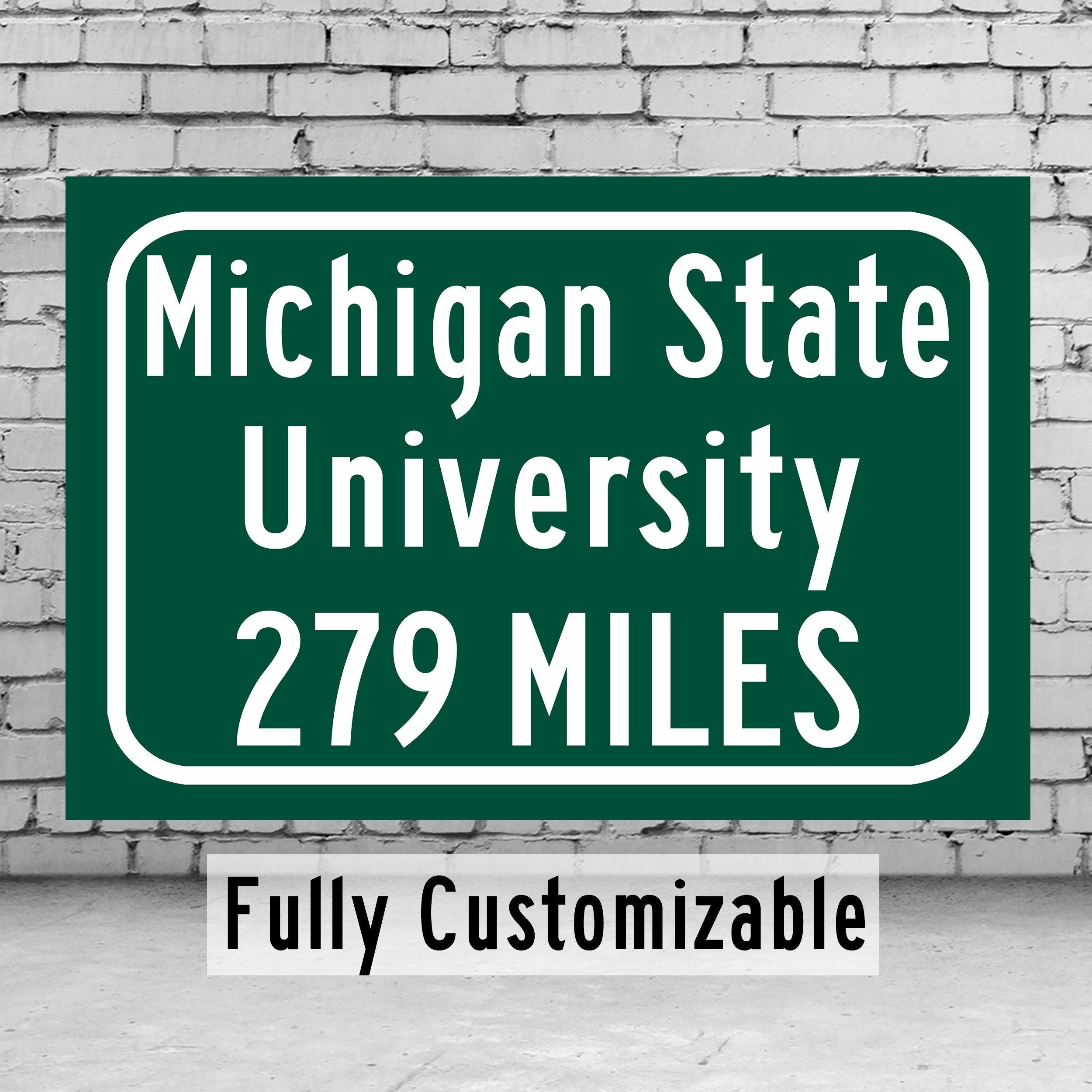 Personalized Highway Distance sign to Michigan State University Spartans. Michigan State University East Lansing Sign