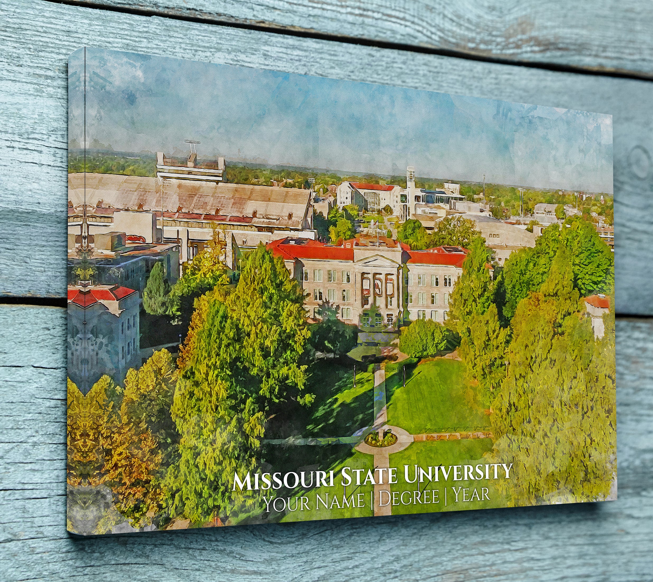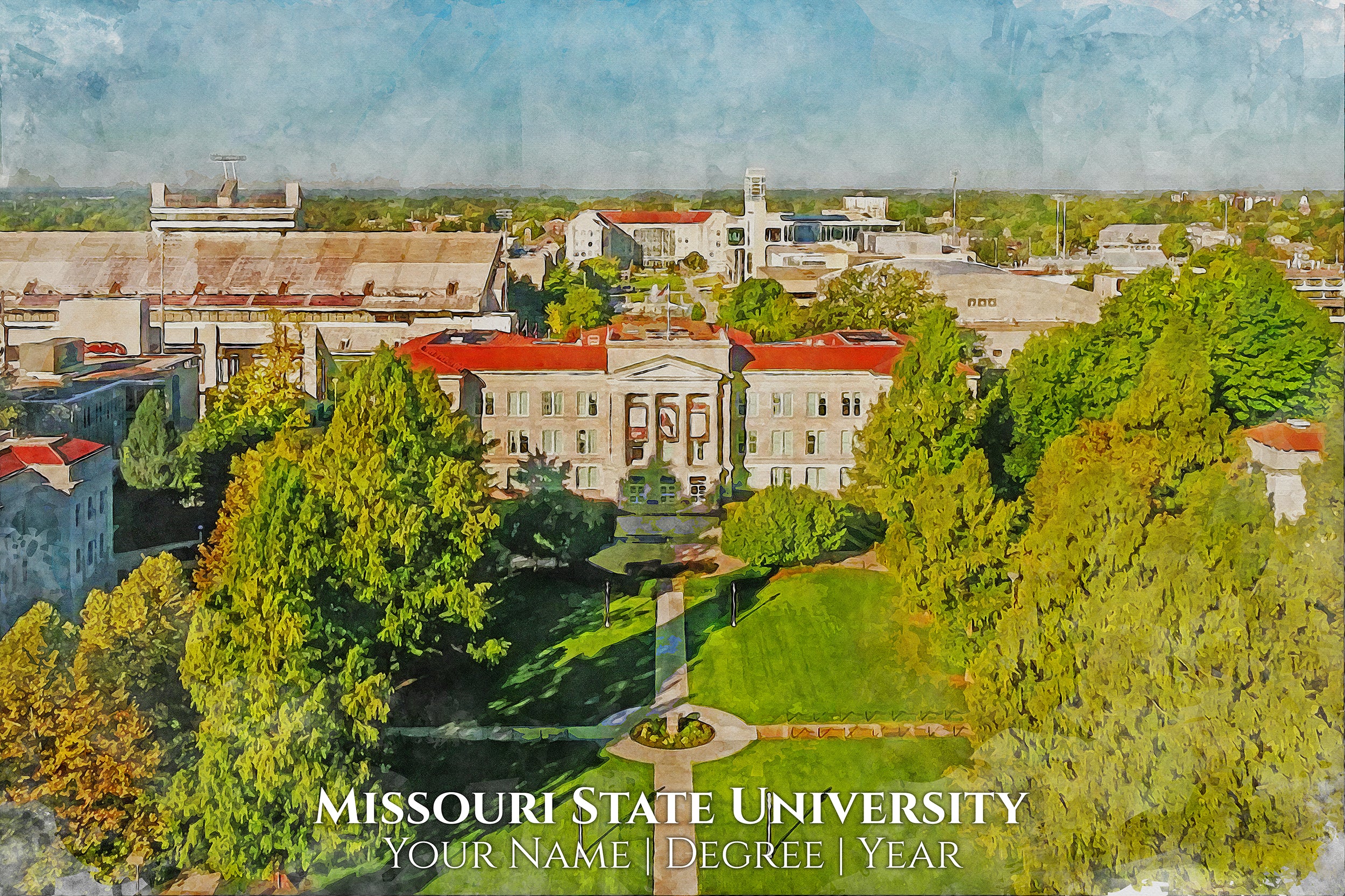 You will love these watercolor digital prints of Missouri State University. Perfect for a graduation gift. These make wonderful gift for Missouri State University Alumni and fans. Feel free to customize it as well when you check out. We will send a proof for you to approve before we print so please check your email about 24hrs after you order