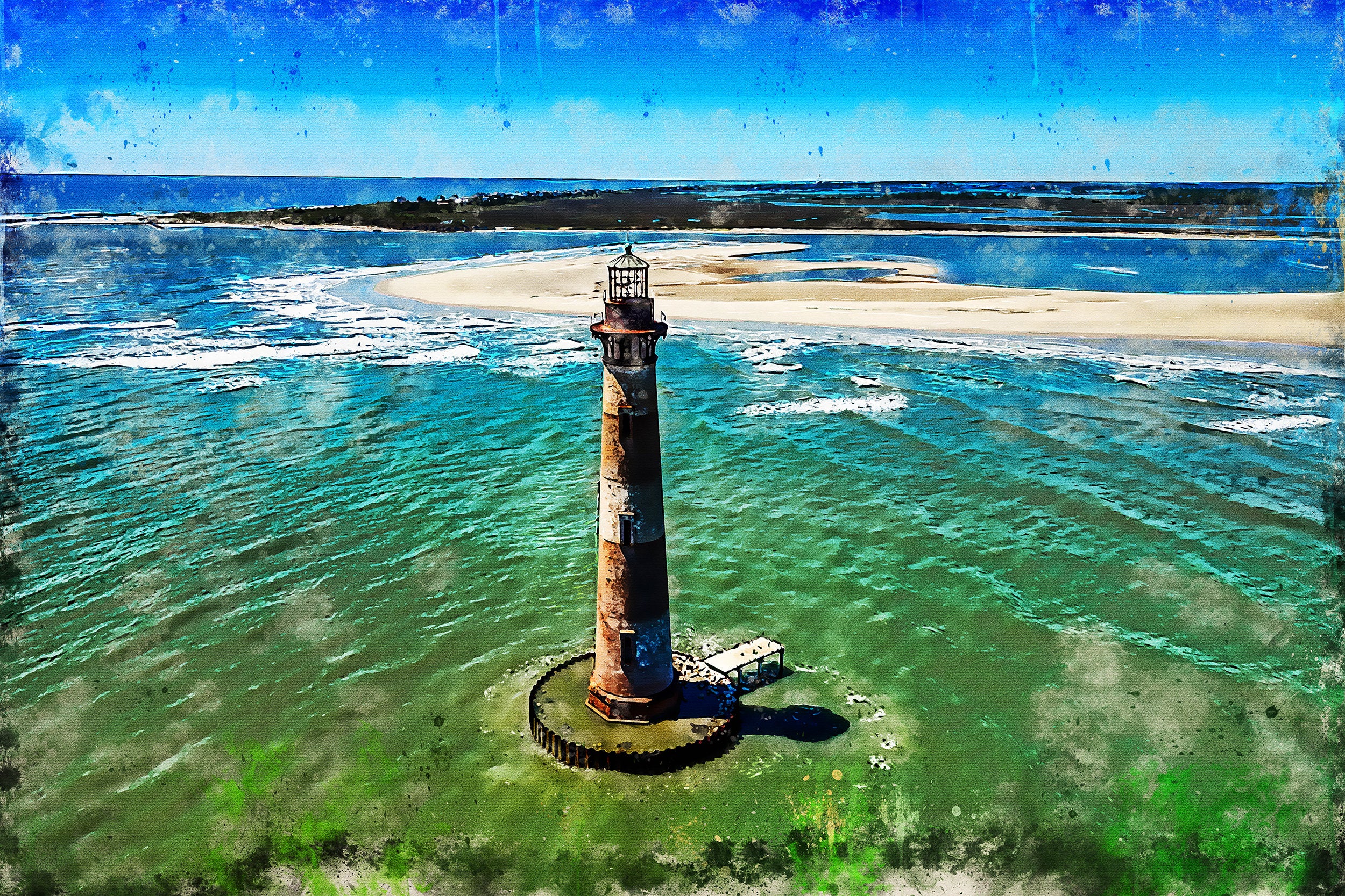 Stunning watercolor of the Morris Island Lighthouse at Folly Beach from the air. Great for a piece of wall art. Available as a single canvas at 16″ x 24″ , 24″ x 36″ , or 32″ x 48″ or we can make you a special 3 panel work of art as large as 4 x 8 foot wide. Folly Beach watercolor