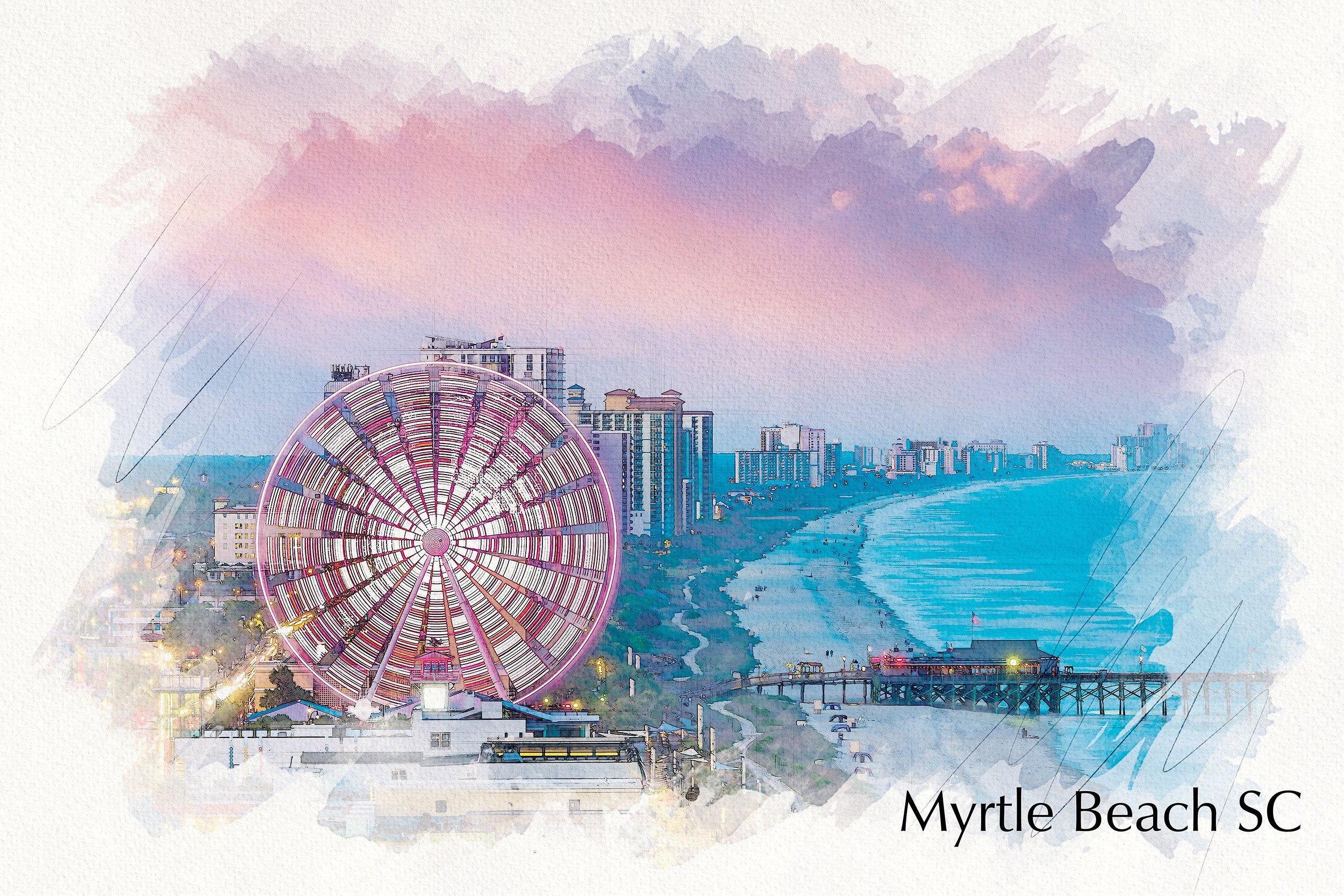 Great watercolor of Myrtle Beach on Canvas. Myrtle Beach watercolor Great for a piece of wall art. Available as a single canvas at 16″ x 24″ , 24″ x 36″ , or 32″ x 48″ or we can make you a special 3 panel work of art or purchase our digital download to print yourself (no product will be sent) South Carolina art
