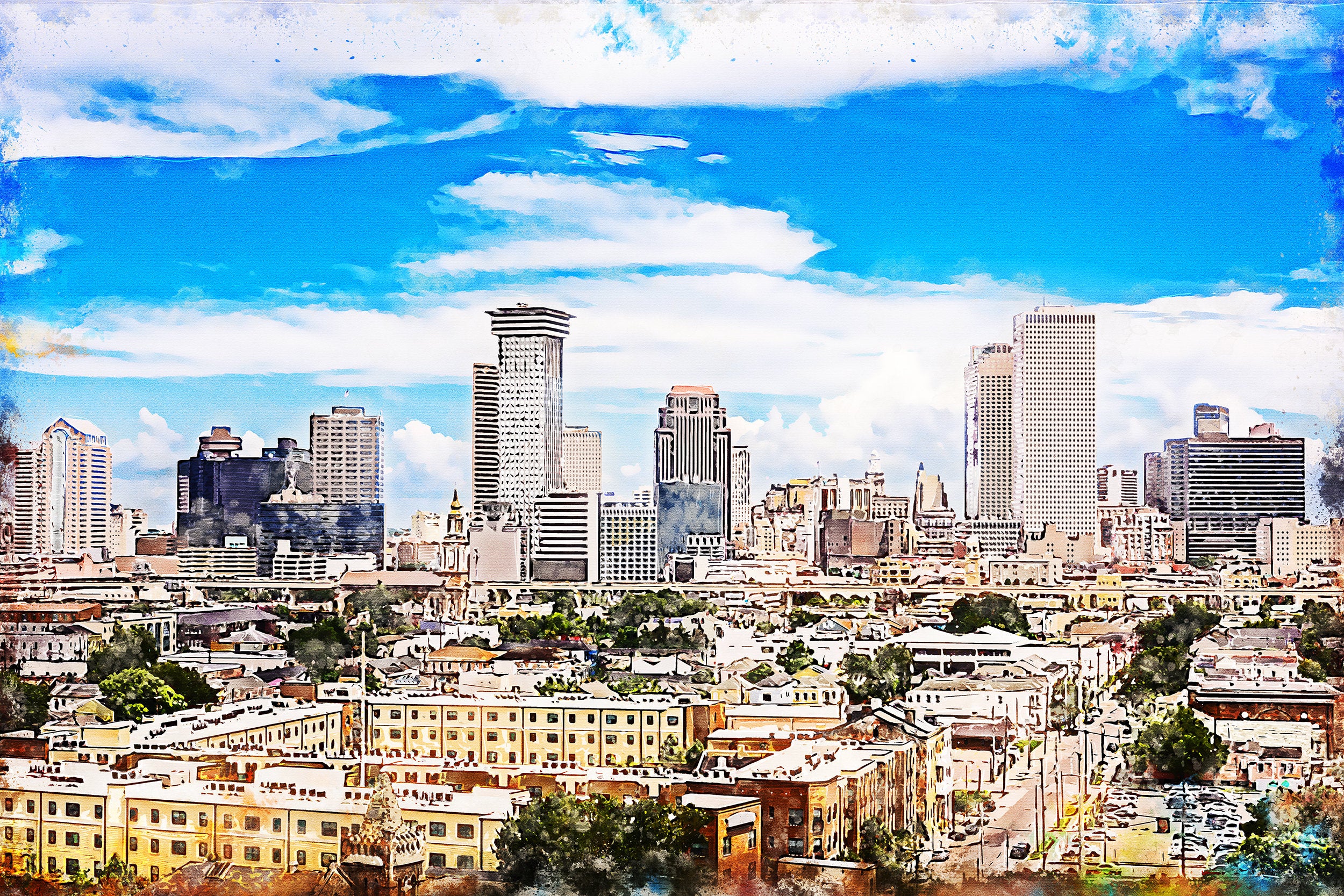 The beautiful skyline of New Orleans on canvas framed and ready to hang. Stunning watercolors that make for the perfect wall decor. New Orleans watercolor