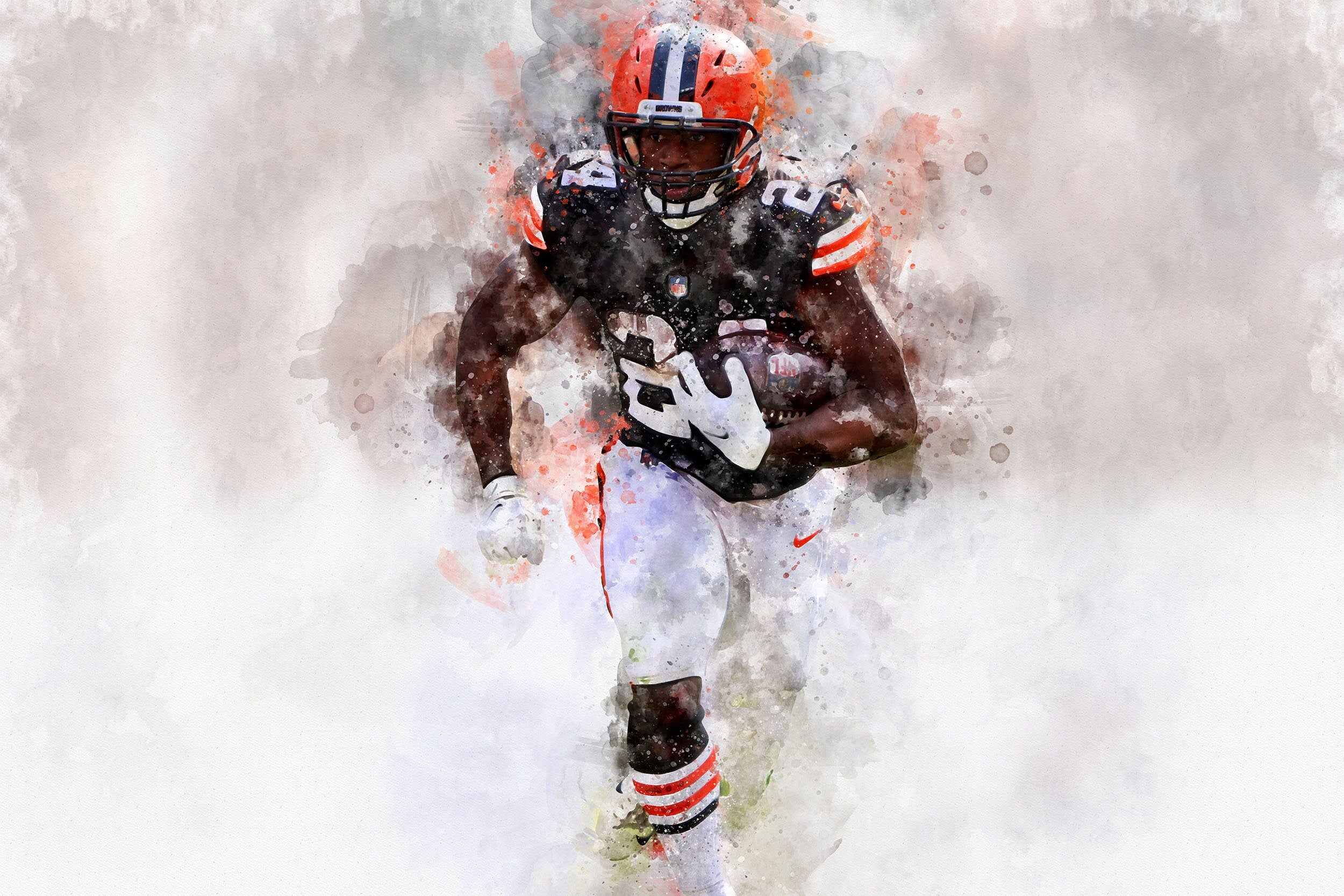 Beautiful watercolor of Nick Chubb playing for the Cleveland Browns