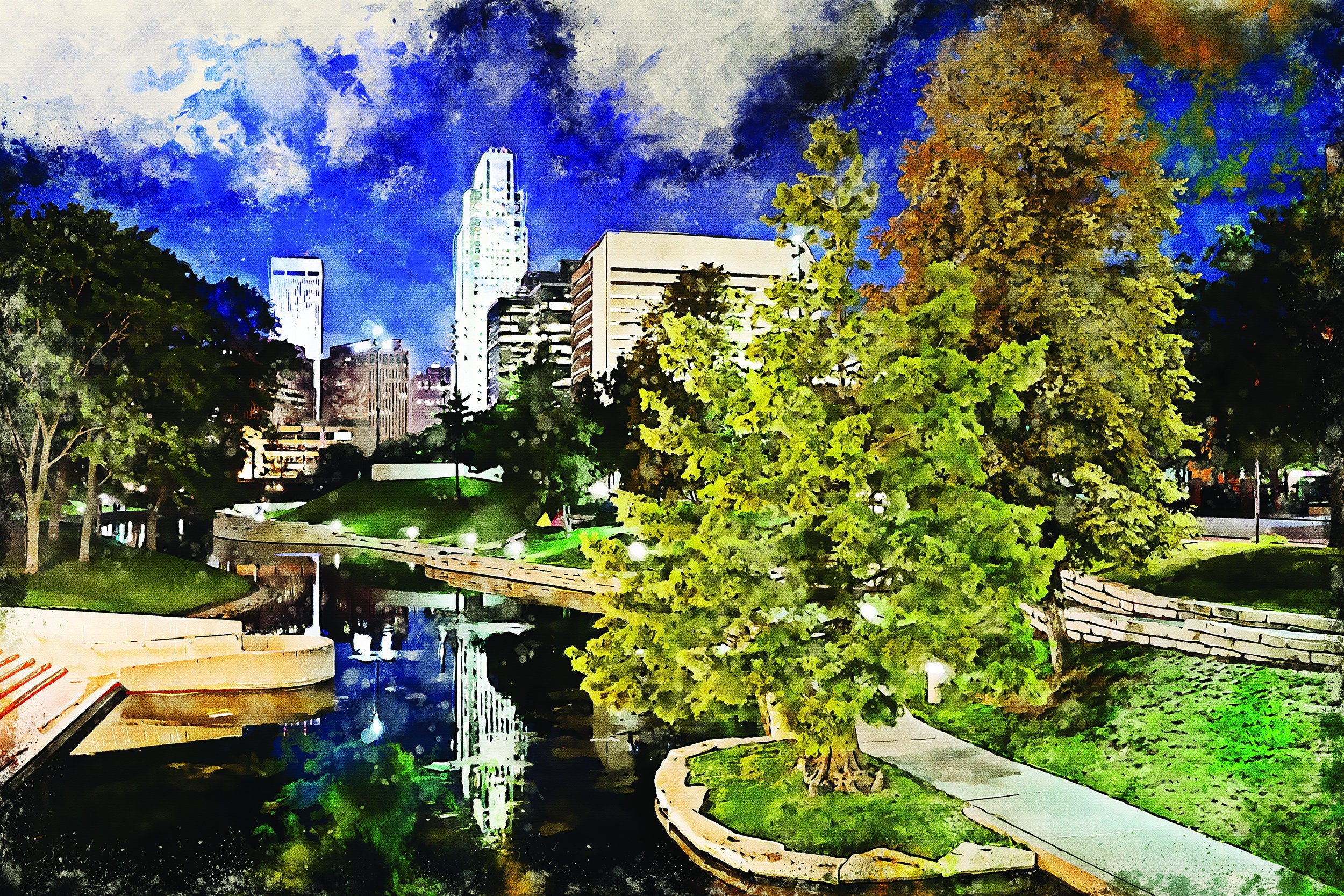 The beautiful watercolor of Omaha Kansas on canvas framed and ready to hang. Stunning colors that make for the perfect wall decor. Omaha Kansas watercolor canvas