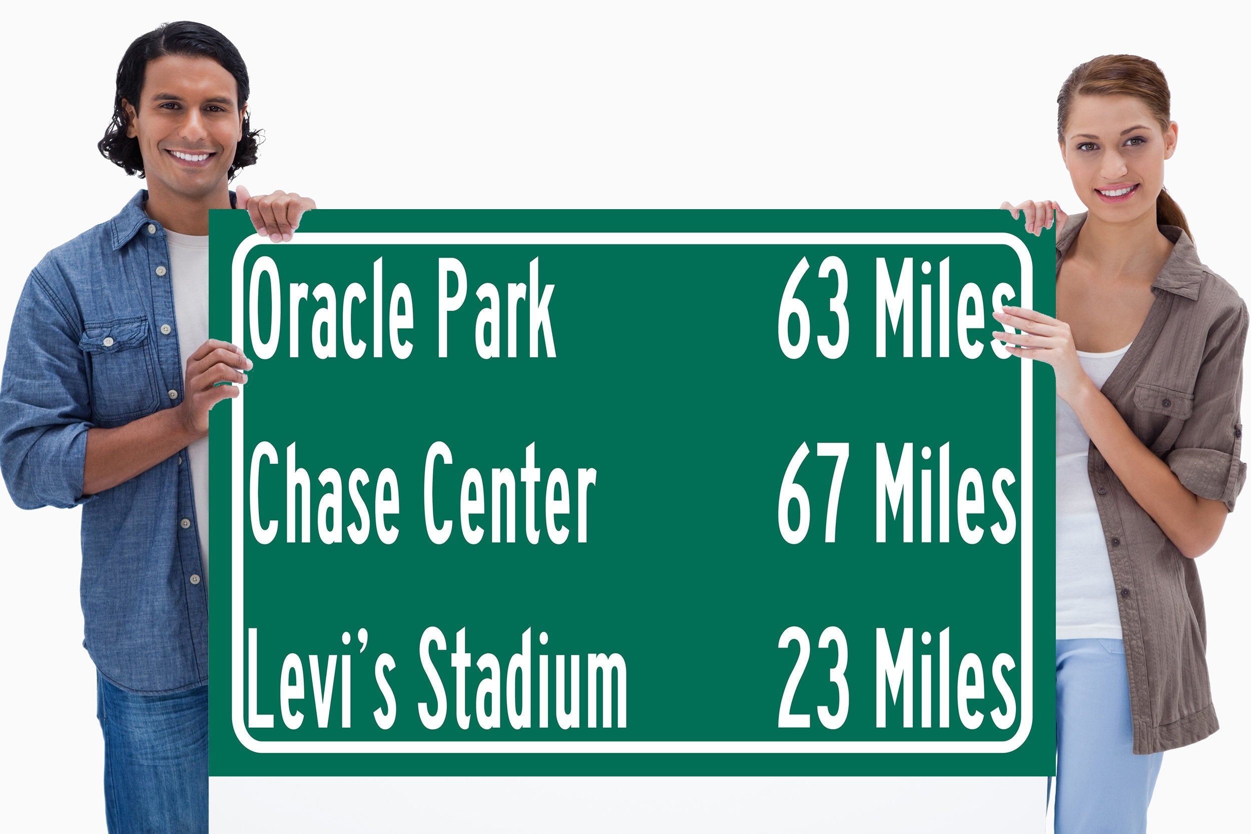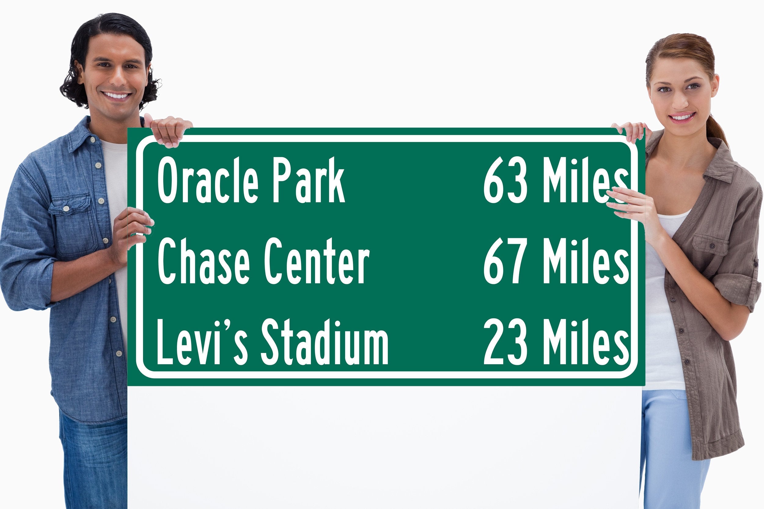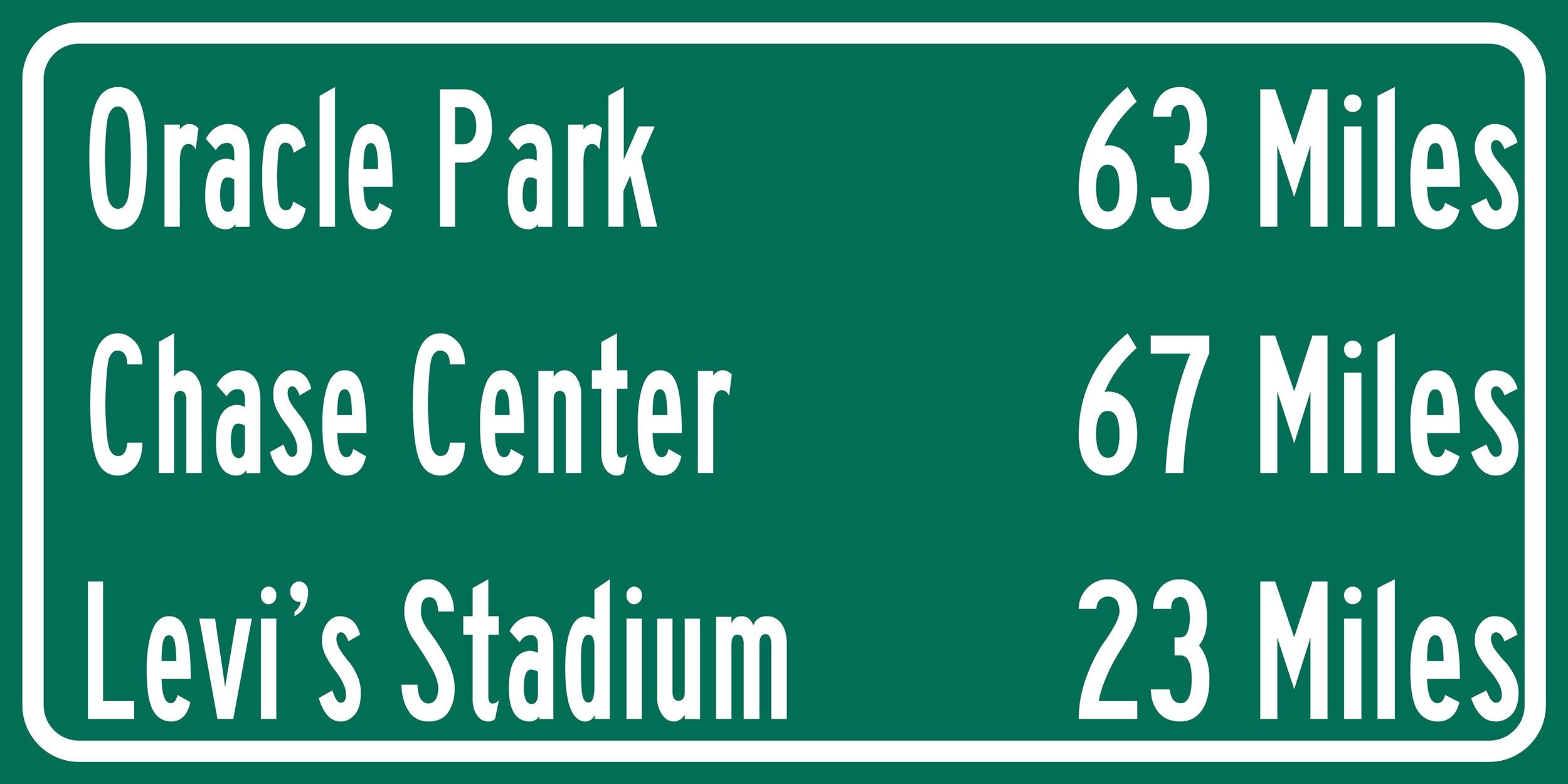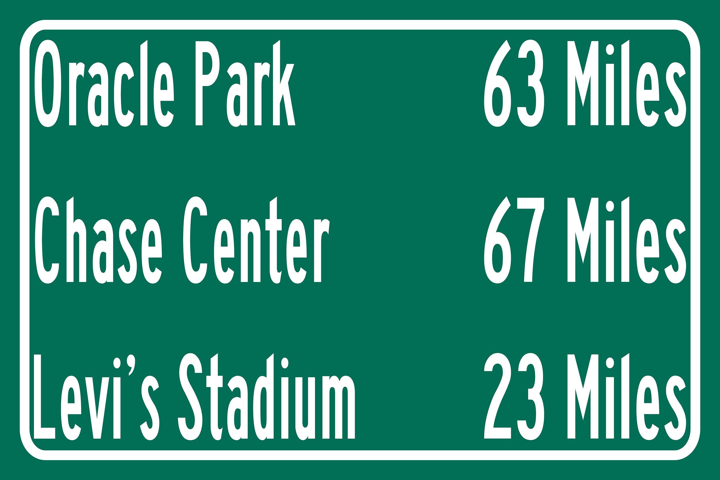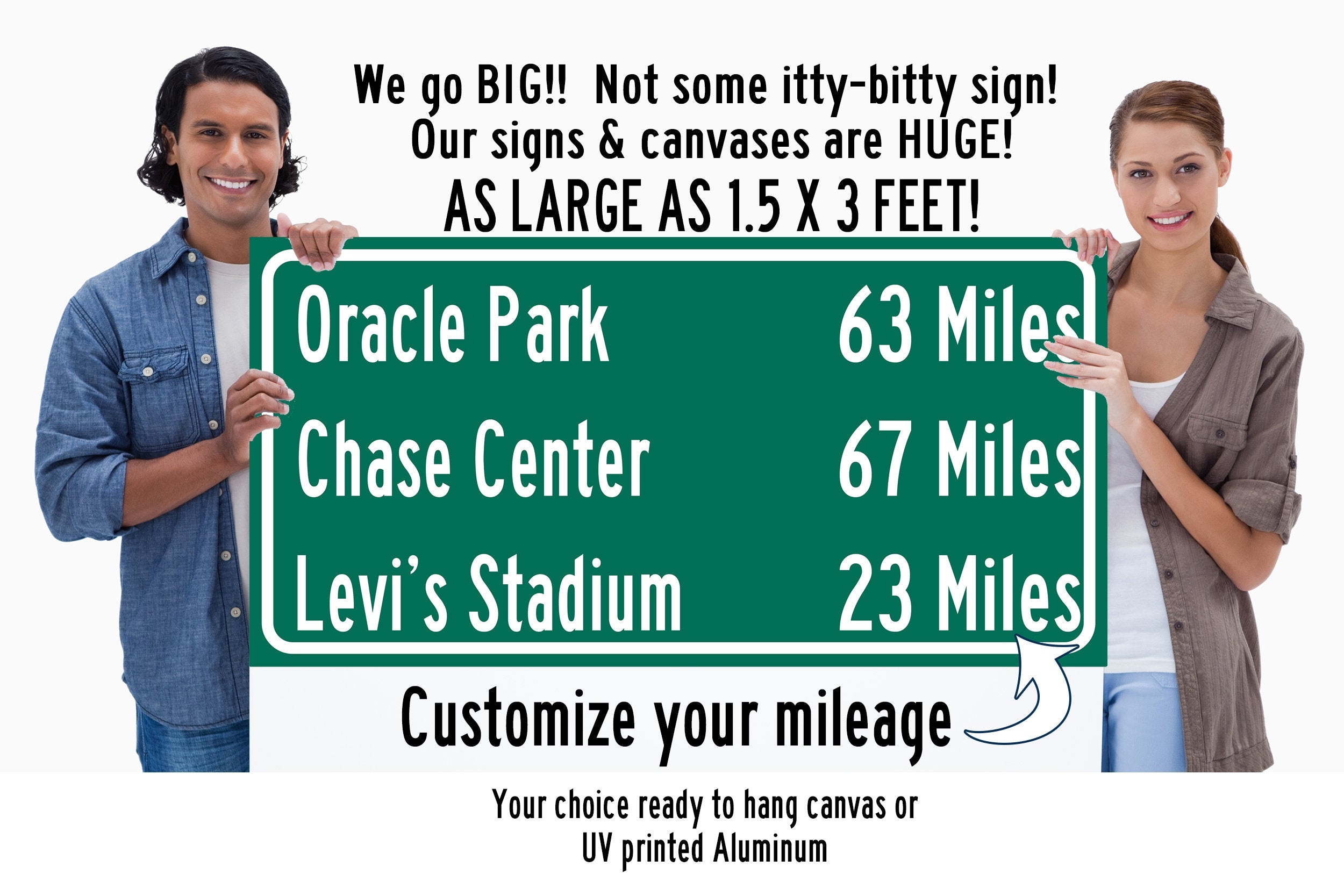 Personalized Highway Distance sign to all the Stadiums, Arenas and Ballparks in San Francisco. Custom replica road sign, of the stadium made with real distance from you to the locations. WE GO HUGE!! Not some itty-bitty sign, Our signs are as large as 2 x 3 FEET! San Francisco Sports Sign, Levi’s Stadium, Oracle Park, Chase Arena