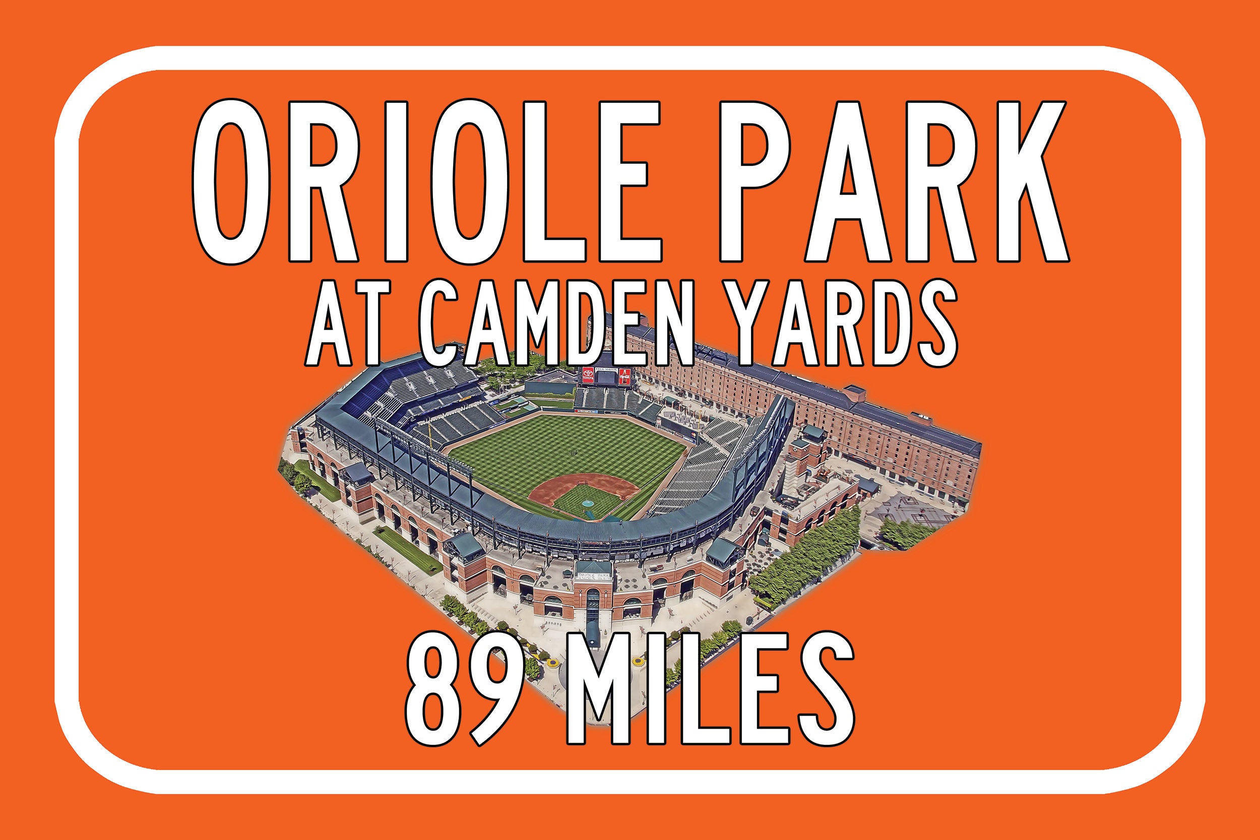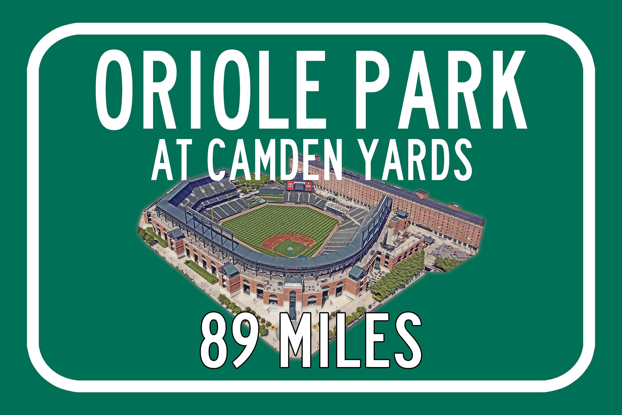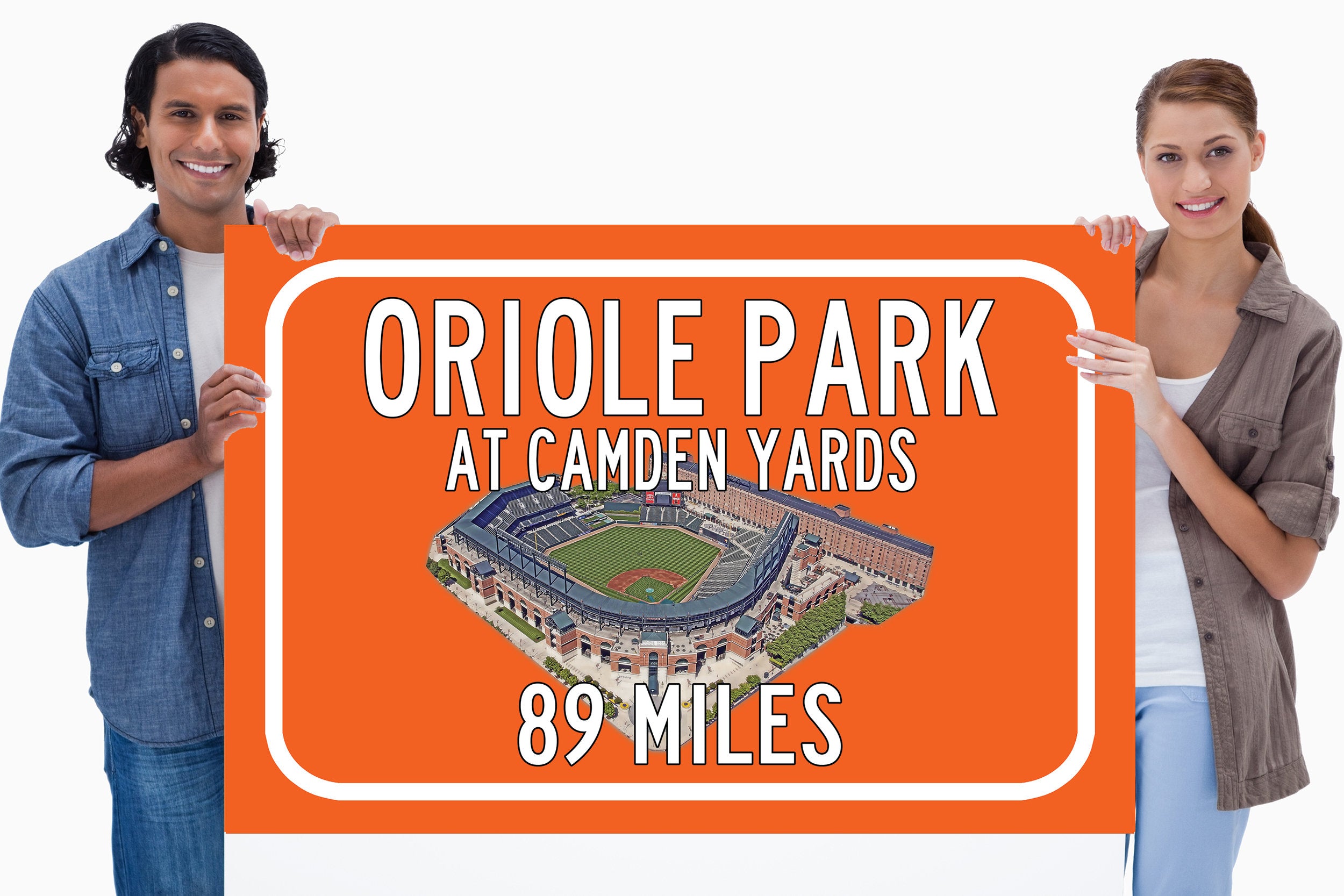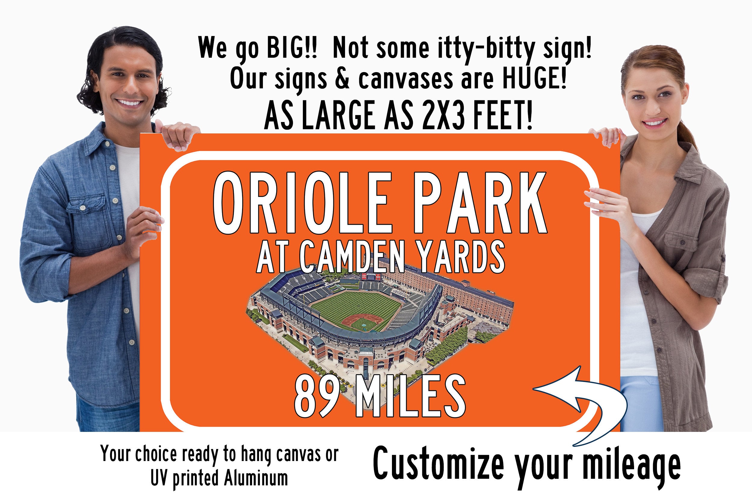 Personalized Highway Distance sign to Oriole Park at Camden Yards in Baltimore. Custom replica road sign, with a watercolor photo of the stadium made with real distance from you to Oriole Park. WE GO HUGE!! Not some itty-bitty sign, Our signs are as large as 2 x 3 FEET! Oriole Park. Baltimore Orioles Sign