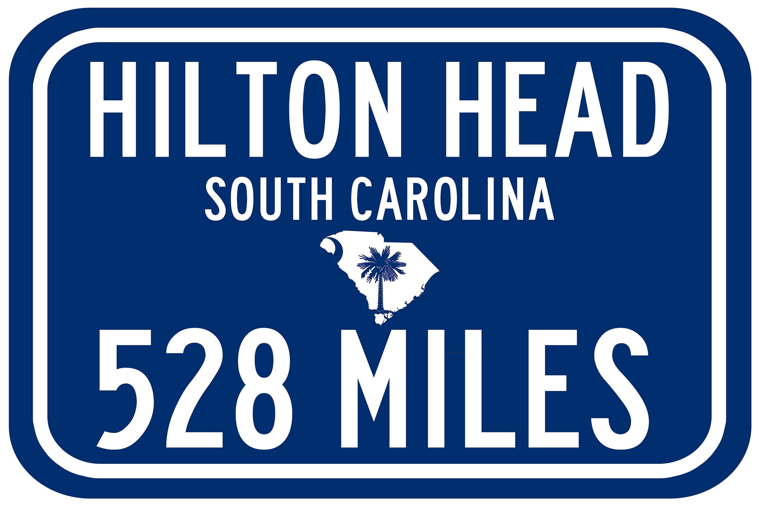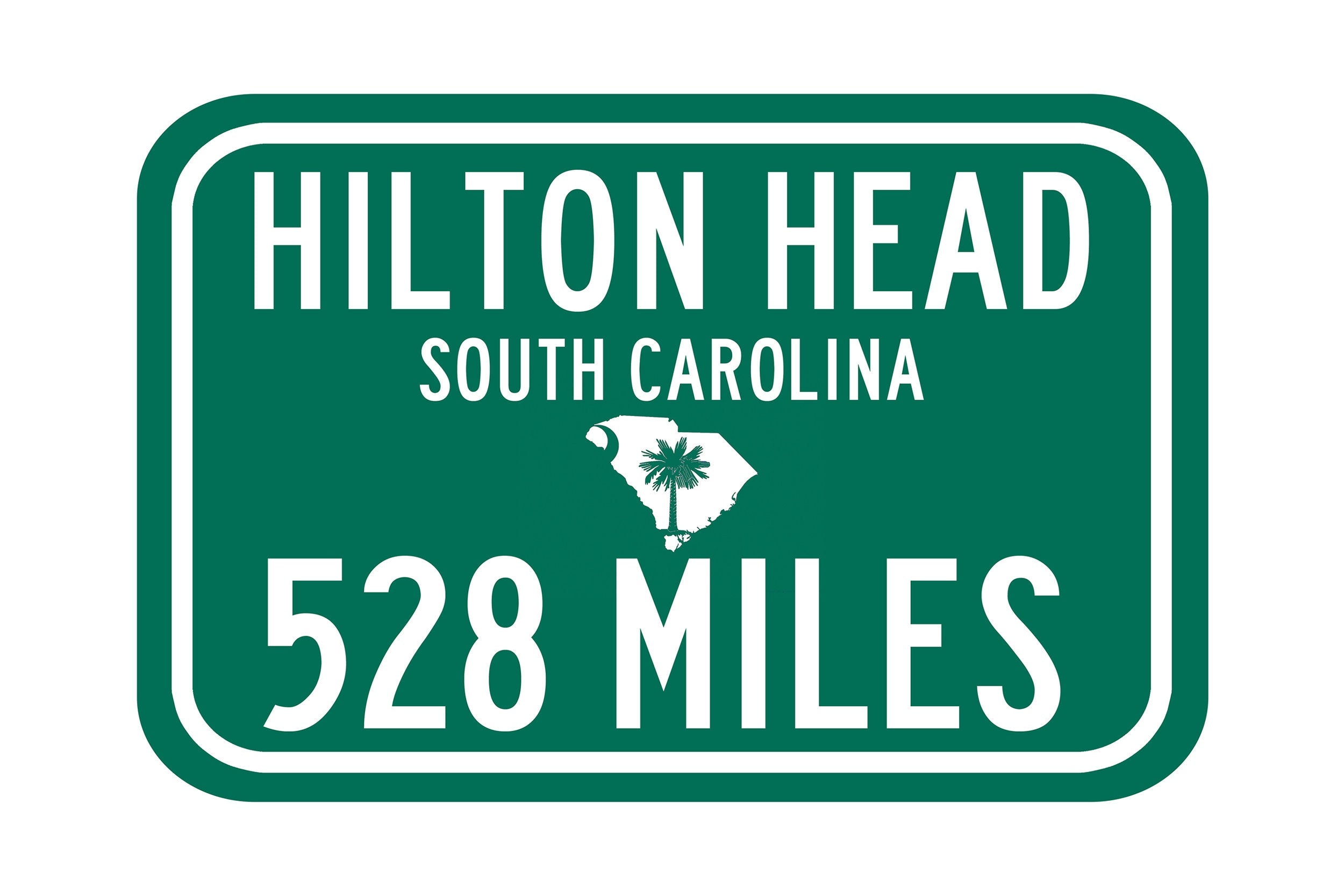Personalized Highway Distance sign to Hilton Head, South Carolina. Custom replica road sign, made with real distance from you to Hilton Head Island. A unique gift for people who vacation in Hilton Head. Works in any home bar, garage, pool area, restaurants and bars, man-cave or she-shed and so much more. Hilton Head Mileage Highway sign
