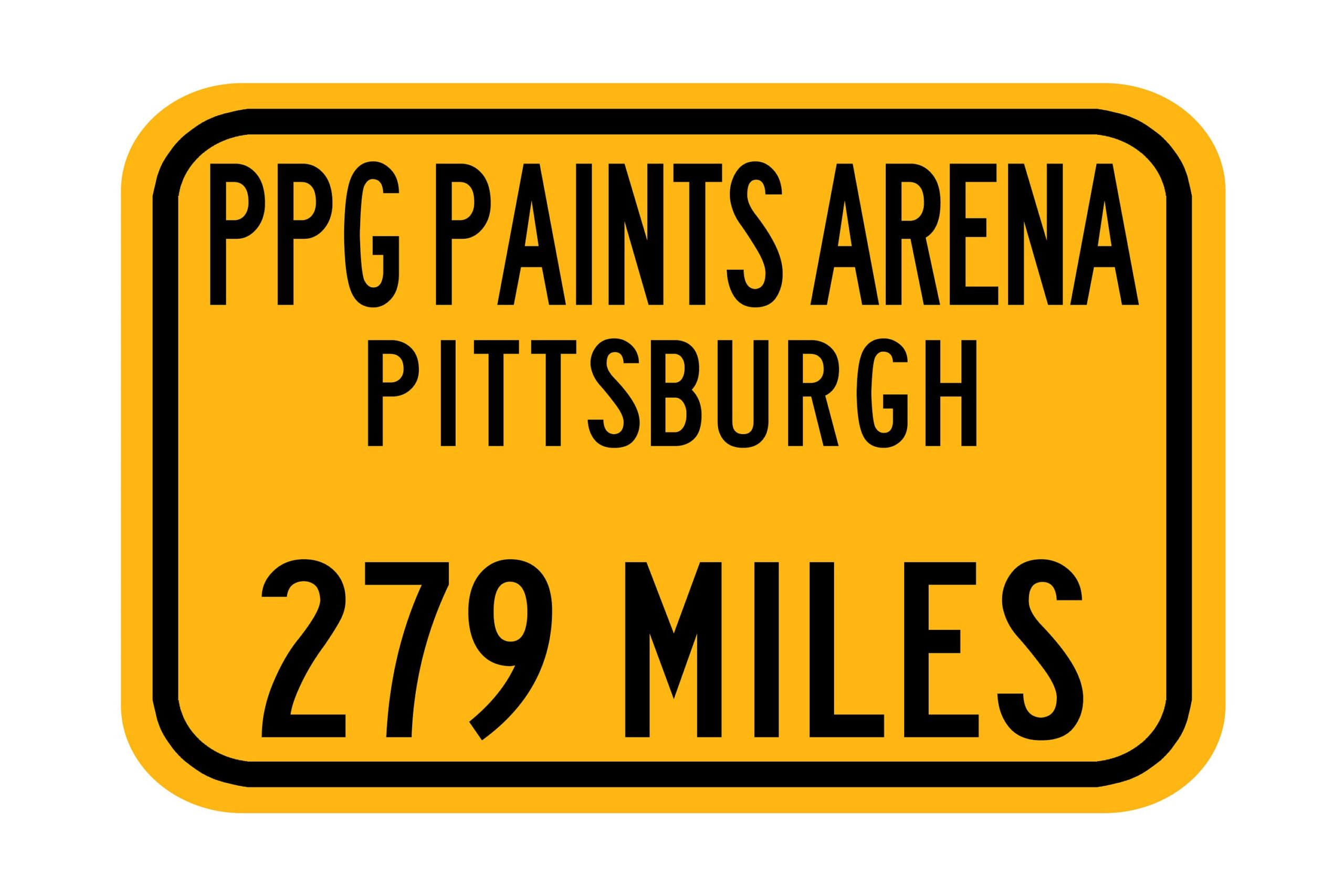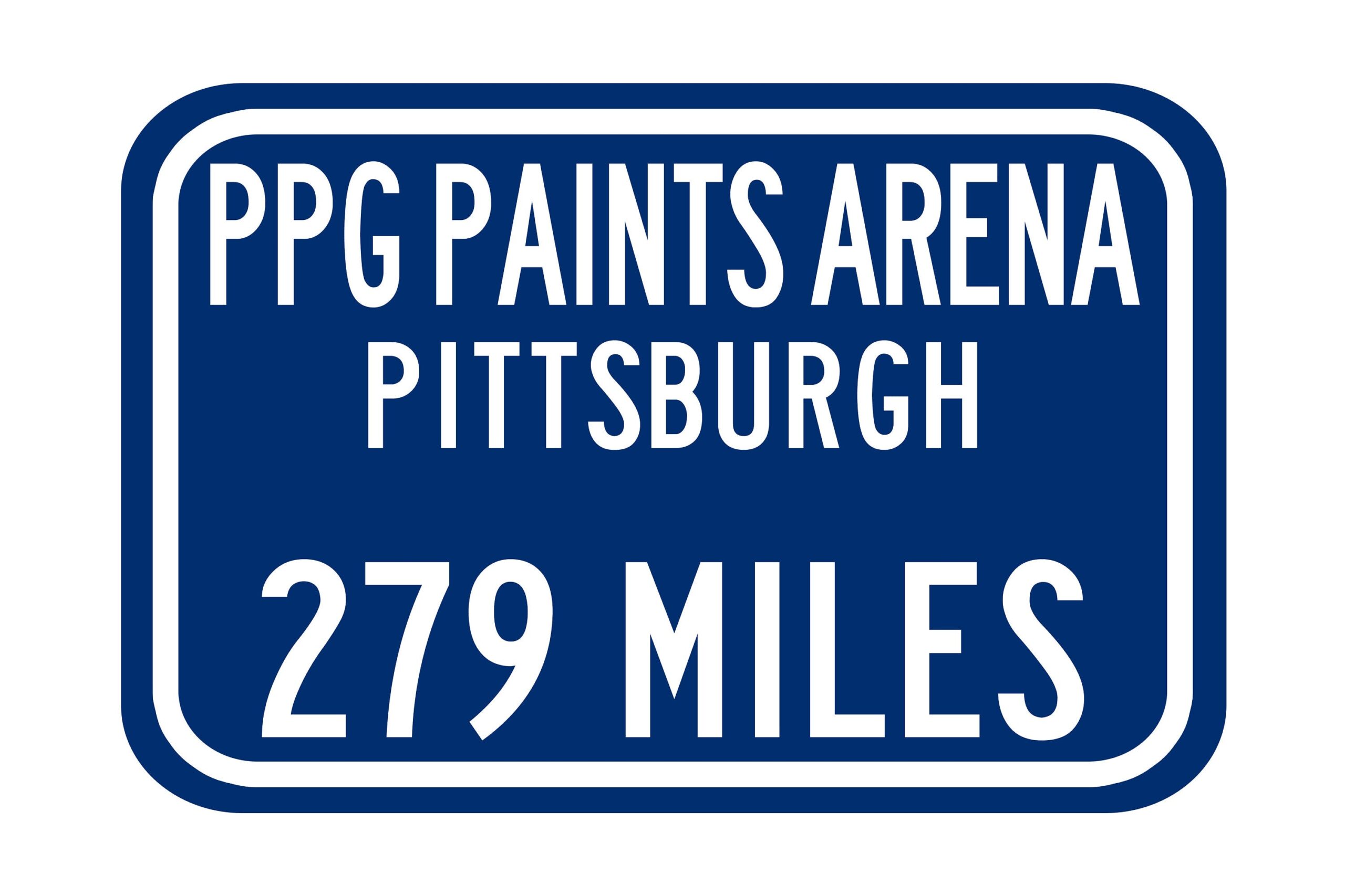 Personalized Highway Distance sign to PPG Paints arena, Pittsburgh Pennsylvania. Custom replica road sign, made with real distance from you to at PPG Paints arena, Pittsburgh Pennsylvania. . A unique gift for people who love the Pittsburg Penguins. Works in any home bar, garage, pool area, restaurants and bars, man-cave or she-shed and so much more.