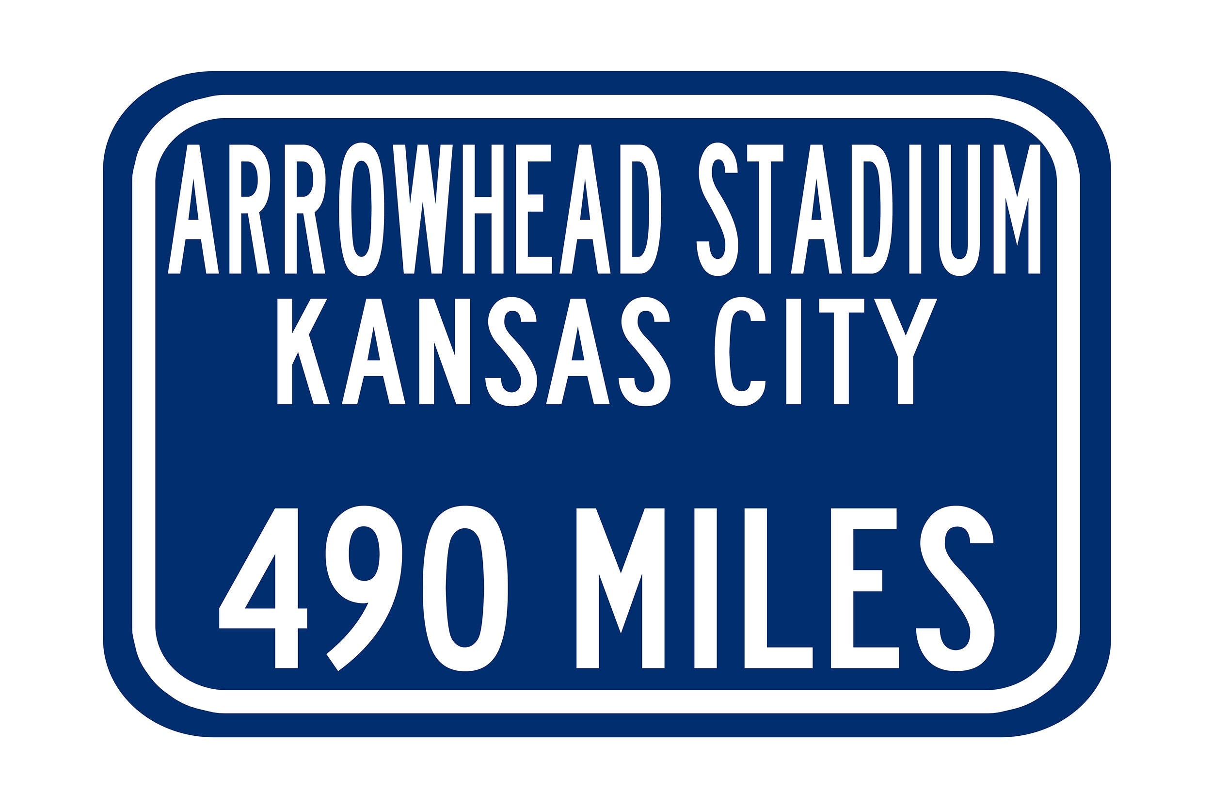 Personalized Highway Distance sign to Arrowhead Stadium, Kansas City. Custom replica road sign, made with real distance from you to Arrowhead Stadium, Kansas City. . A unique gift for people who love the Kansas City Chief. Works in any home bar, garage, pool area, restaurants and bars, man-cave or she-shed and so much more.