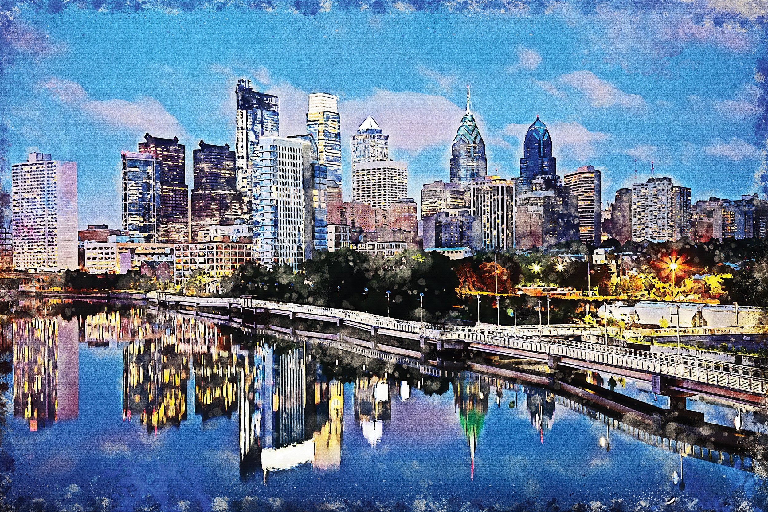 Stunning watercolor of the Philadelphia Pennsylvania skyline from the Schuykill River. Philadelphia watercolor on canvas. Great for a piece of wall art. Available as a single canvas at 16″ x 24″ , 24″ x 36″ , or 32″ x 48″ or we can make you a special 3 panel work of art as large as 4 x 8 foot wide. Digital Download is available and you can print it yourself (no product will be shipped with digital download.
