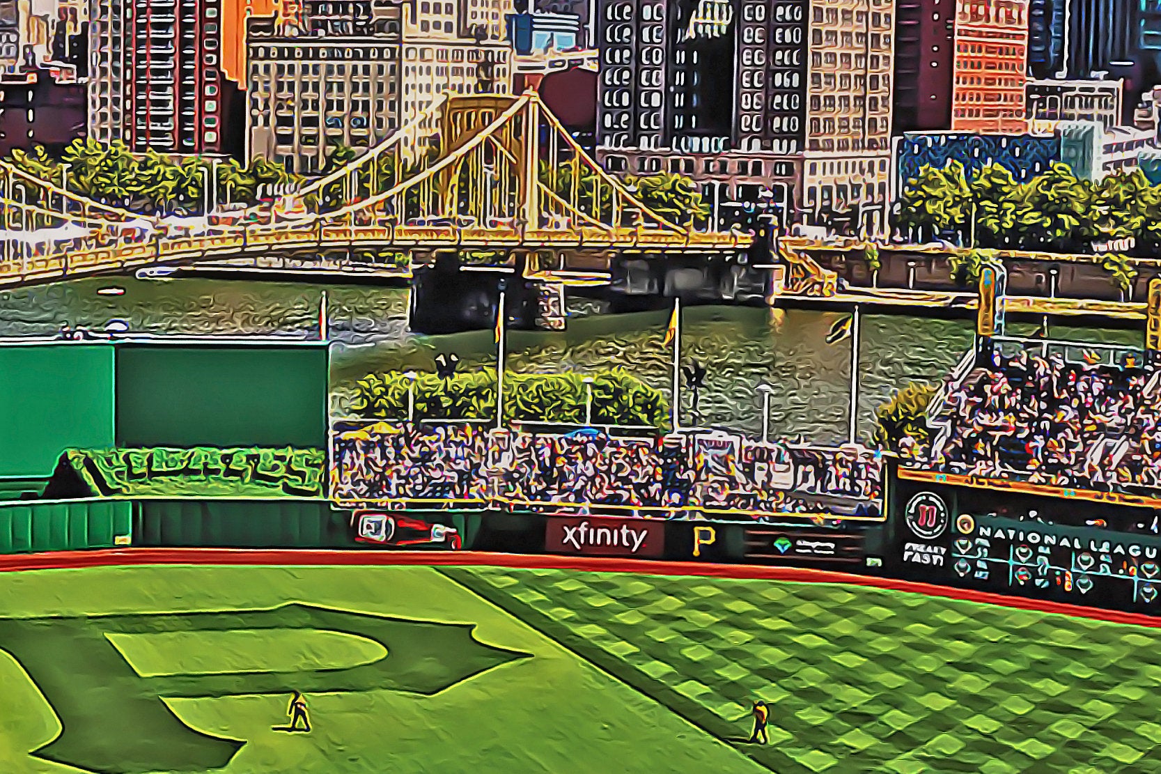 PNC Park in Pittsburgh watercolor. Great colors and plenty of lights. Available as a SINGLE canvas at 12″x18″, 16″ x 24″ , 24″ x 36″ , or 32″ x 48″. Pittsburgh watercolor
