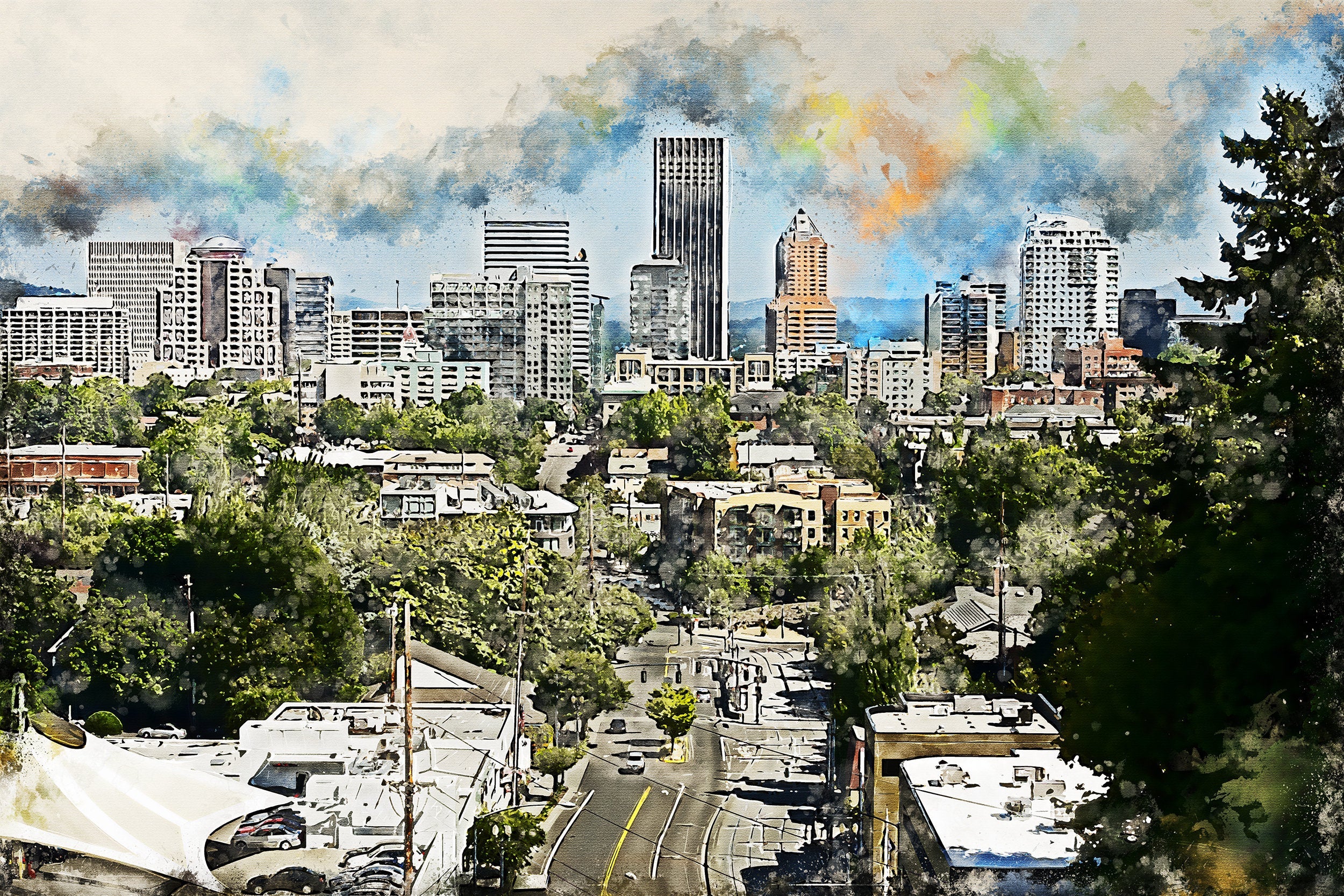 The beautiful watercolor on canvas of Portland Oregon and ready to hang. Stunning colors that make for the perfect wall decor. Portland Oregon watercolor canvas