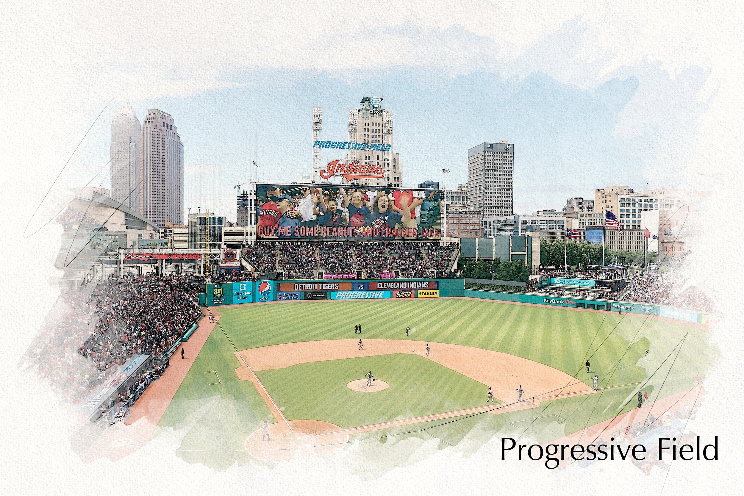 Progressive Field in Cleveland stetch watercolor on canvas. Cleveland Indians Baseball Great for a piece of wall art. Available as a single canvas at 16″ x 24″ , 24″ x 36″ , or 32″ x 48, Cleveland Baseball watercolor