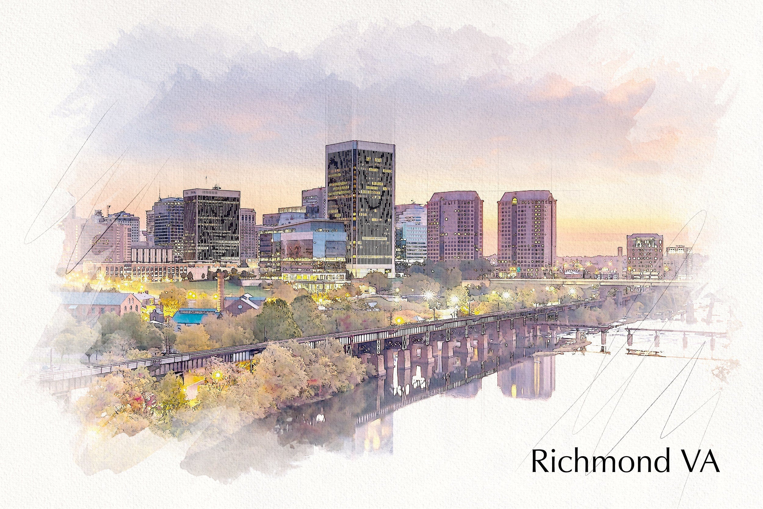 Stunning sketch watercolor of the Richmond skyline and the James river. Richmond watercolor.