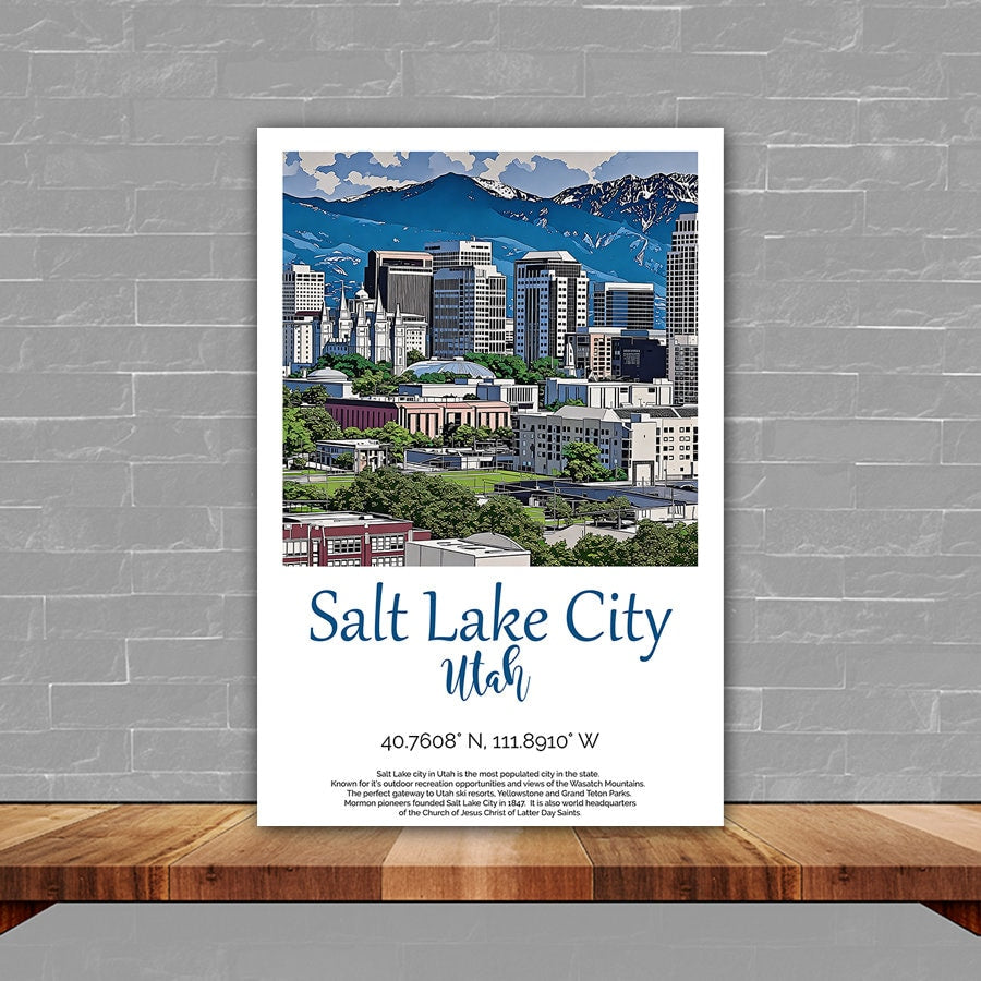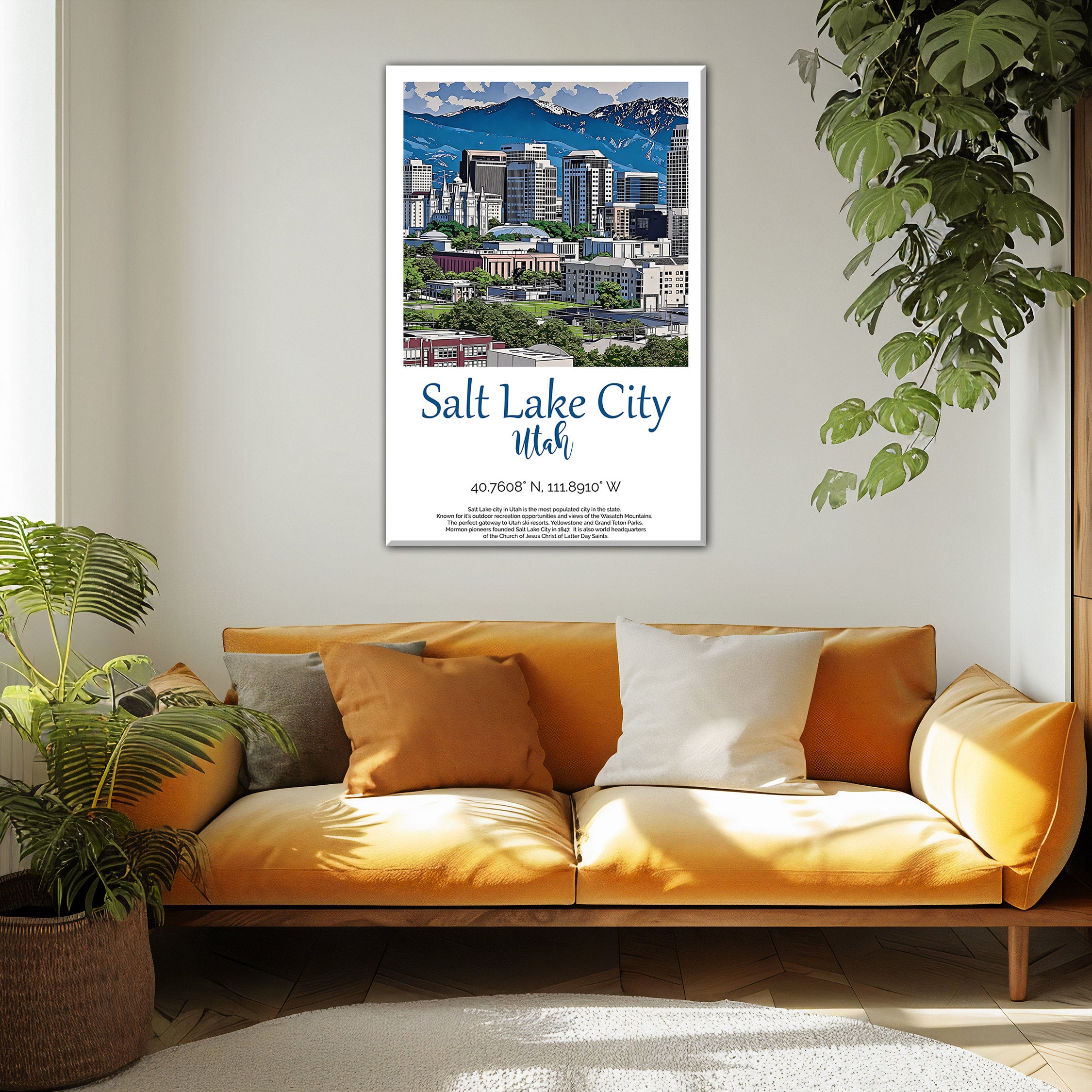 Immerse yourself in the breathtaking beauty of Salt Lake City with this exquisite canvas wrap. Featuring a stunning travel poster design, this Salt Lake City print captures the essence of this vibrant city in every brushstroke. Elevate your space with this wall decor and bring the charm of Salt Lake City into your home.