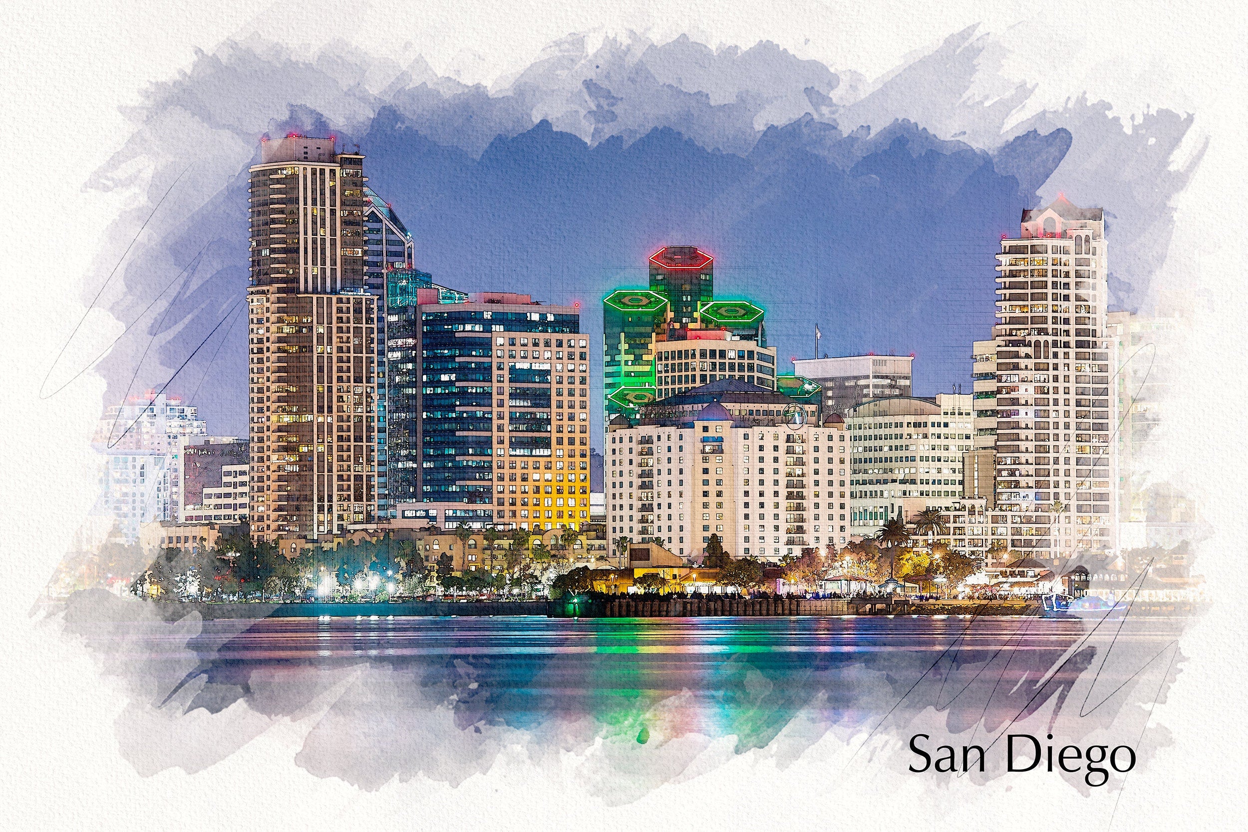 San Diego California watercolor skyline canvas, San Diego watercolor San Diego art, San Diego photo, San Diego wall art, Sketch watercolor