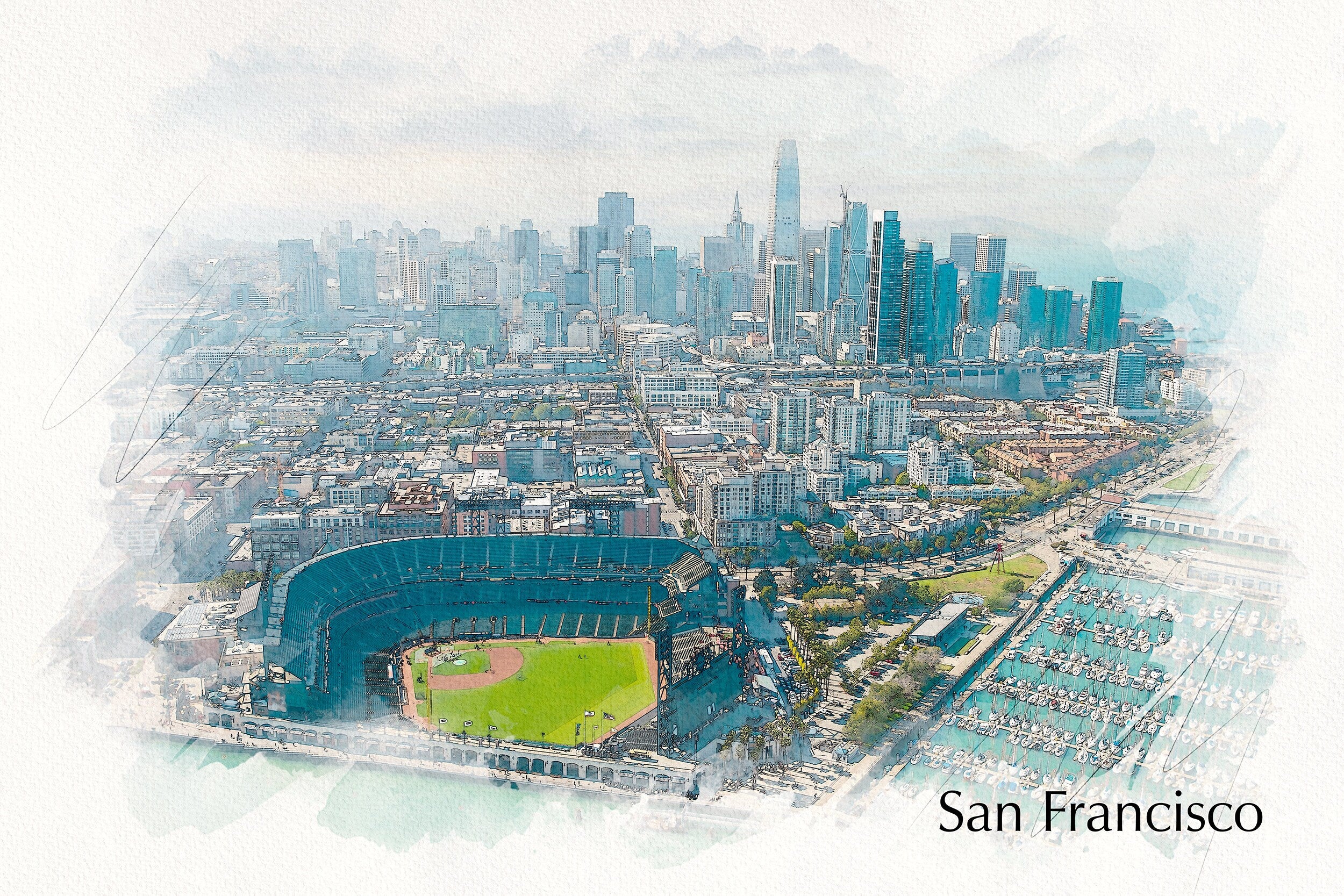 Stunning Photo of the San Francisco skyline including Oracle Park . Great for a piece of wall art. Available as a single canvas at 16″ x 24″ , 24″ x 36″ , or 32″ x 48″ If purchasing the digital image, you only receive a file to print yourself, not an actual print. San Francisco wall art. San Francisco Giants San Francisco watercolor