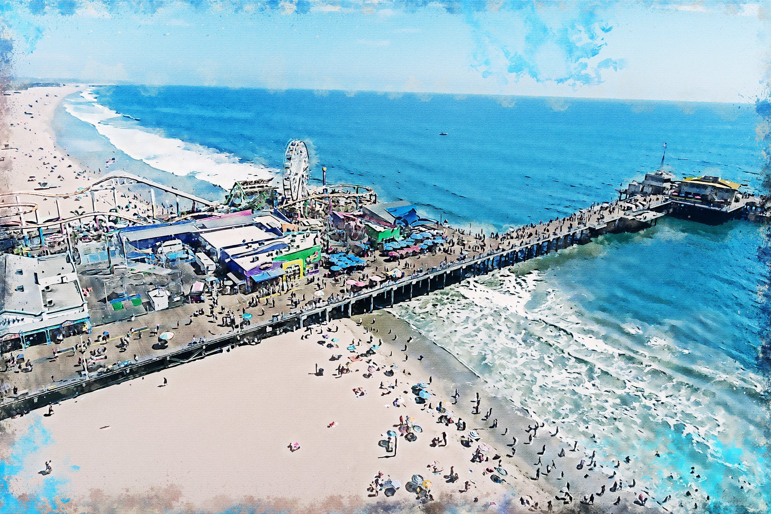 Stunning Watercolor photo of the Santa Monica Pier. Great for a piece of wall art. Available as a single canvas at 16″ x 24″ , 24″ x 36″ , or 32″ x 48″ or we can make you a special 3 panel work of art as large as 4 x 8 foot wide or if you prefer, a digital download and you can print it your self. (no physical product sent)