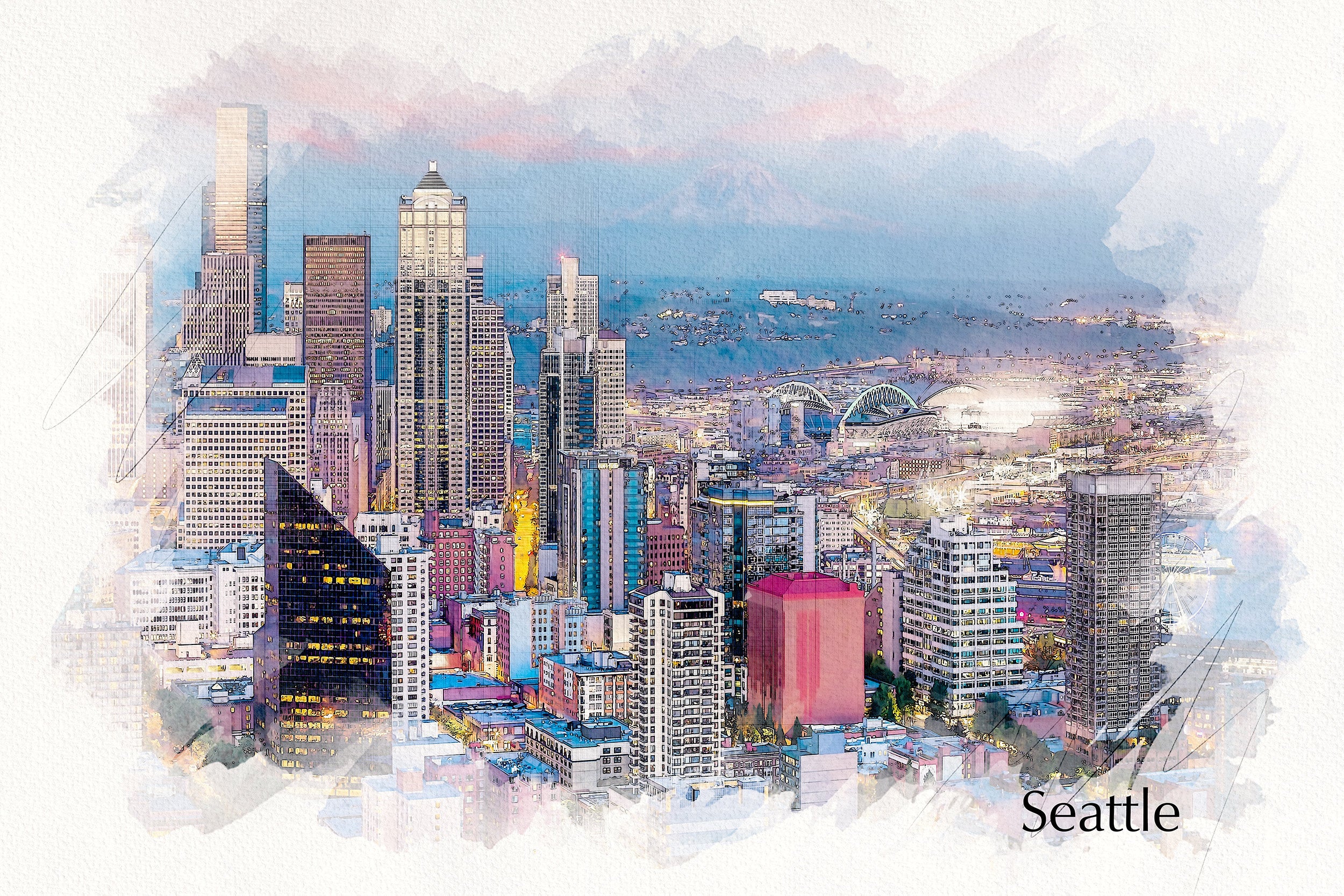 Stunning watercolor of the Seattle skyline. Great for a piece of wall art. Great for a piece of wall art. Available as a single canvas at 16″ x 24″ , 24″ x 36″ , or 32″ x 48″ or we can make you a special 3 panel work of art. Seattle watercolor canvas
