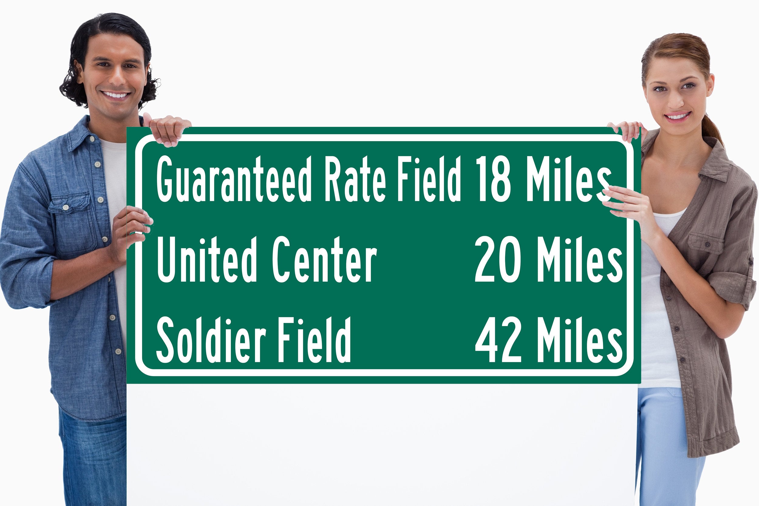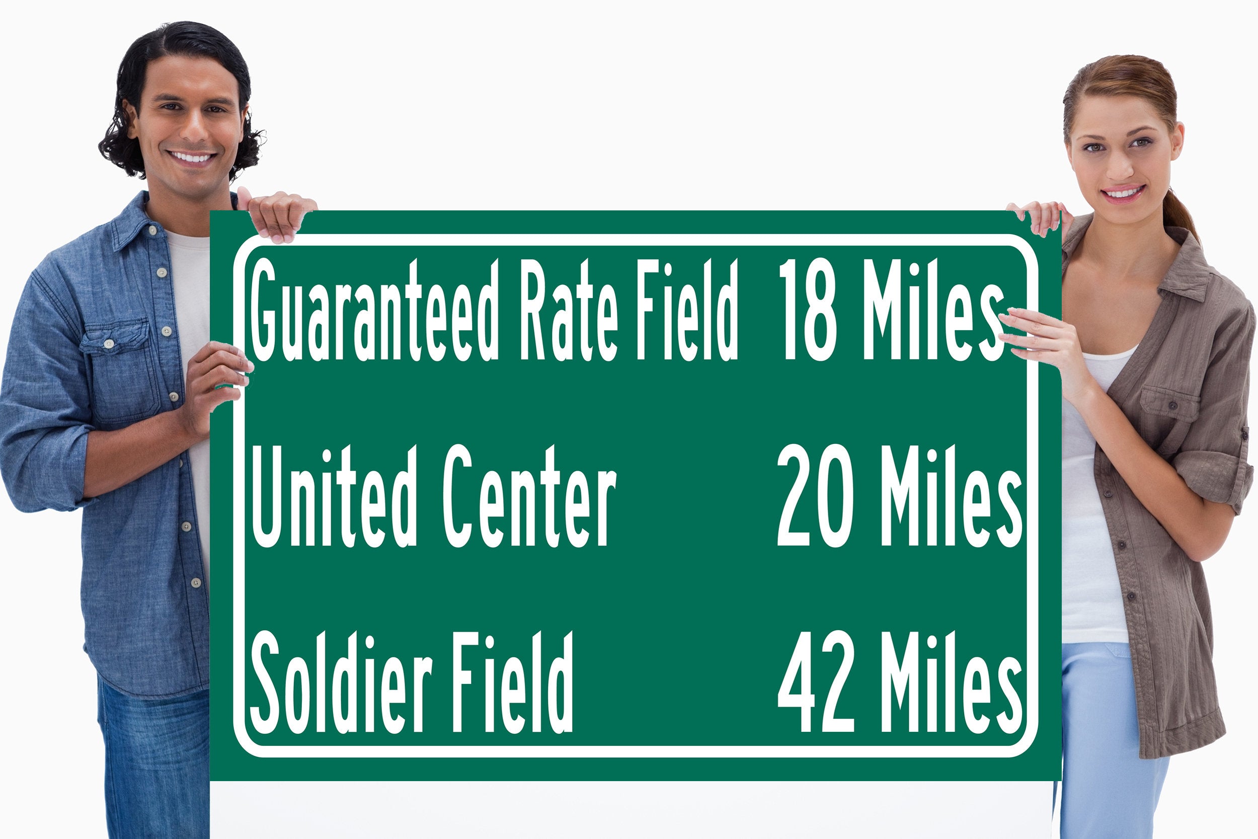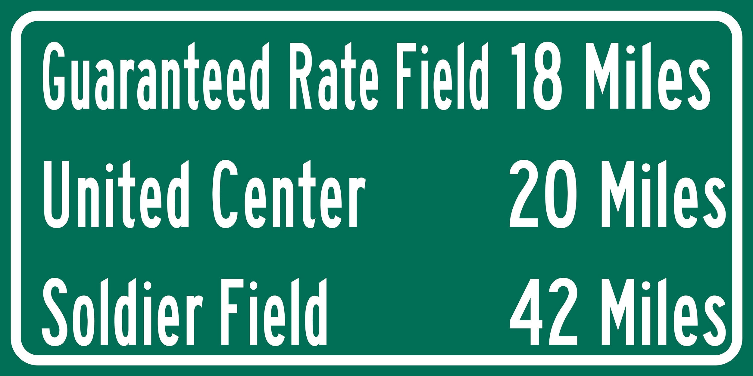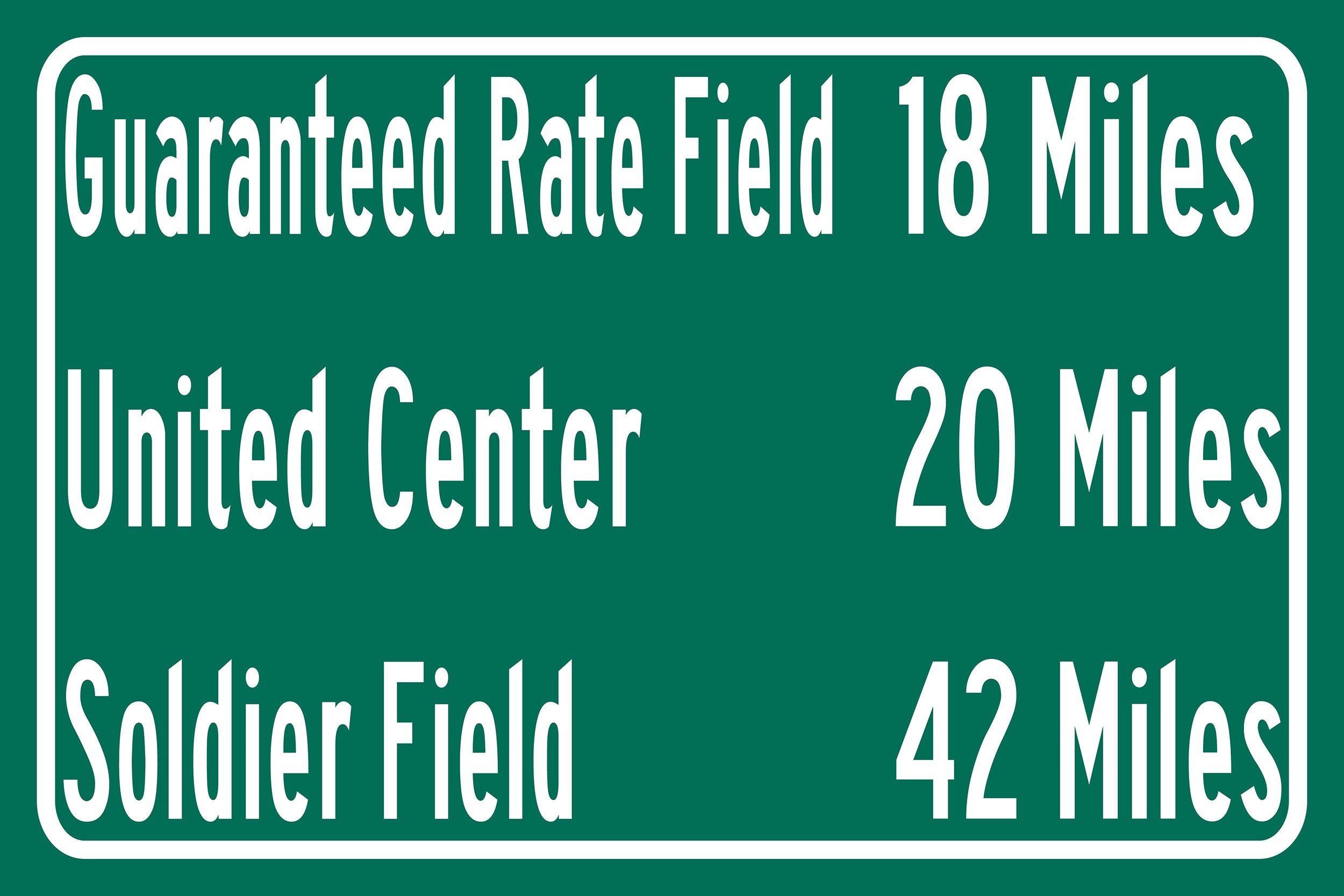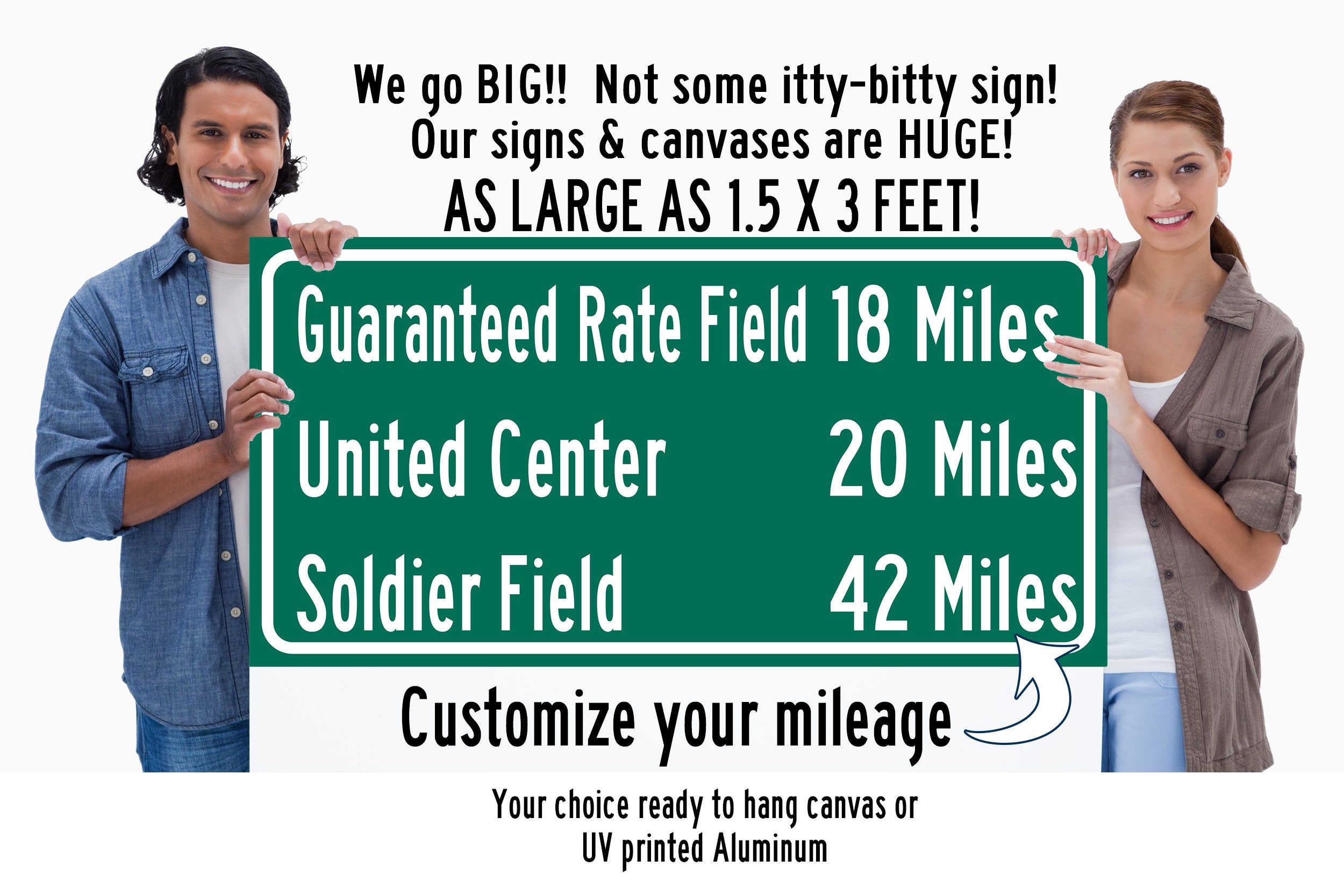 Personalized Highway Distance sign to all the Stadiums, Arenas and Ballparks in Chicago. Custom replica road sign, of the stadium made with real distance from you to the locations. WE GO HUGE!! Not some itty-bitty sign, Our signs are as large as 2 x 3 FEET! Chicago Sports Sign, Soldier Field, United Center, Guaranteed Rate Field
