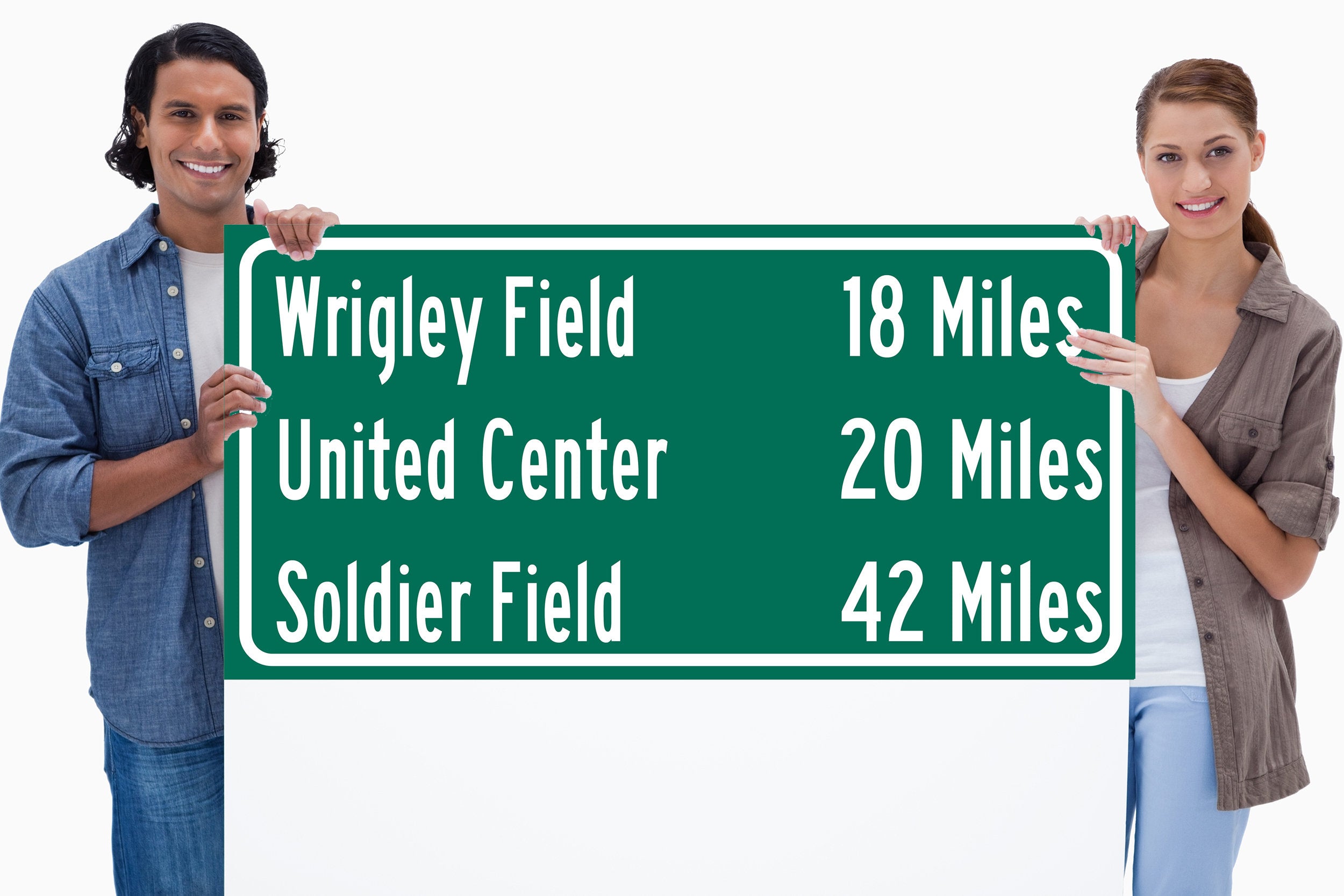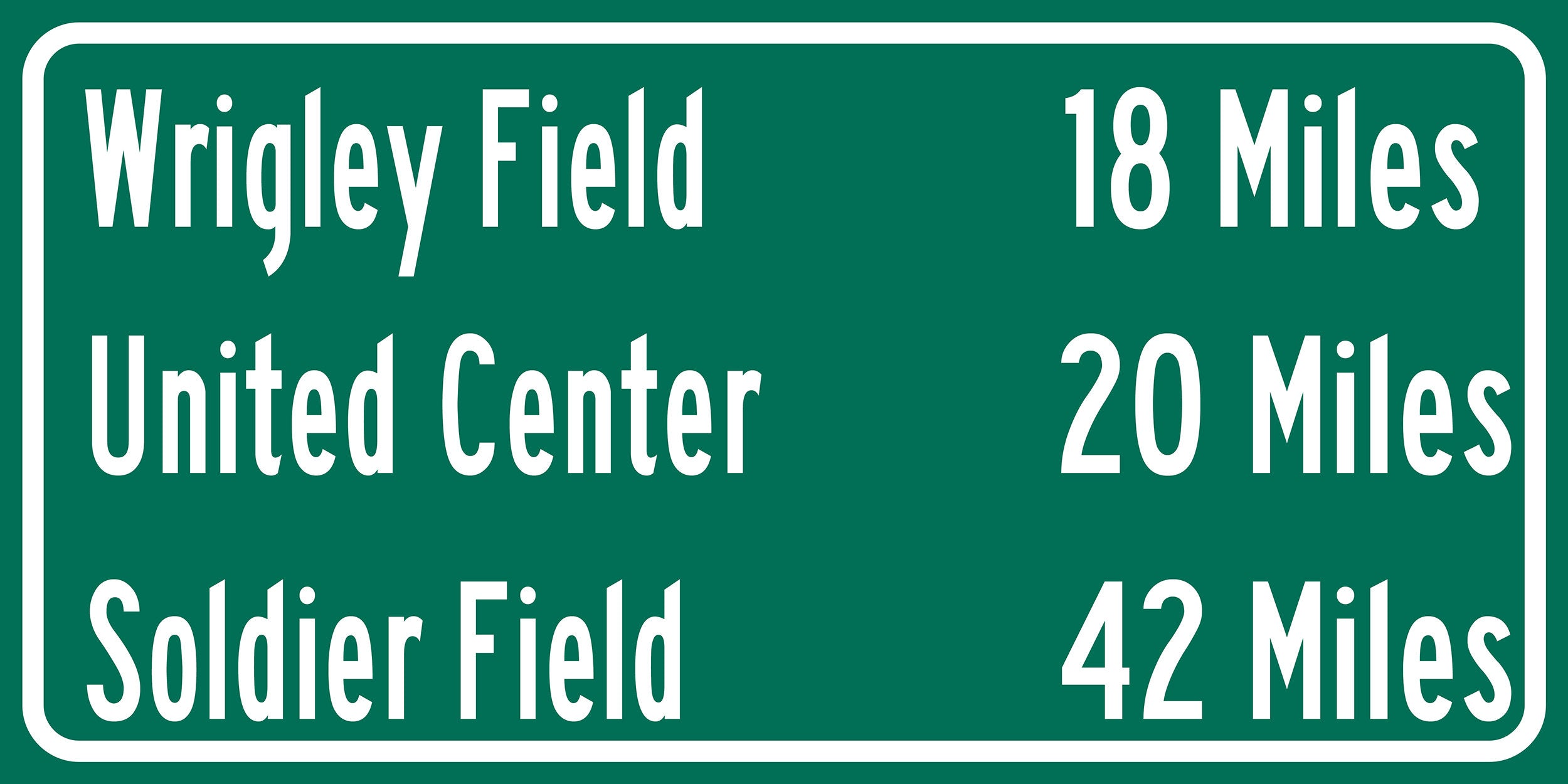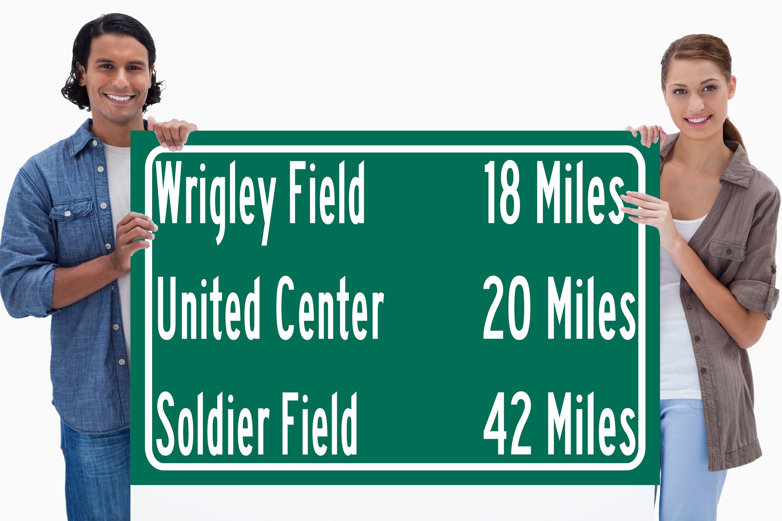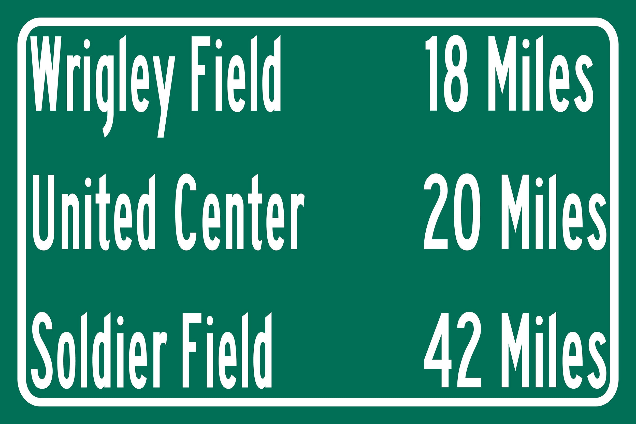 Personalized Highway Distance sign to all the Stadiums, Arenas and Ballparks in Chicago. Custom replica road sign, of the stadium made with real distance from you to the locations. WE GO HUGE!! Not some itty-bitty sign, Our signs are as large as 2 x 3 FEET! Chicago Sports Sign, Soldier Field, United Center, Wrigley Field