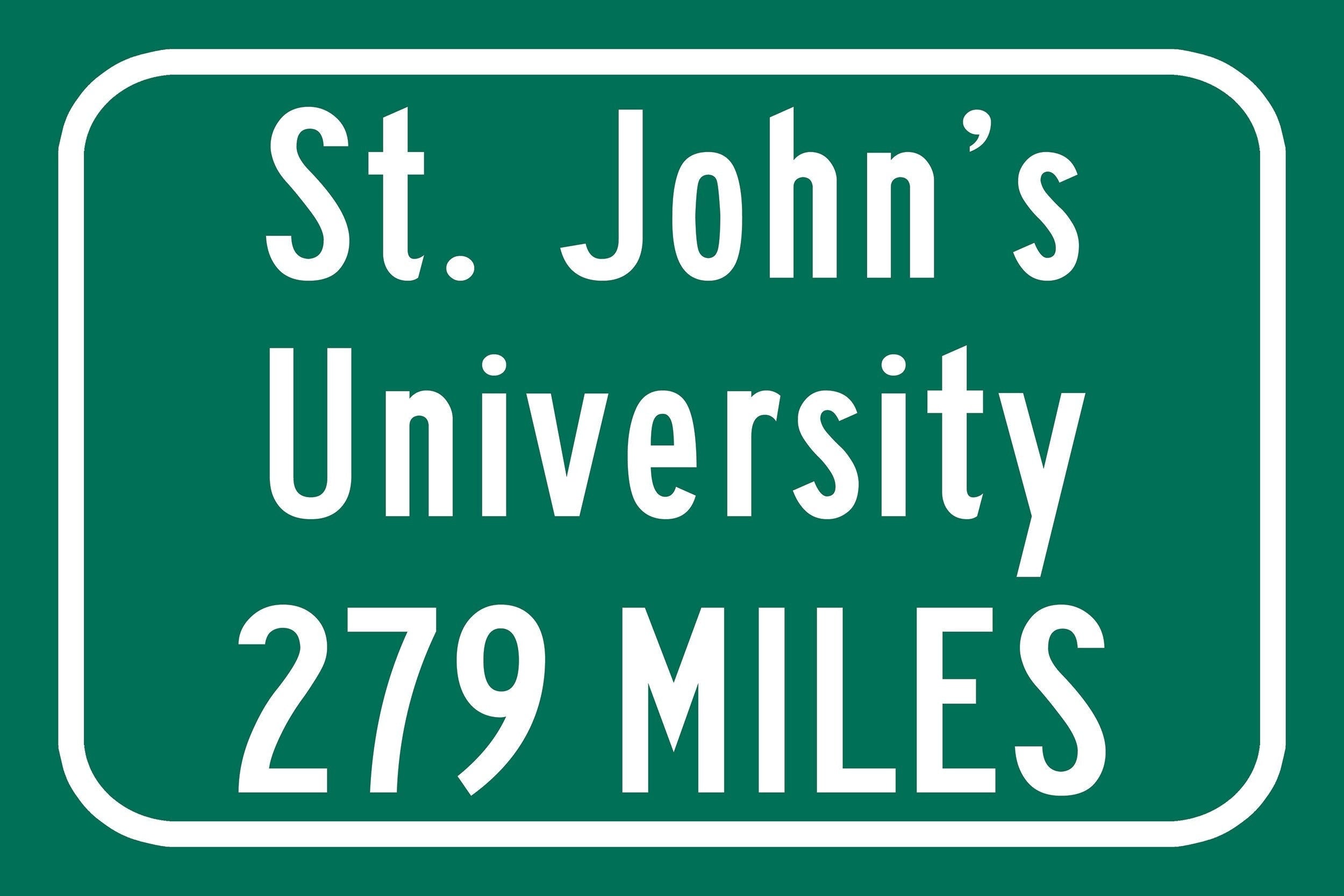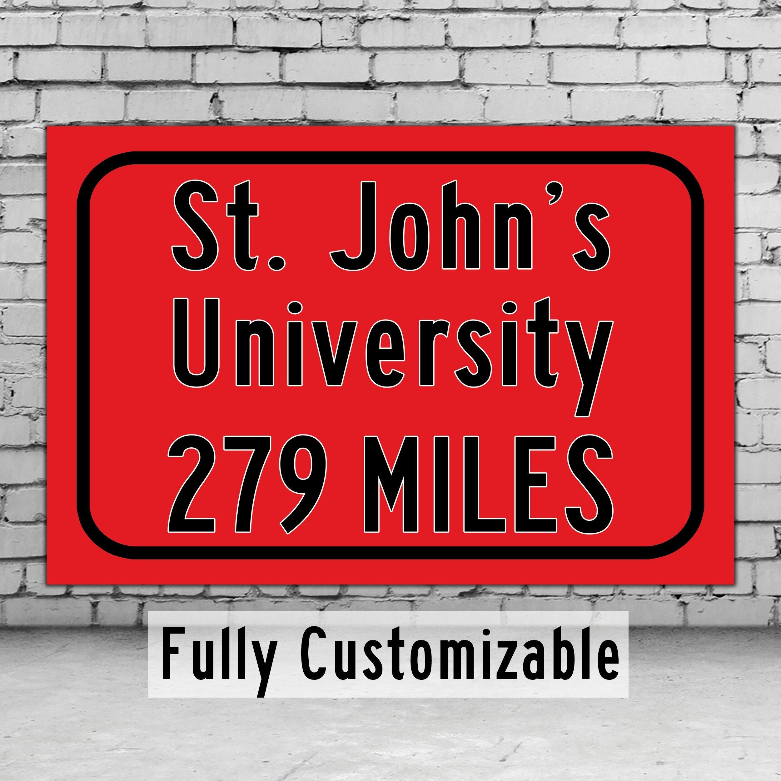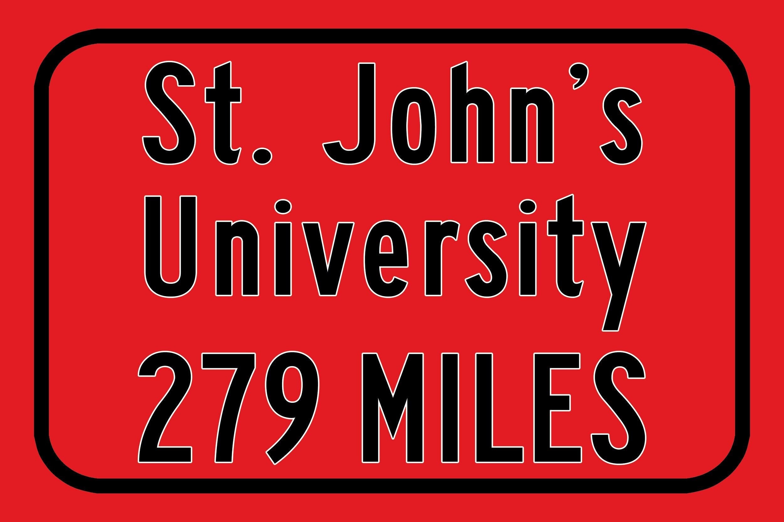 Personalized Highway Distance sign to St. John’s University/ St. John’s University sign. St. John’s University Red Storm sign.