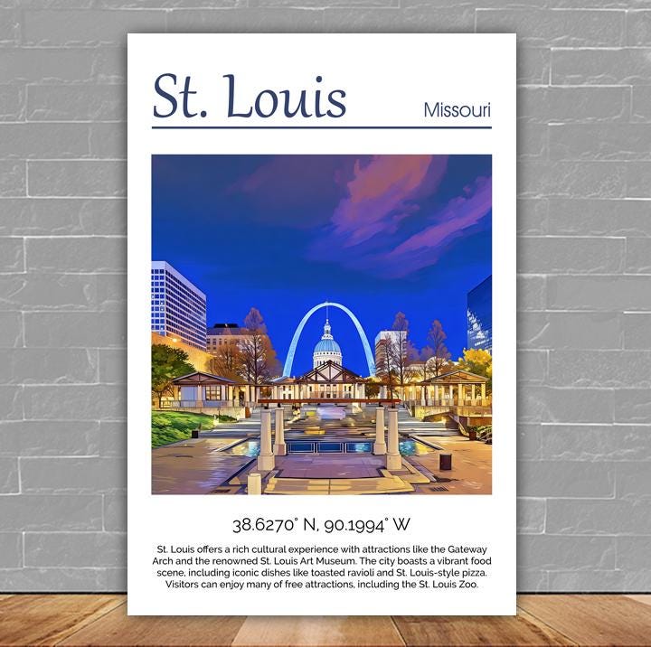 Add a touch of wanderlust to your home with this St Louis travel art print on canvas. Featuring iconic landmarks of St Louis, this canvas print captures the essence of this vibrant city. Perfect for adding a pop of color and personality to your walls, this piece is sure to be a conversation starter.