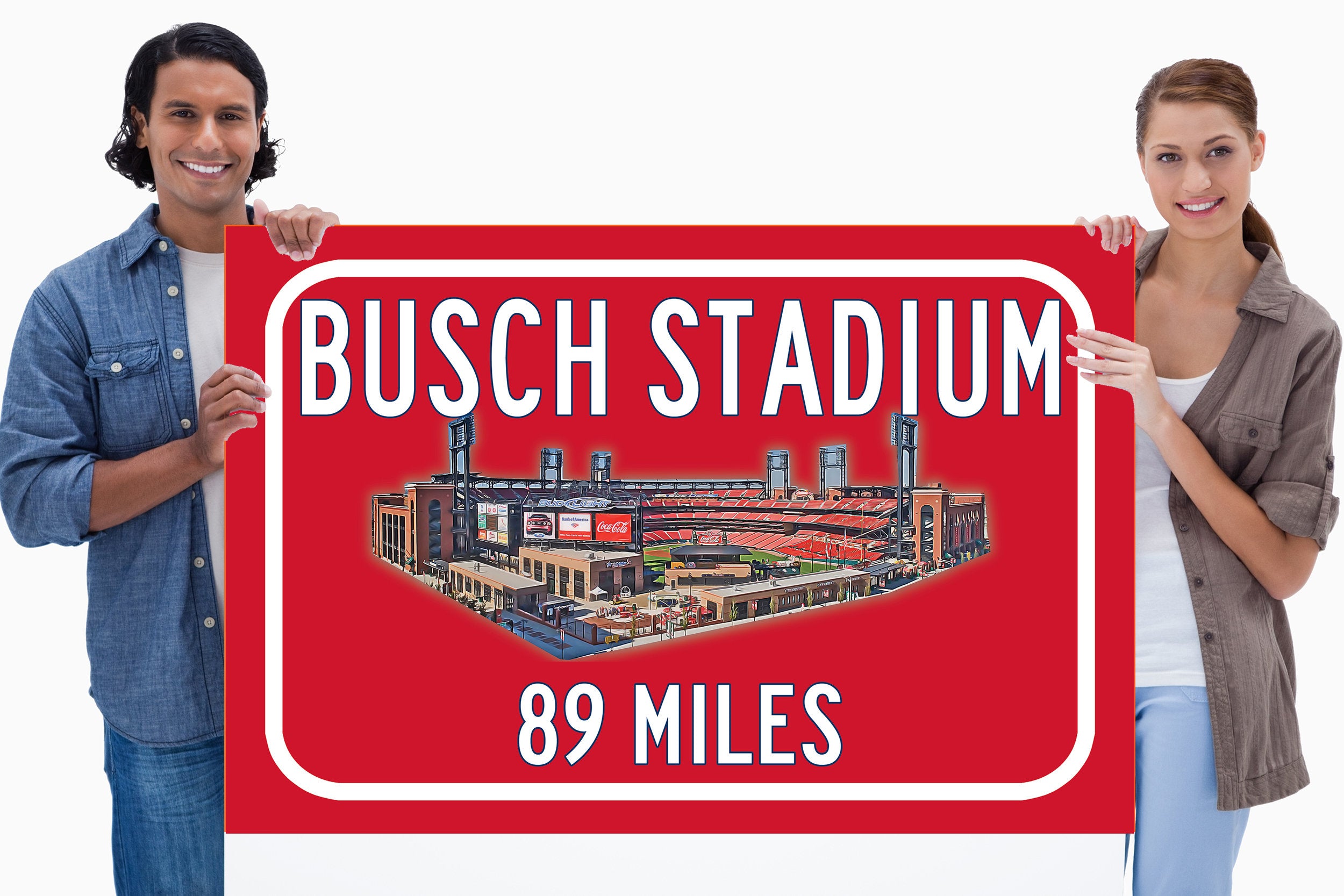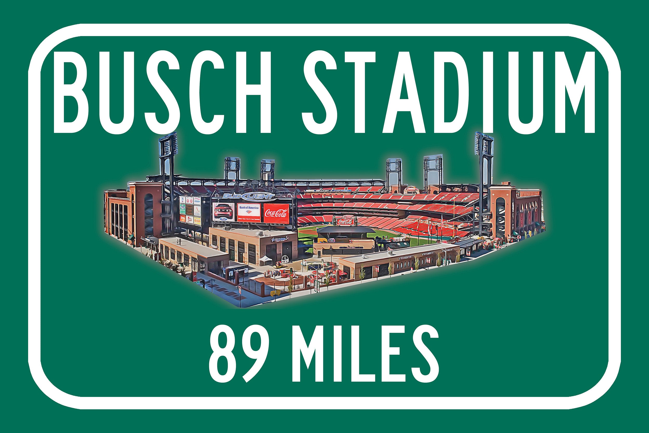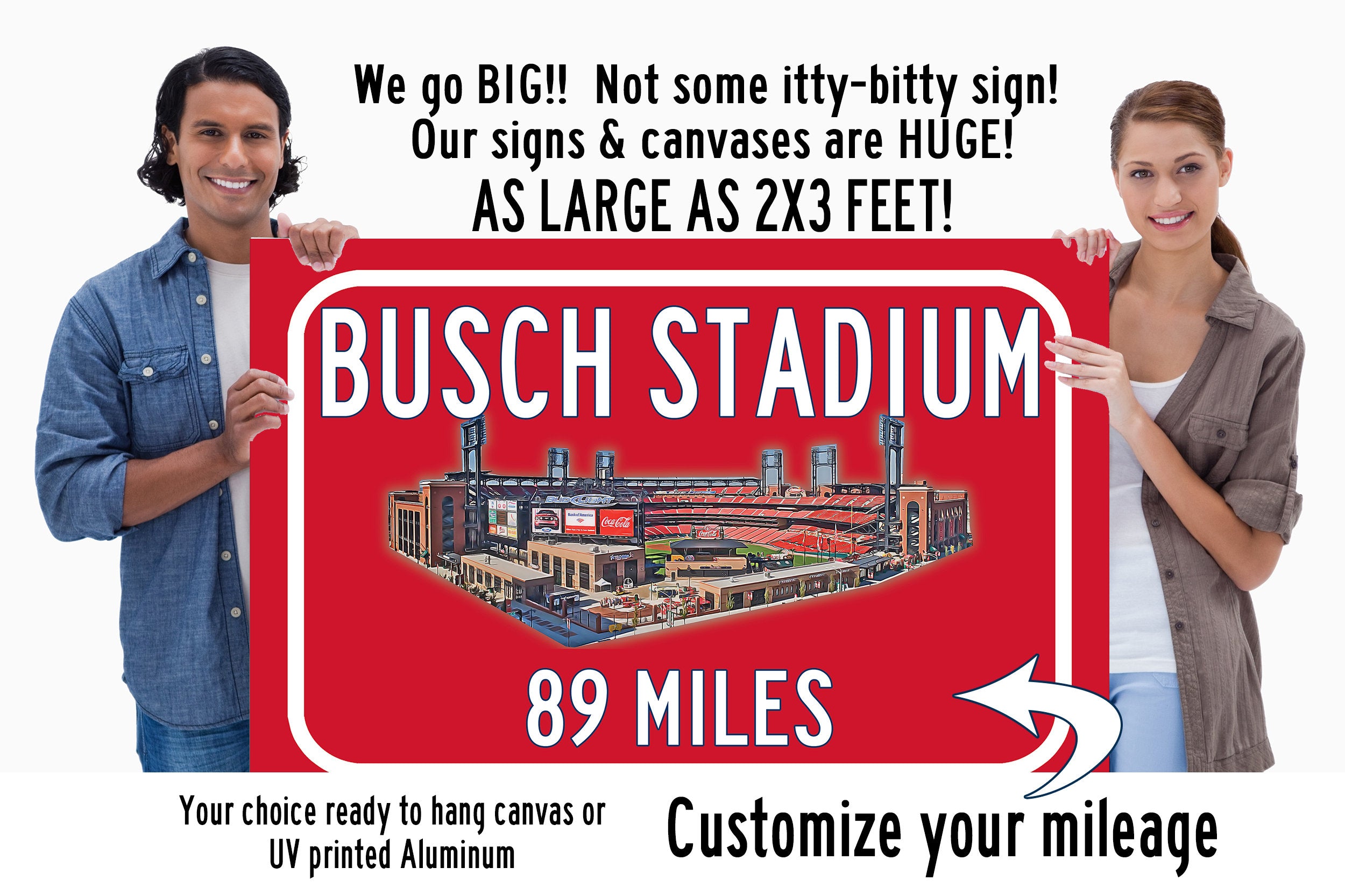 Personalized Highway Distance sign to Busch Stadium in St Louis. Custom replica road sign, with a watercolor photo of the stadium made with real distance from you to Busch Stadium. WE GO HUGE!! Not some itty-bitty sign, Our signs are as large as 2 x 3 FEET! Busch Stadium highway sign. St Louis Cardinals Sign