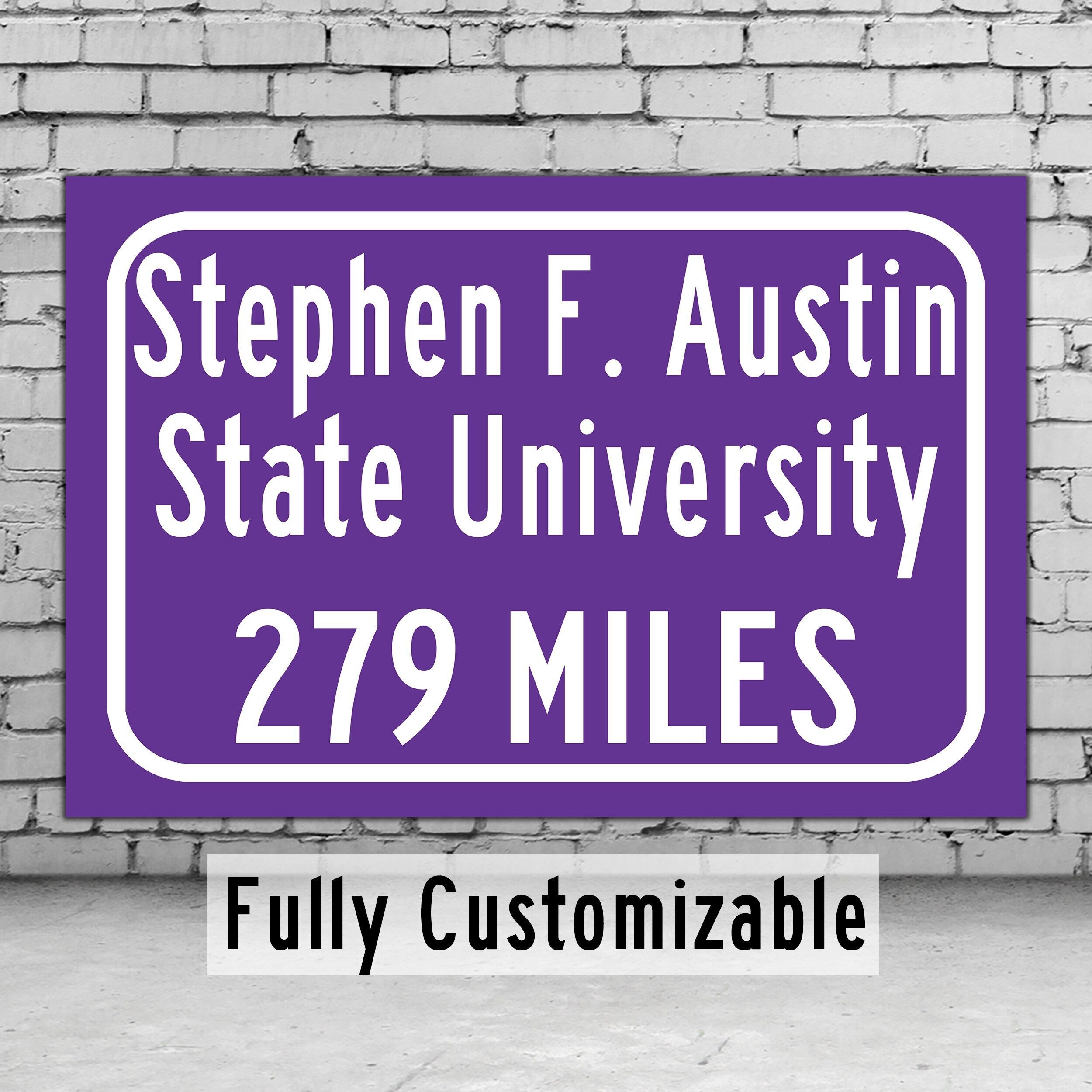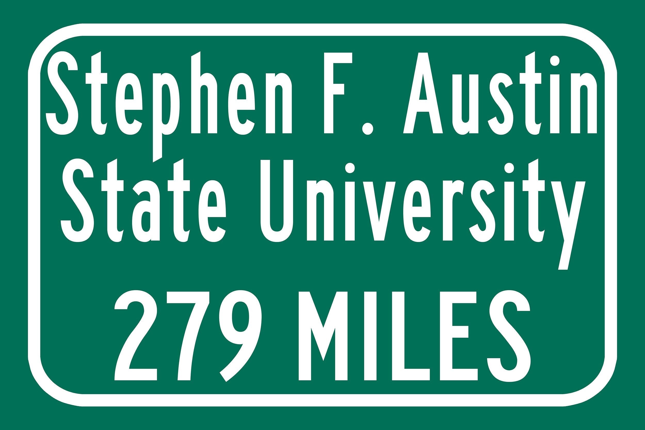 Personalized Highway Distance sign to Stephen F. Austin State University / Stephen F. Austin Lumberjacks / Nacogdoches Texas