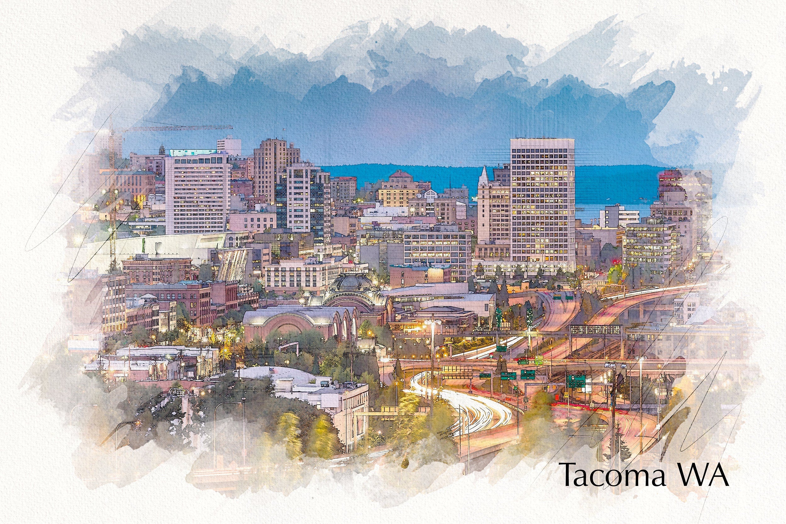 The beautiful watercolor of Tacoma on canvas framed and ready to hang. Stunning colors that make for the perfect wall decor. Tacoma watercolor skyline