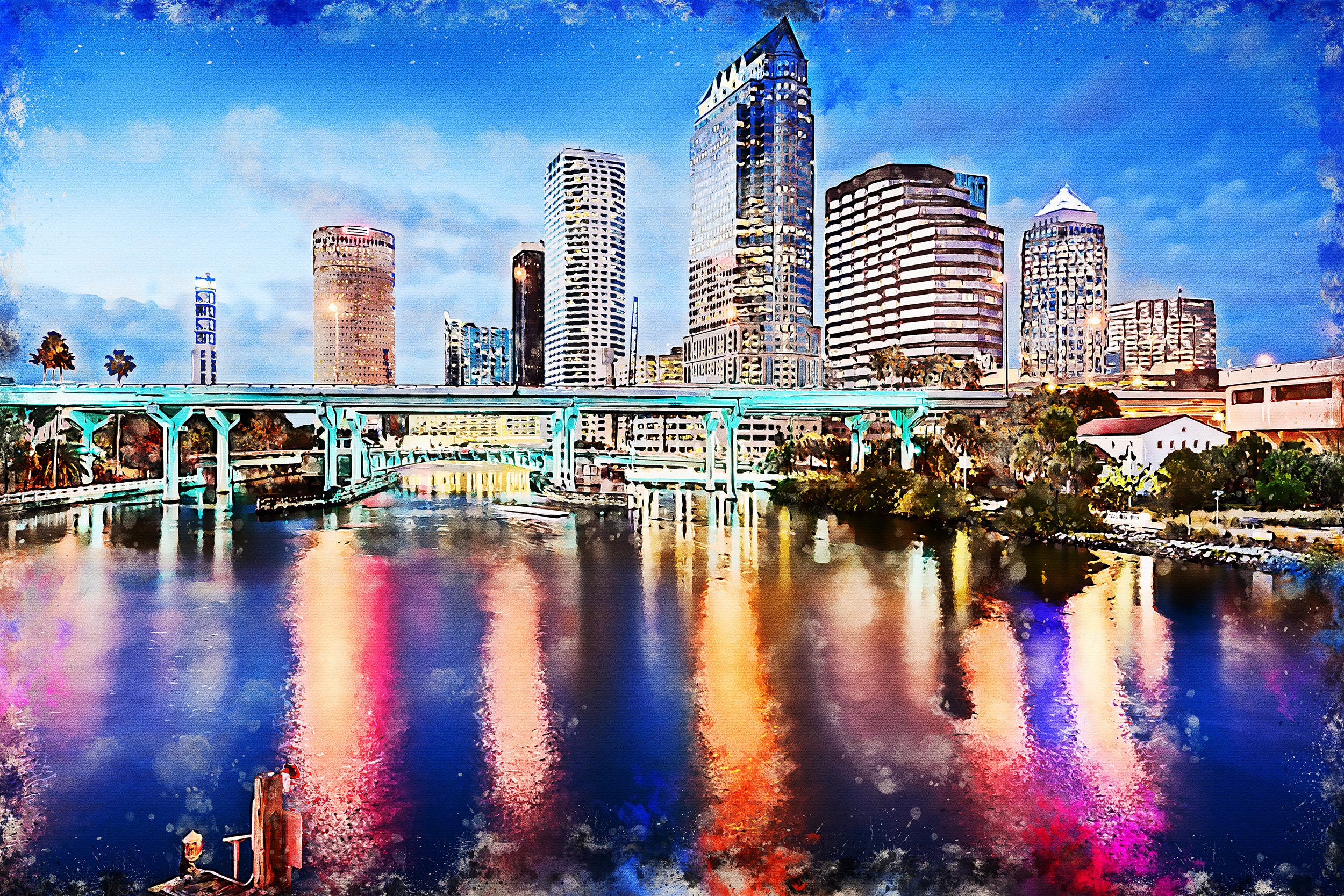 Stunning Watercolor print of the Tampa Florida skyline. Tampa watercolor print. Great for a piece of wall art. Available as a single canvas at 16″ x 24″ , 24″ x 36″ , or 32″ x 48″ or we can make you a special 3 panel work of art as large as 4 x 8 foot wide or get the digital file and you can print it yourself. ( Digital File only, no product included)