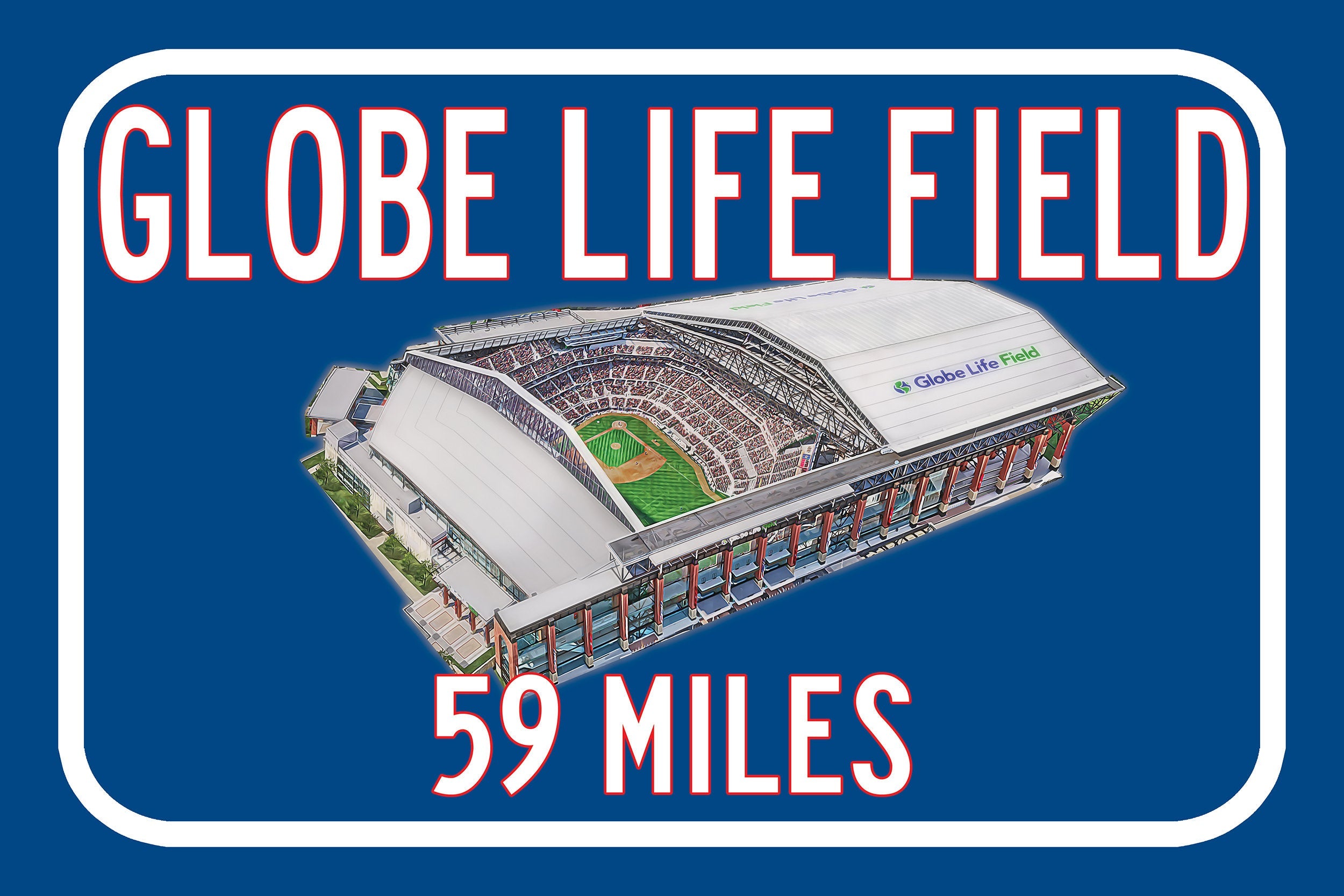 Personalized Highway Distance sign to Globe Life Field in Texas. WE GO HUGE!! Not some itty-bitty sign, Our signs are as large as 2 x 3 FEET! Globe Life Field highway sign. Texas Ranges Sign