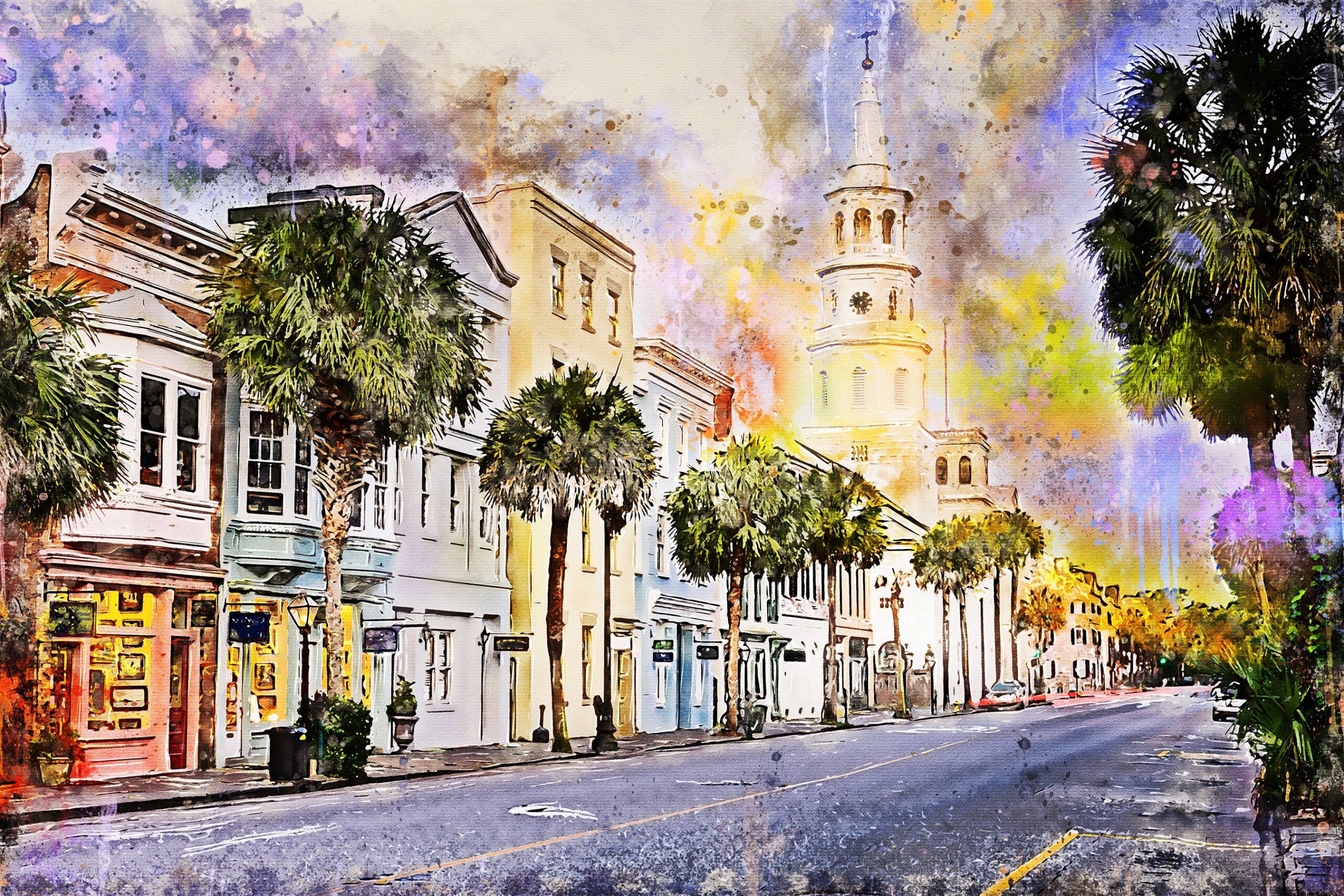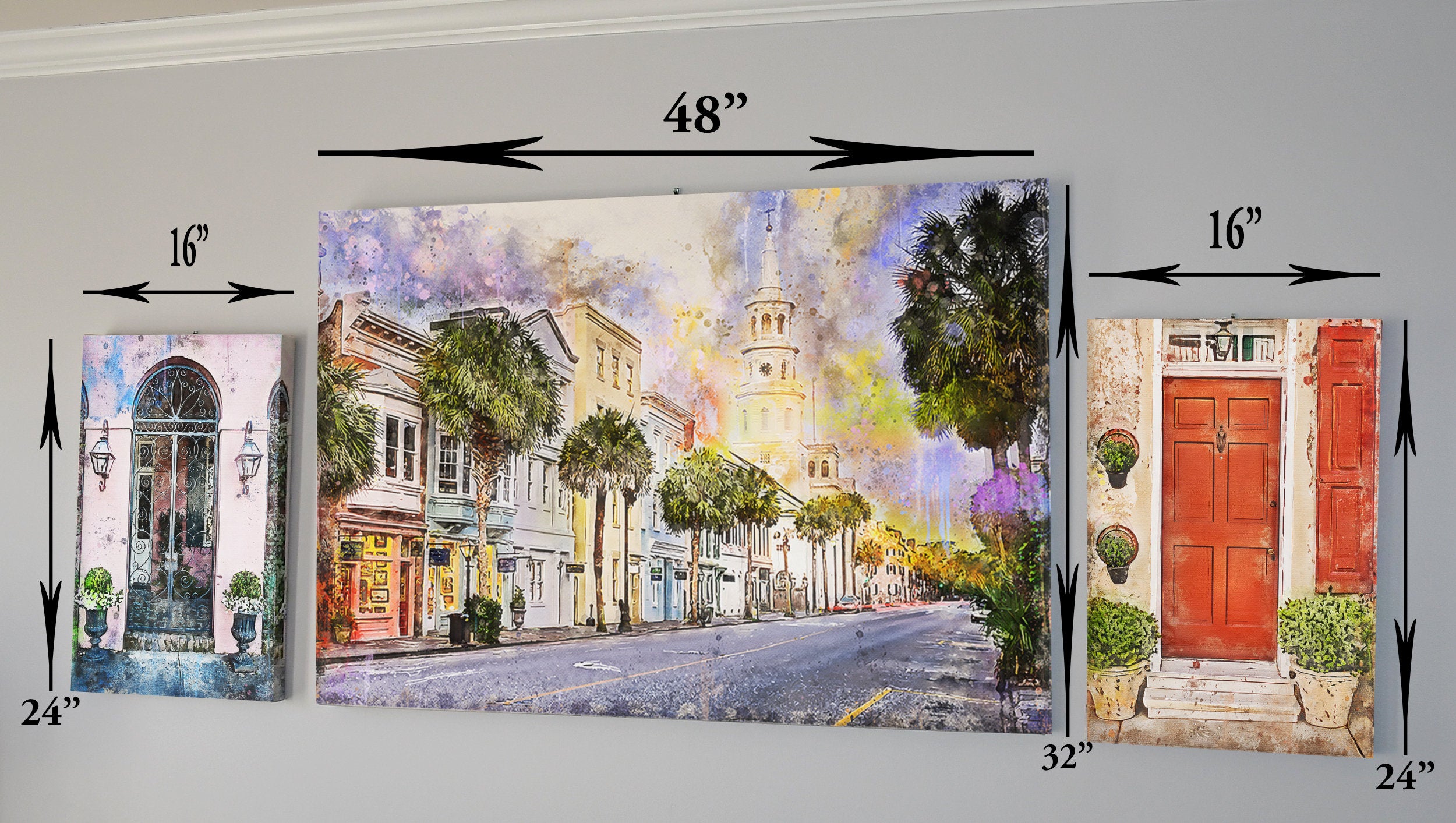 Stunning street scene watercolor in Charleston South Carolina. Beautiful set of 3 Charleston Watercolor canvases. 2 Charleston Doors 16×24 and 1 Charleston Street 32×48 Charleston watercolor canvas. Entire set of 3 is 82″ Wide and 32″ high