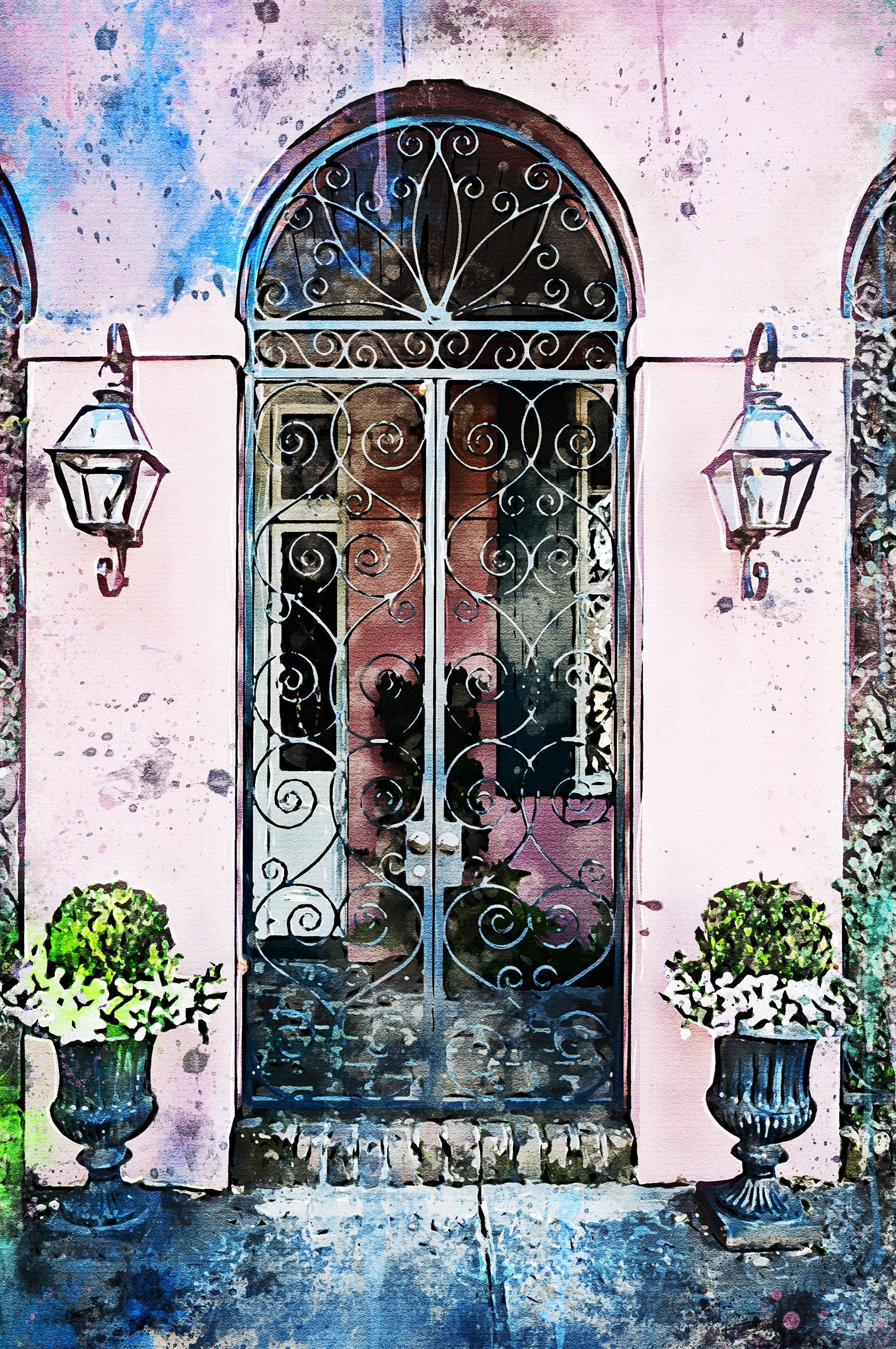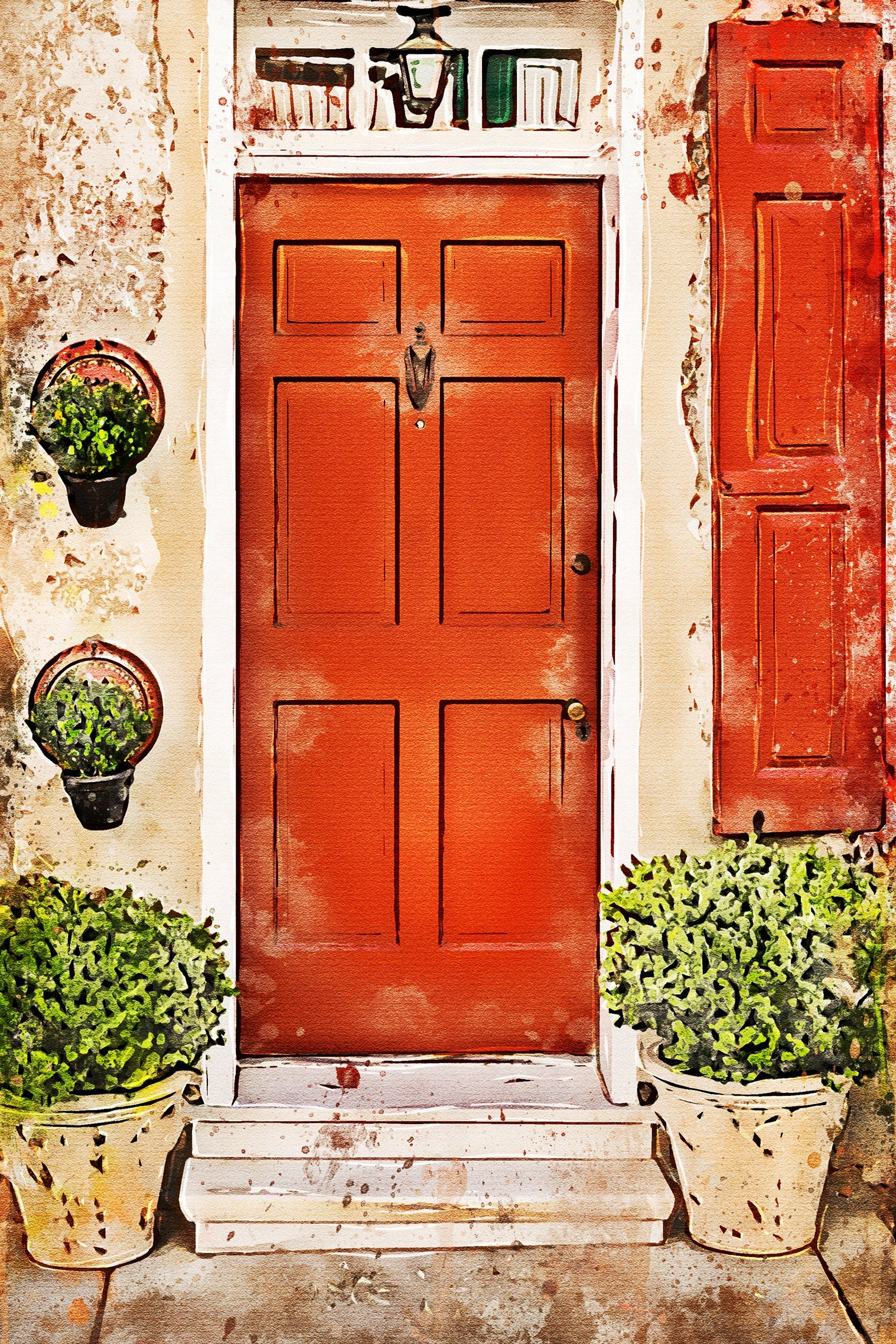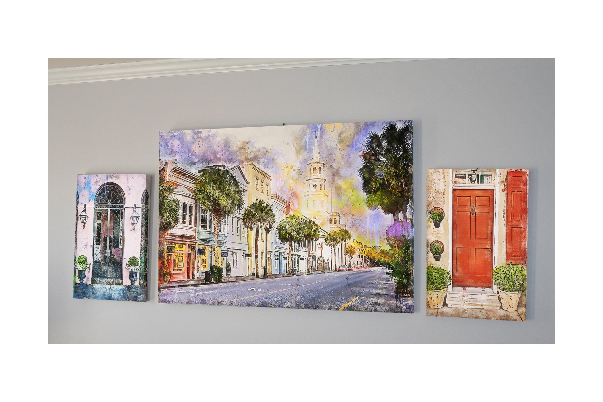 Stunning street scene watercolor in Charleston South Carolina. Beautiful set of 3 Charleston Watercolor canvases. 2 Charleston Doors 16×24 and 1 Charleston Street 32×48 Charleston watercolor canvas. Entire set of 3 is 82″ Wide and 32″ high