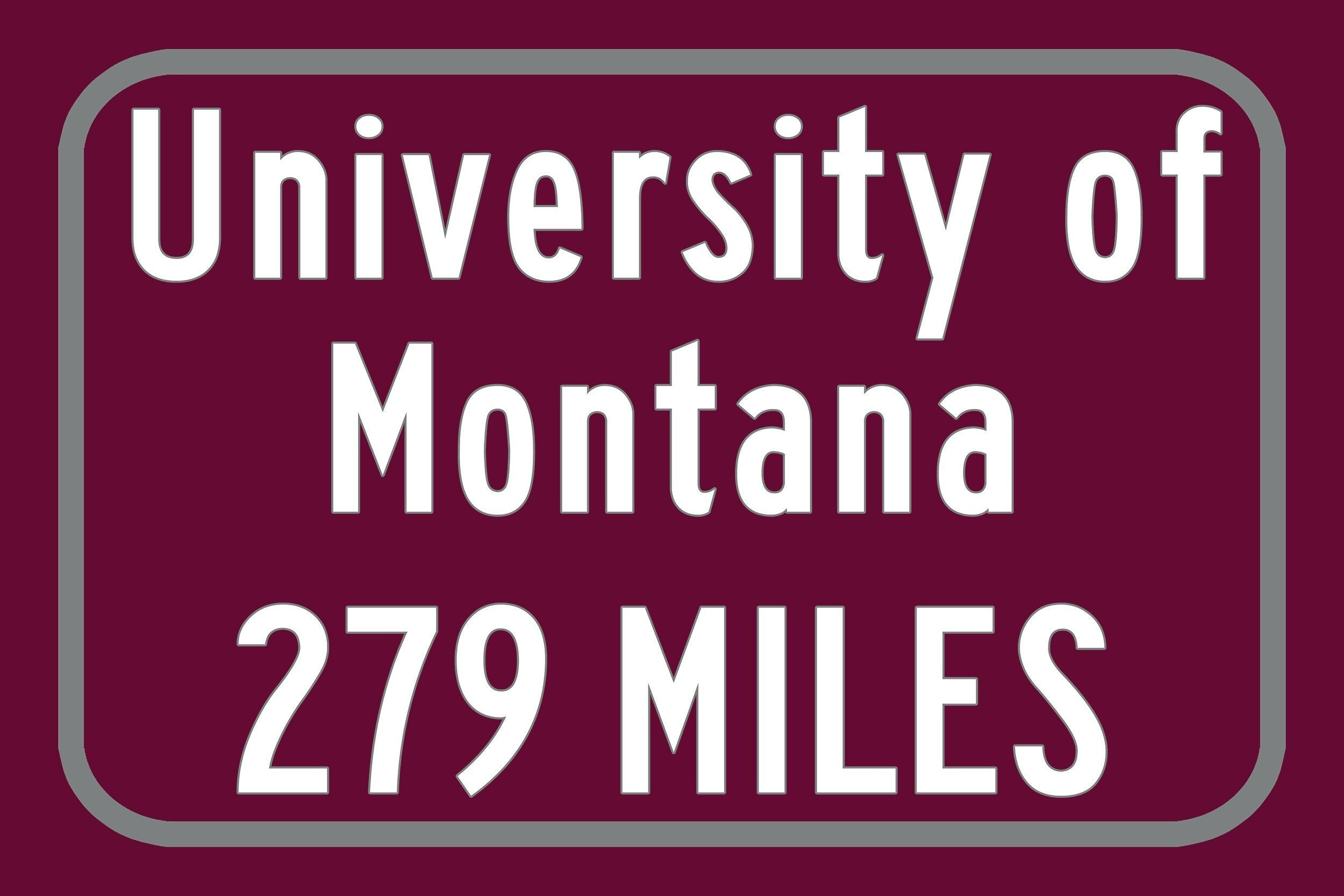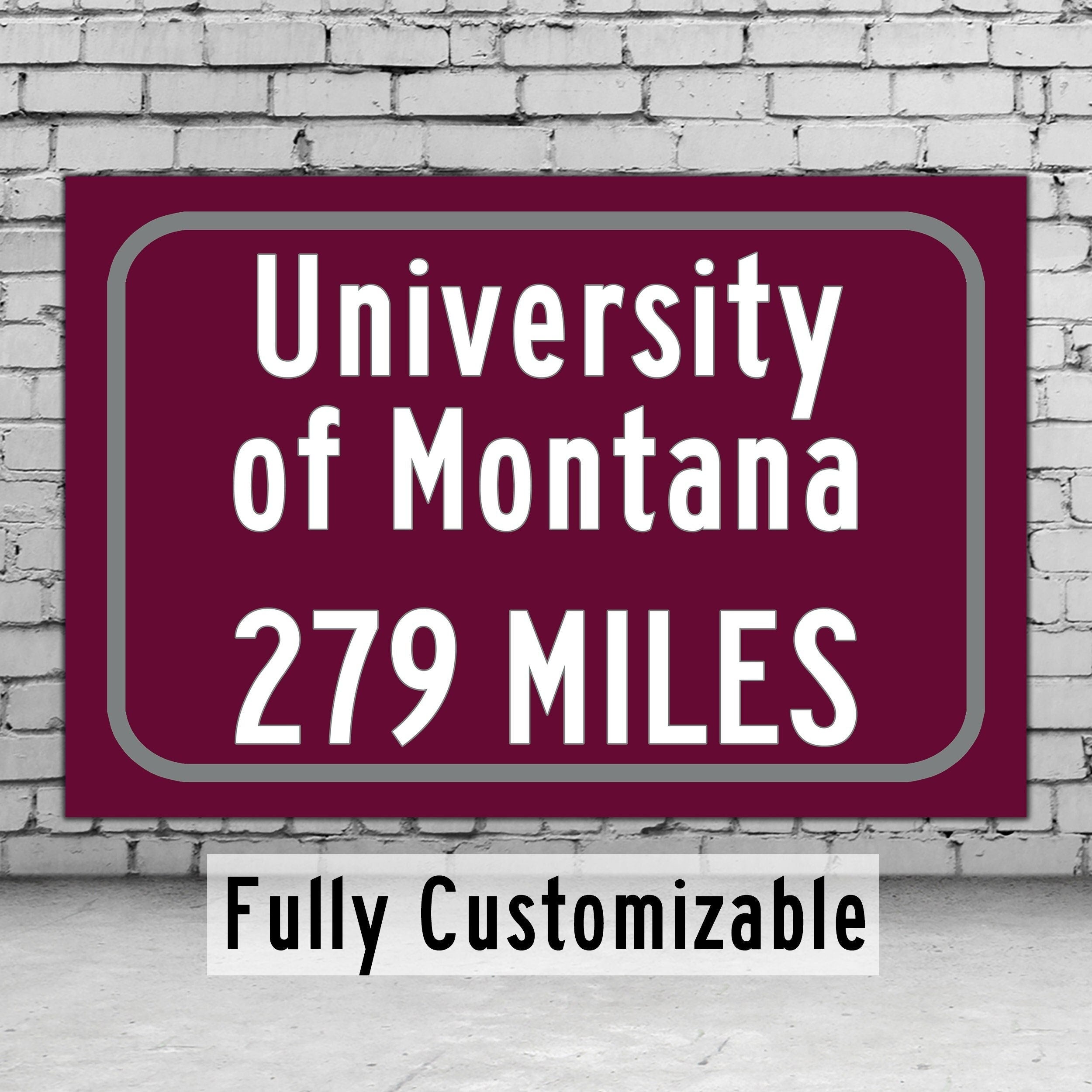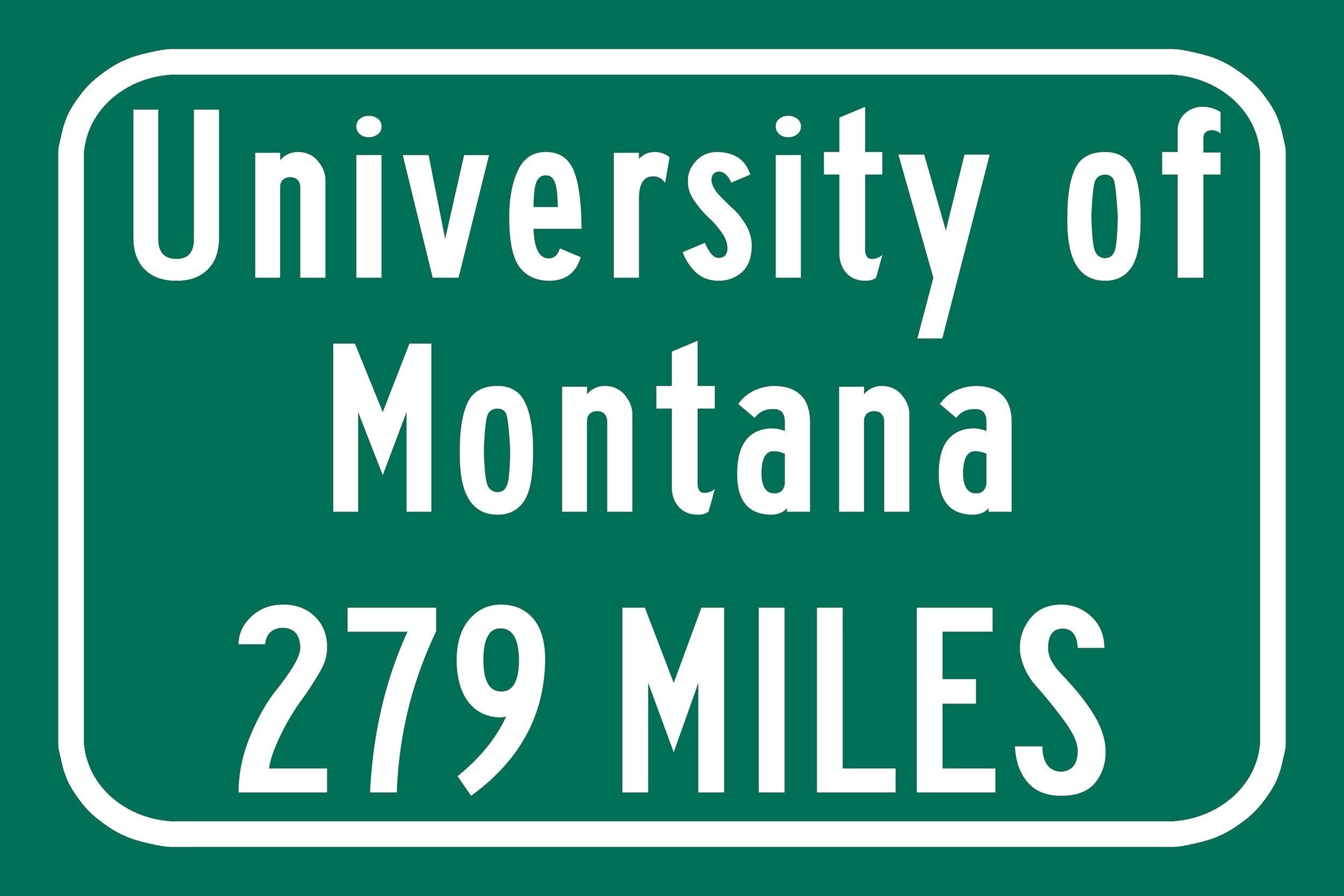 Personalized Highway Distance sign to The University of Montana / University of Montana sign. Montana Grizzlies sign.