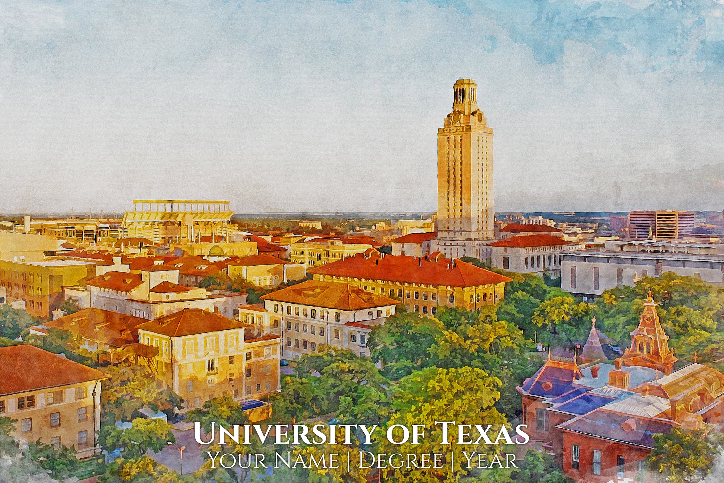 You will love these watercolor digital prints of The University of Texas. Perfect for a graduation gift. These make wonderful gift for The University of Texas Alumni and fans. Feel free to customize it as well when you check out. We will send a proof for you to approve before we print so please check your email about 24hrs after you order
