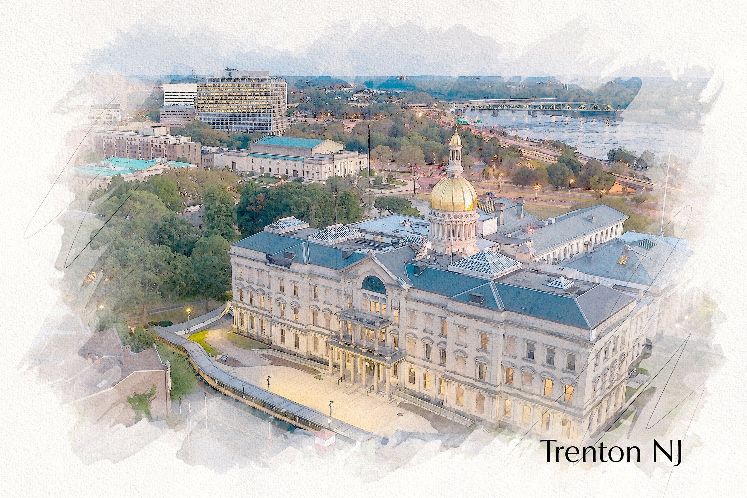 The beautiful watercolor of Trenton NJ on canvas framed and ready to hang. Stunning colors that make for the perfect wall decor. Trenton watercolor canvas skyline