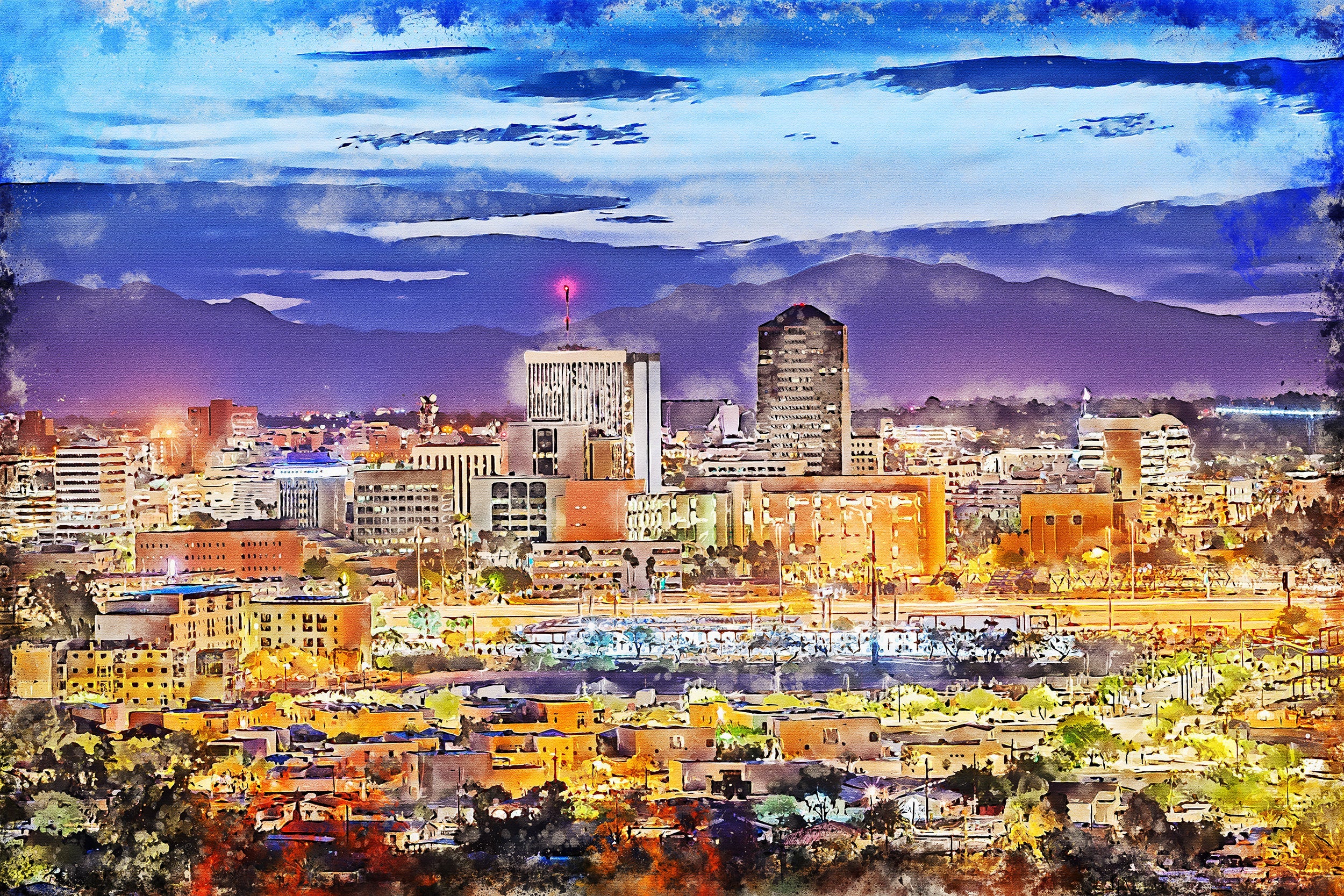 The beautiful city of Tucson watercolored, and mounted on canvas framed and ready to hang. Stunning colors that make for the perfect wall décor. Tucson canvas skyline.