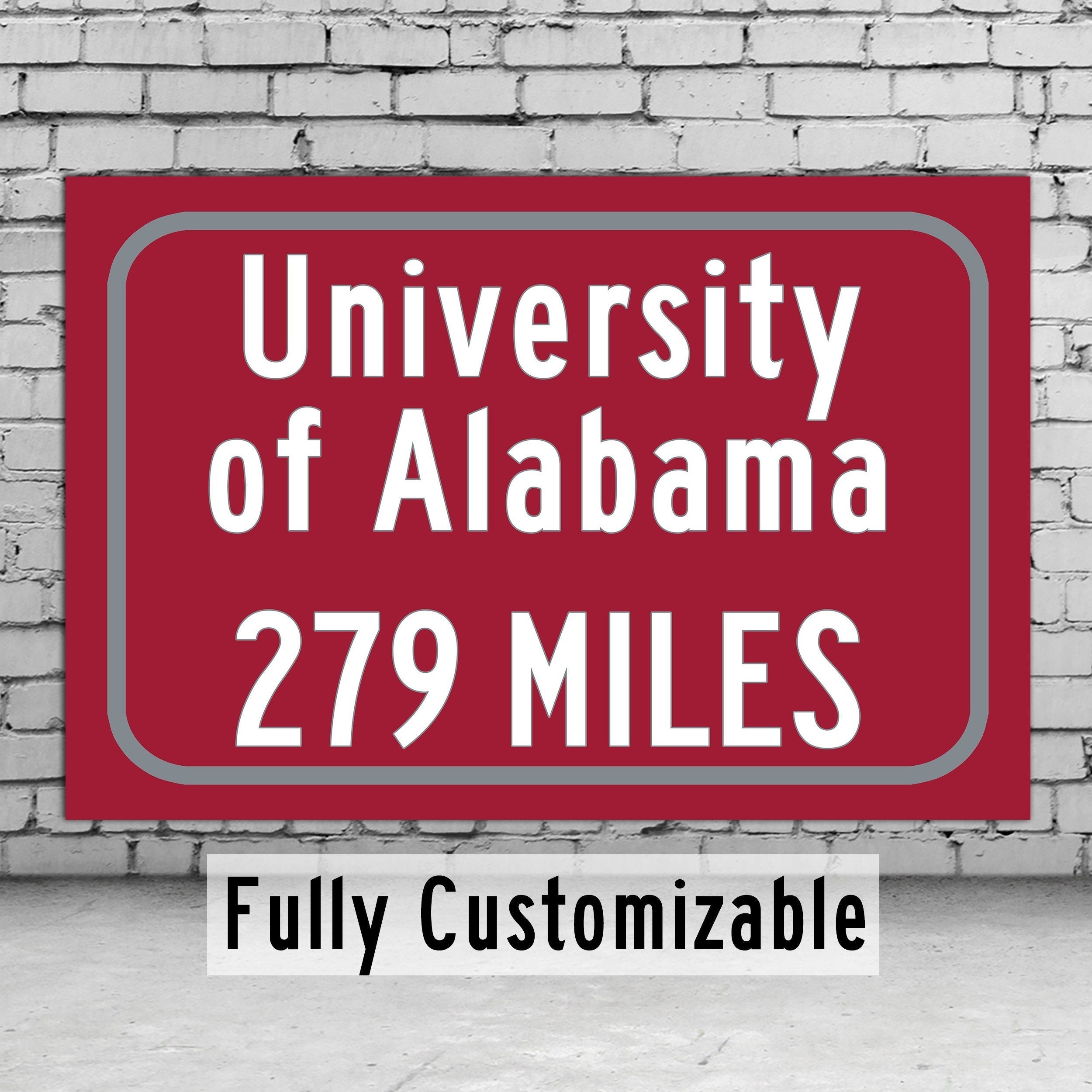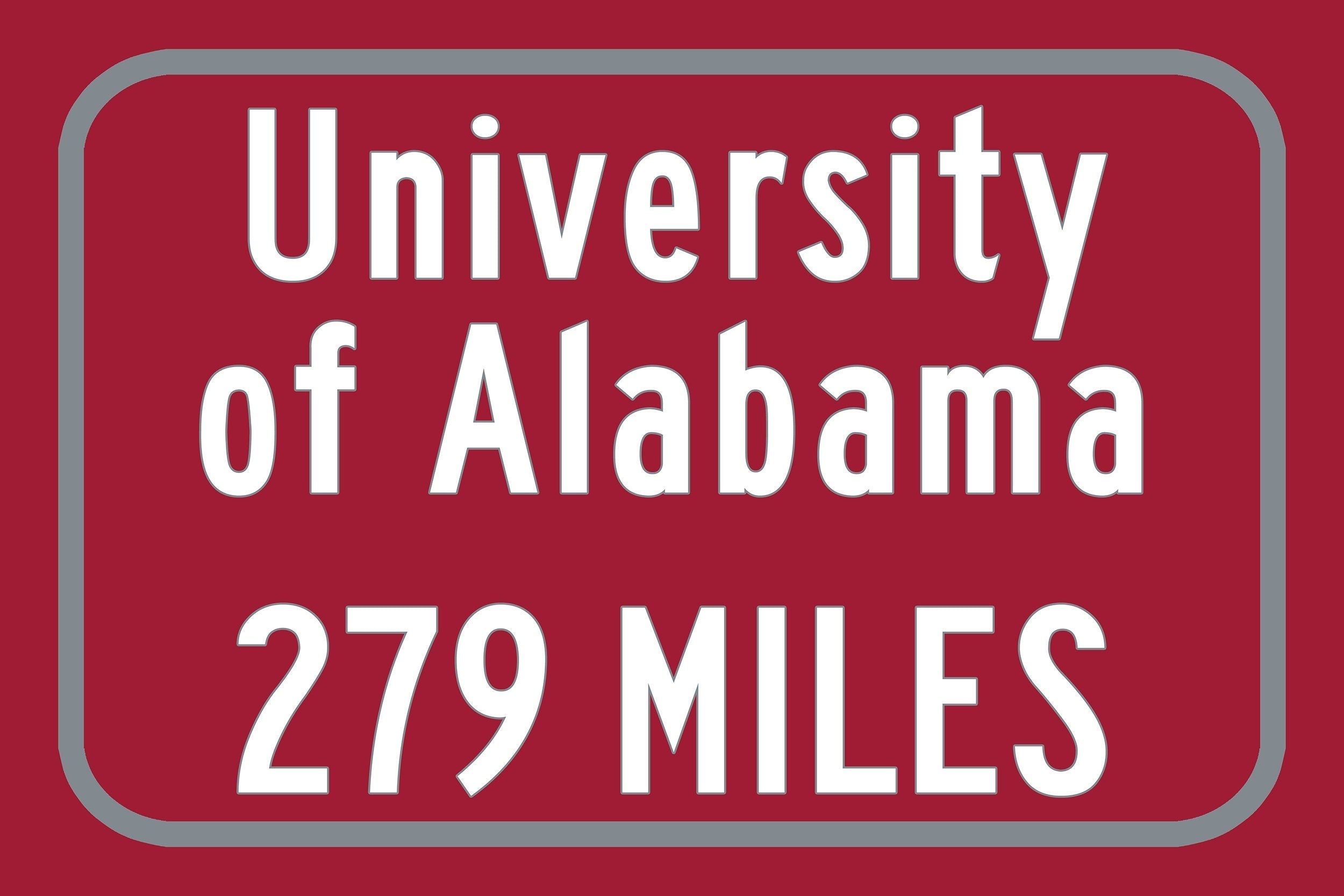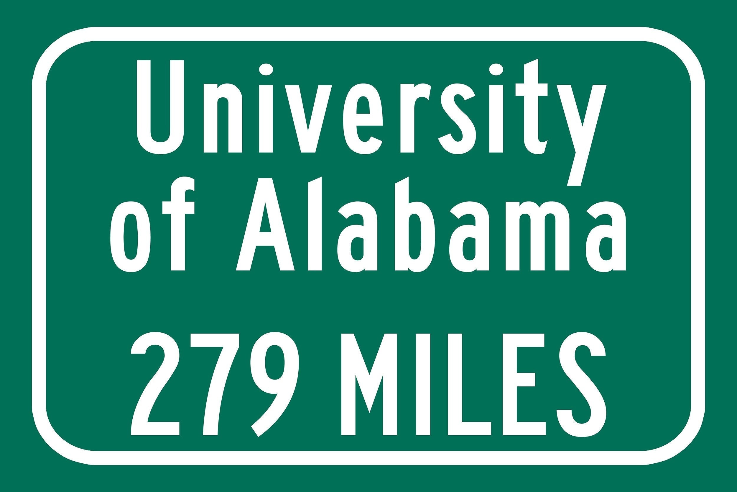 Personalized Highway Distance sign to University of Alabama. Alabama National Champions.