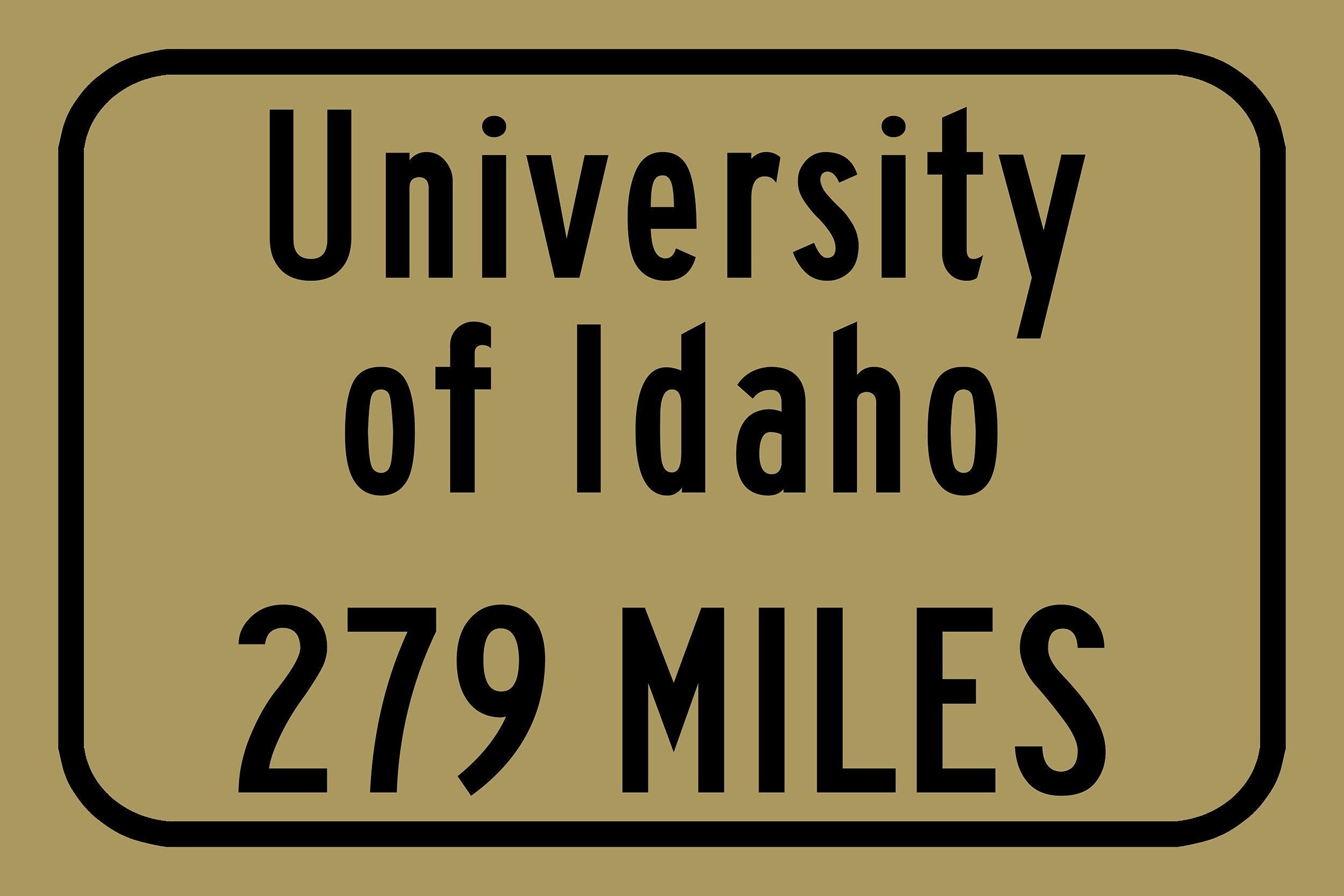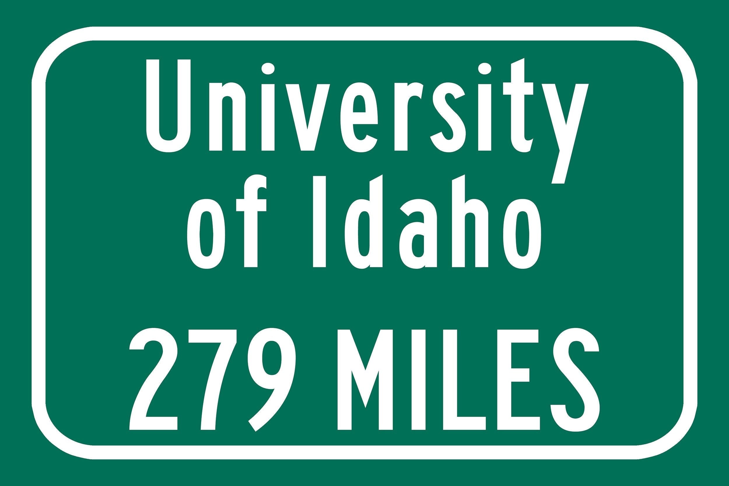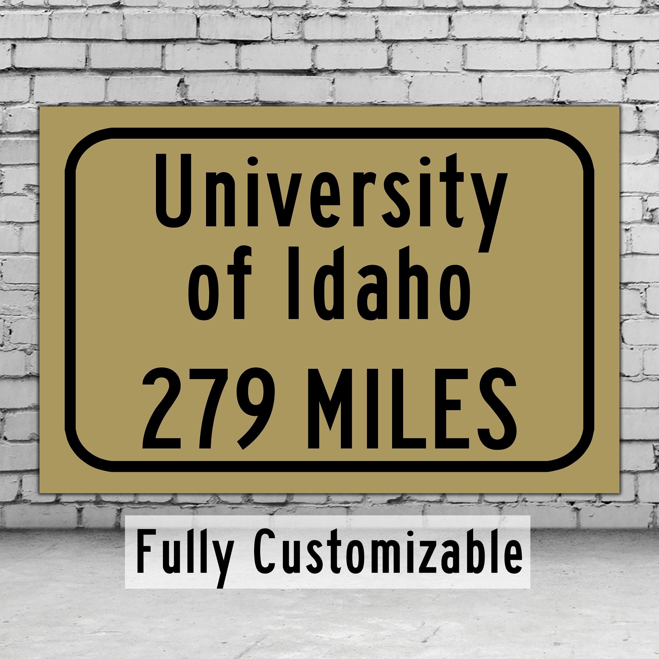 Personalized Highway Distance sign to University of Idaho , University of Idaho sign. University of Idaho Vandals sign.