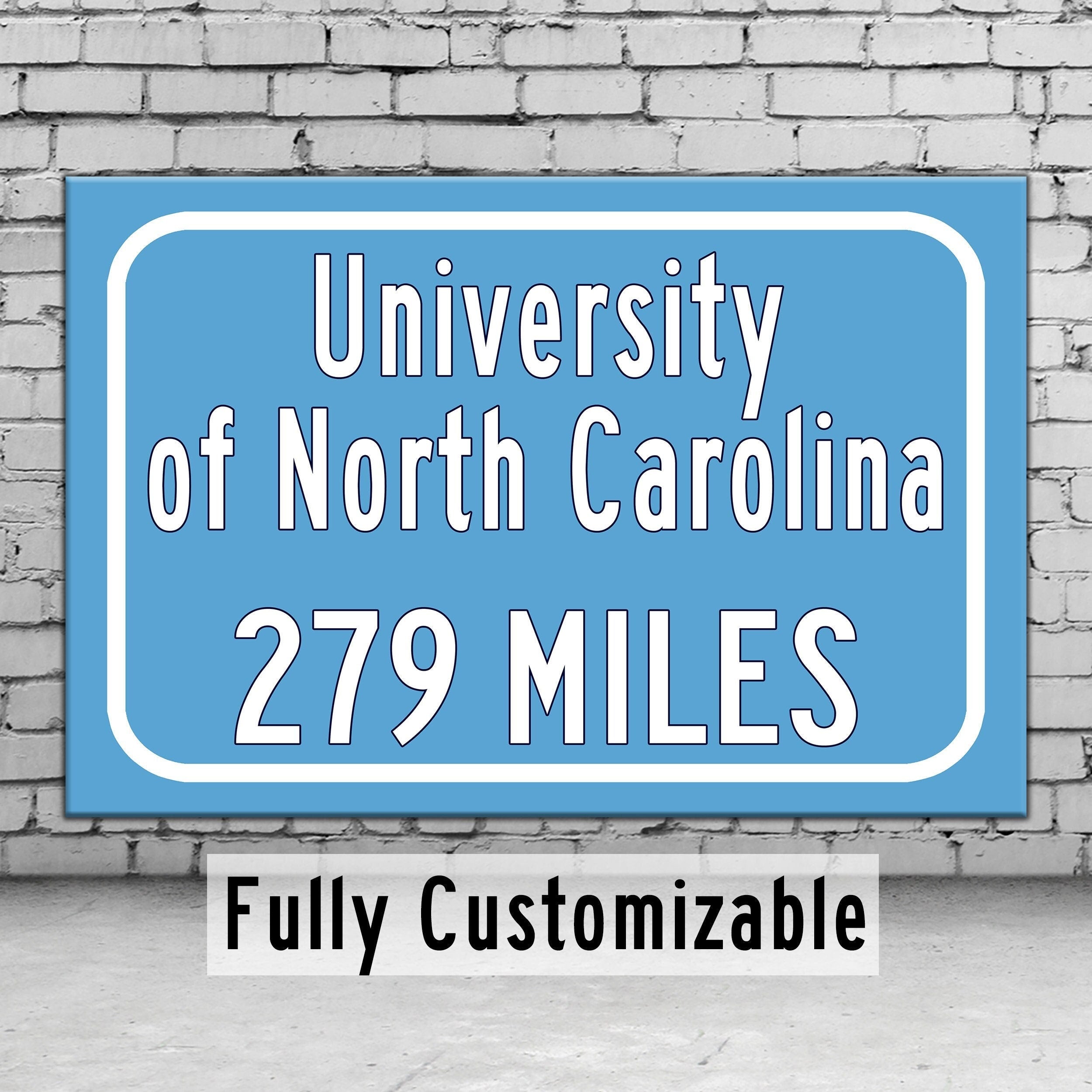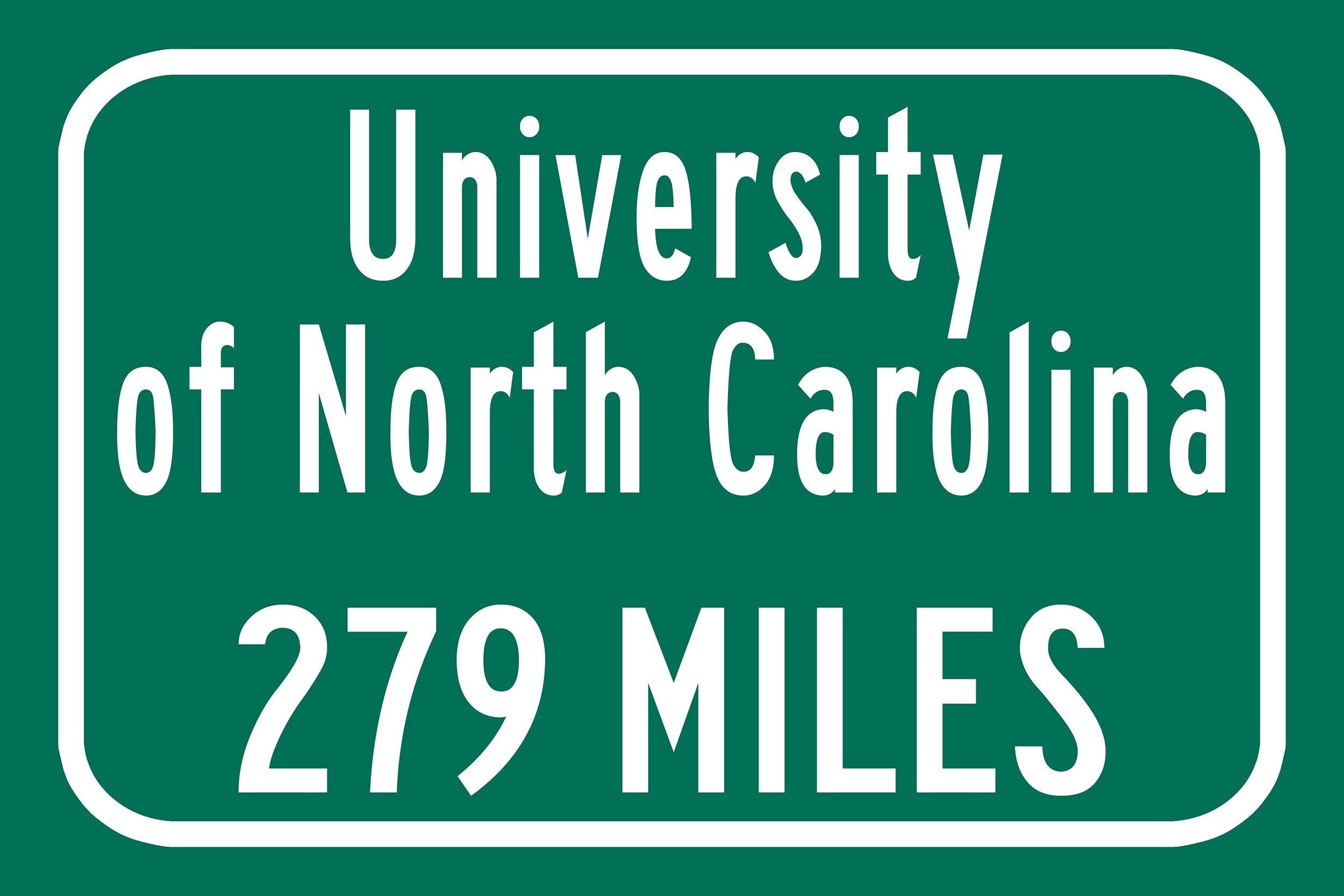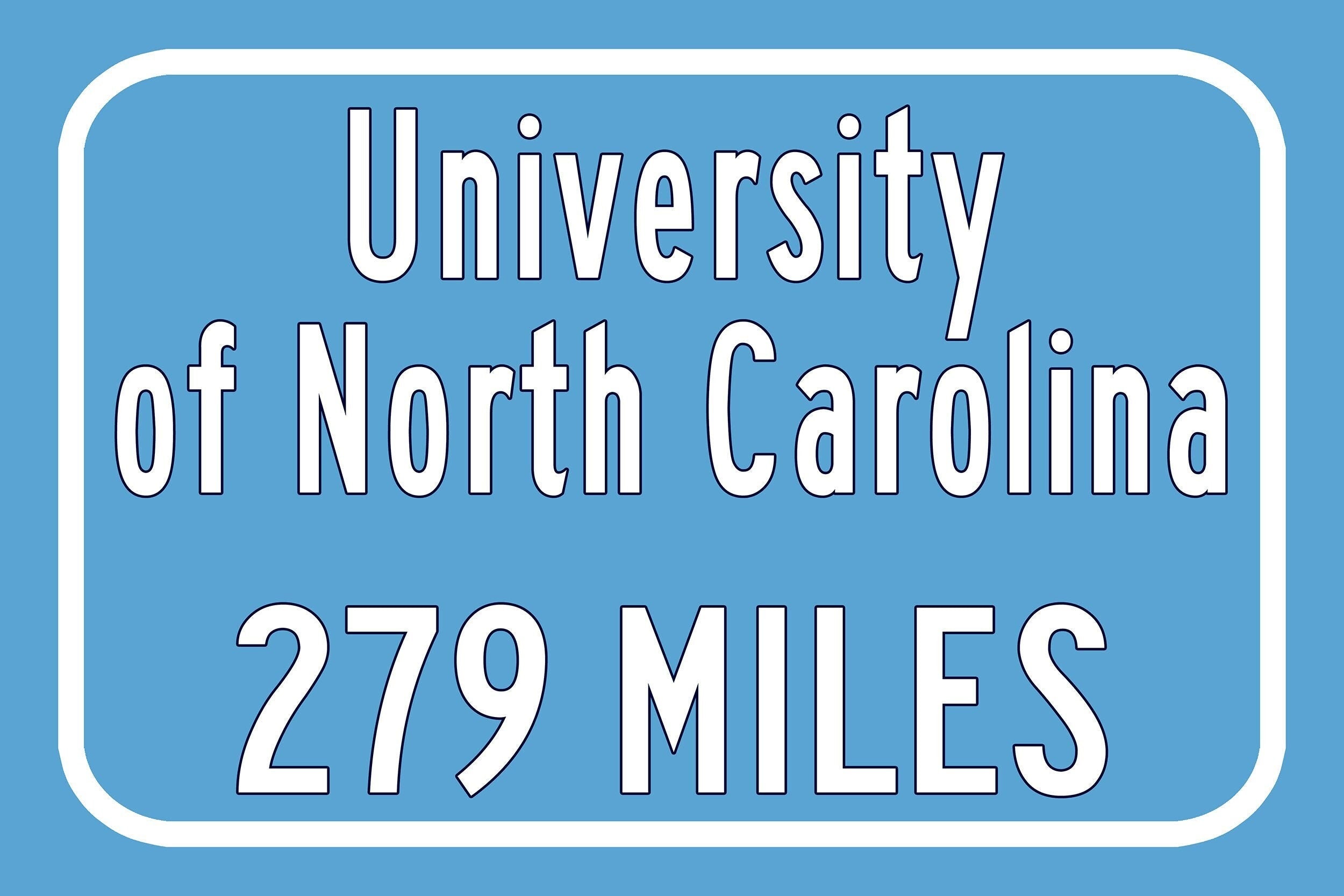 Personalized Highway Distance sign to University of North Carolina. University of North Carolina sign. North Carolina Tar Heels sign.