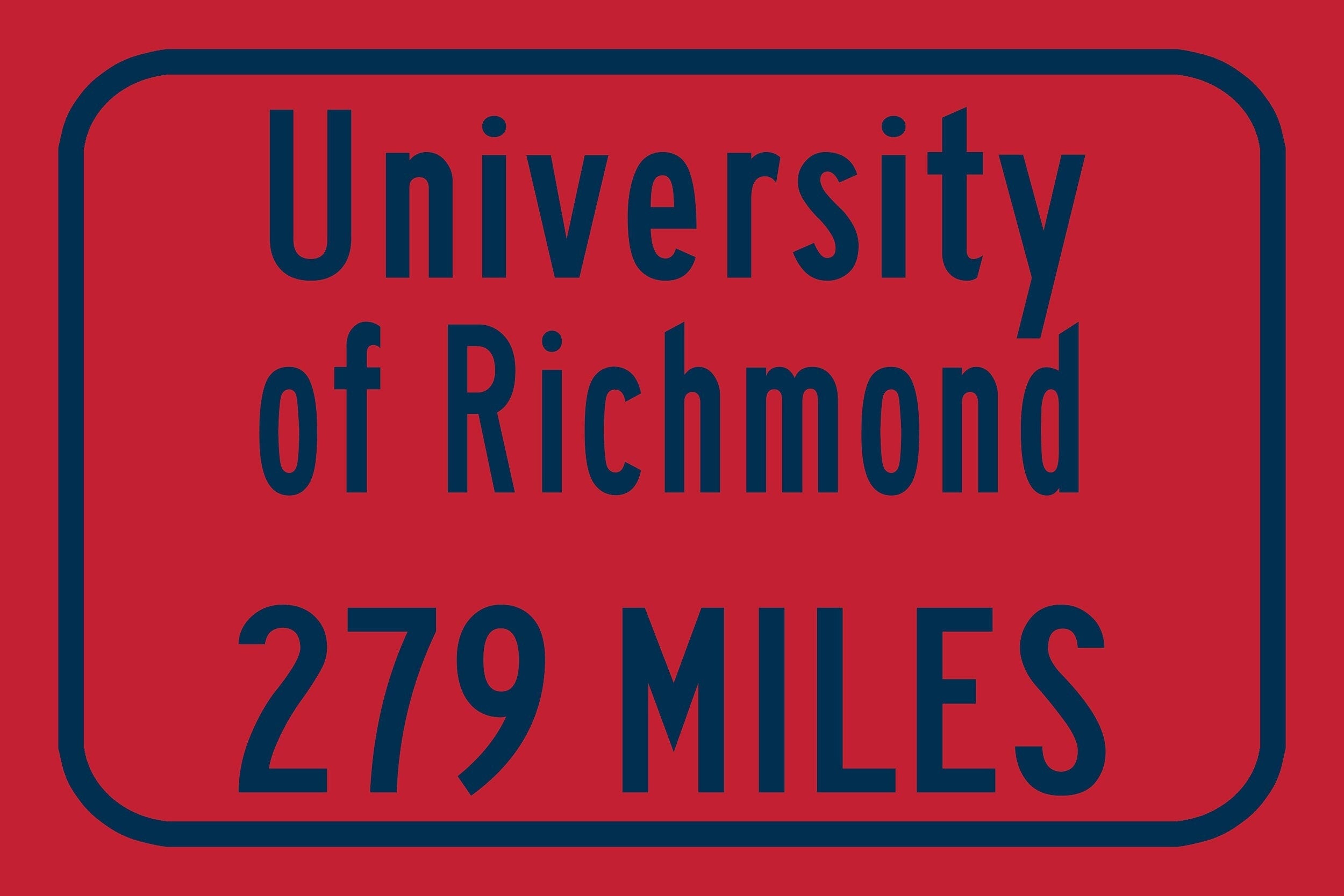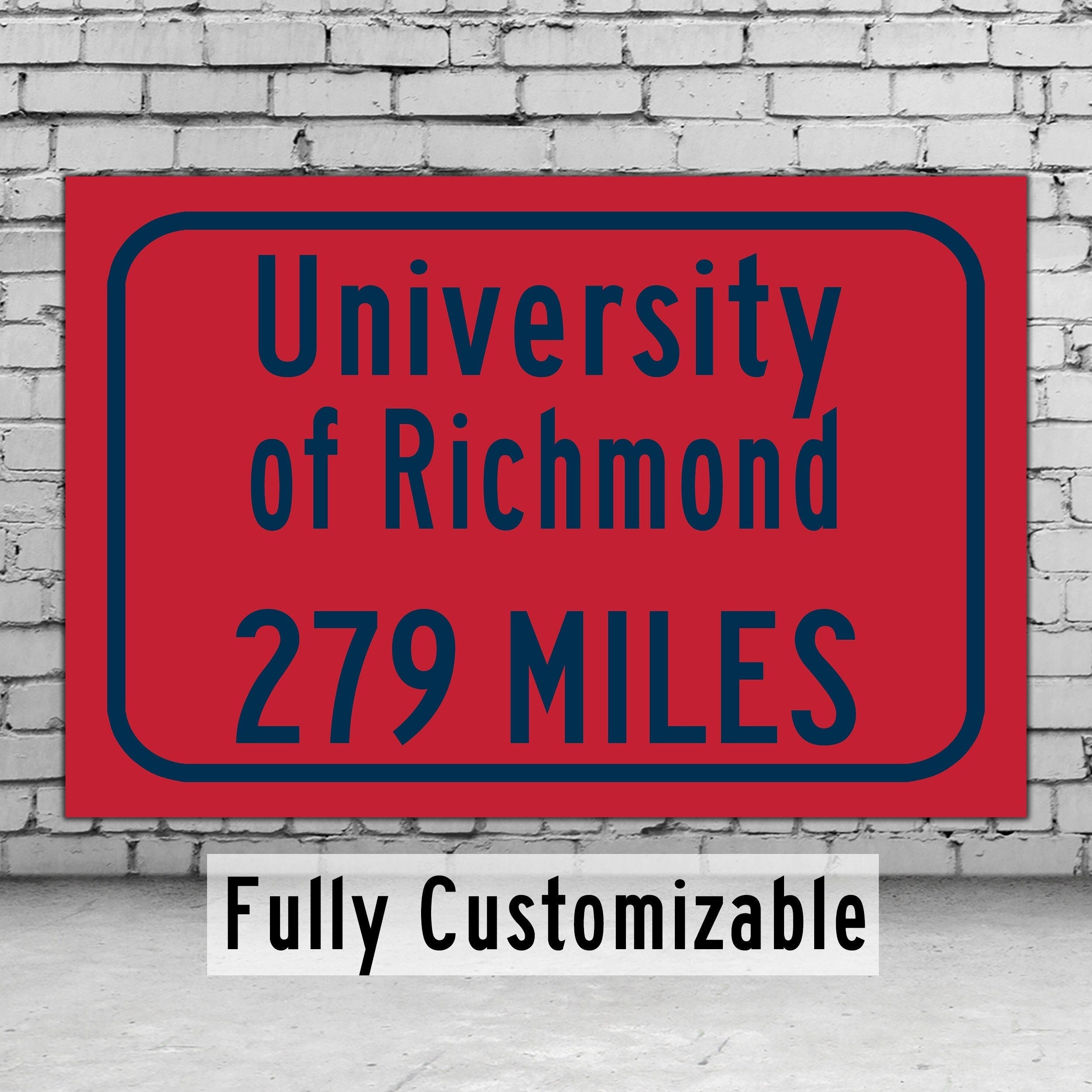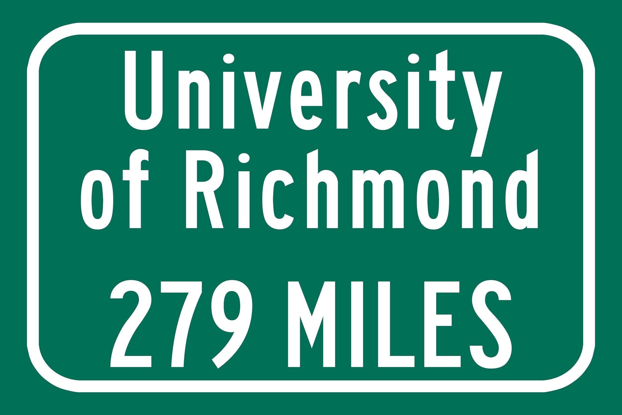 Personalized Highway Distance sign to University of Richmond , University of Richmond sign. University of Richmond Spiders sign.