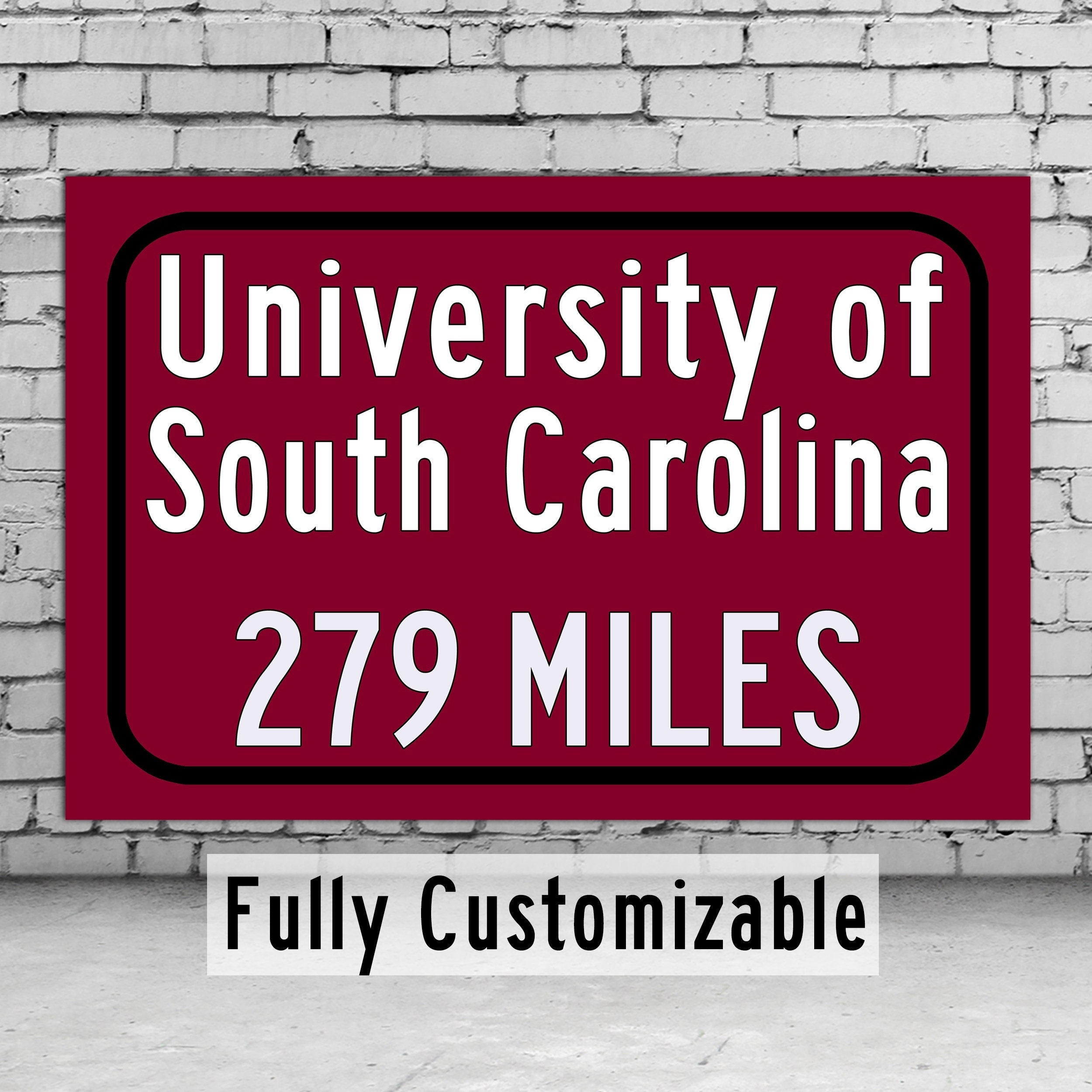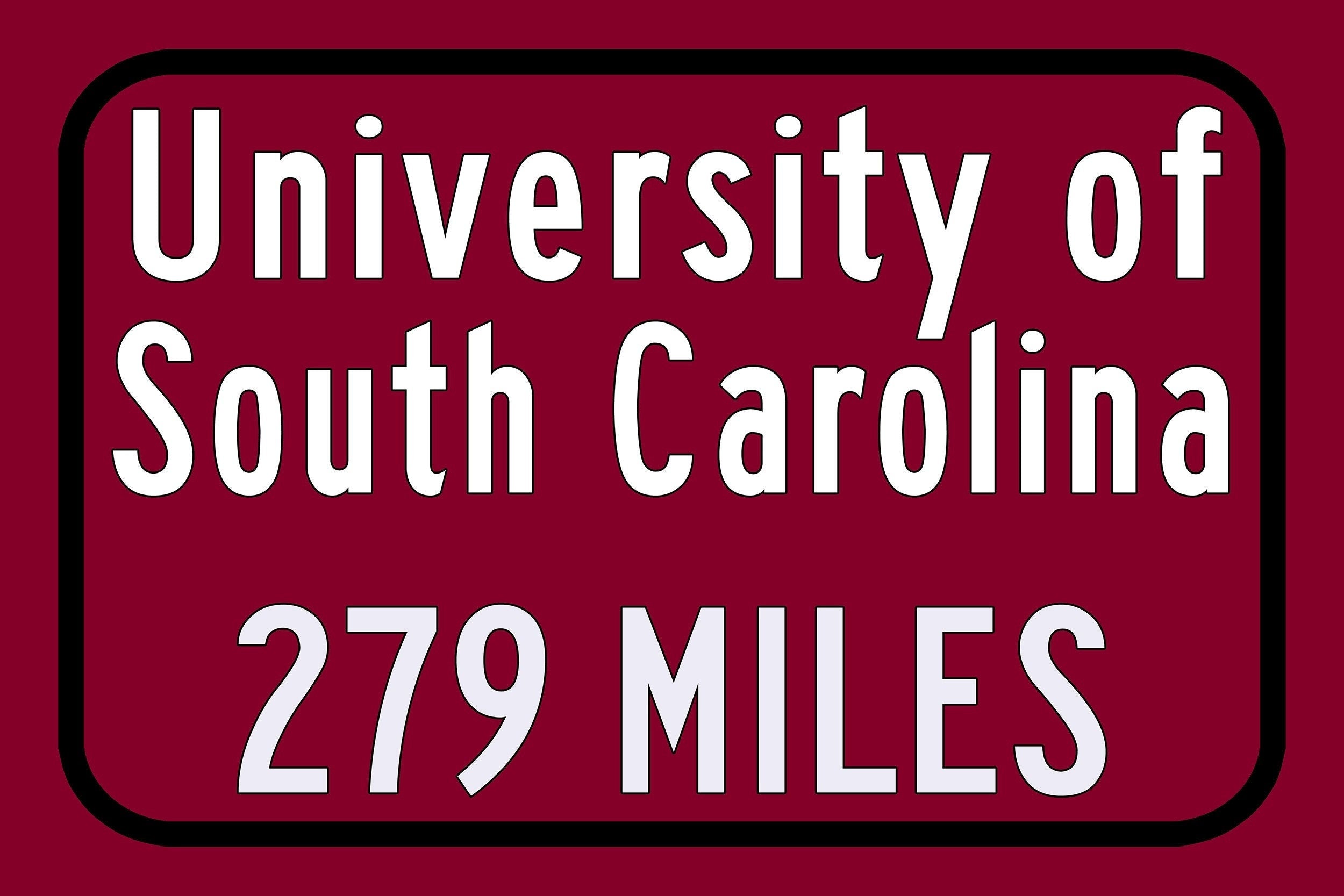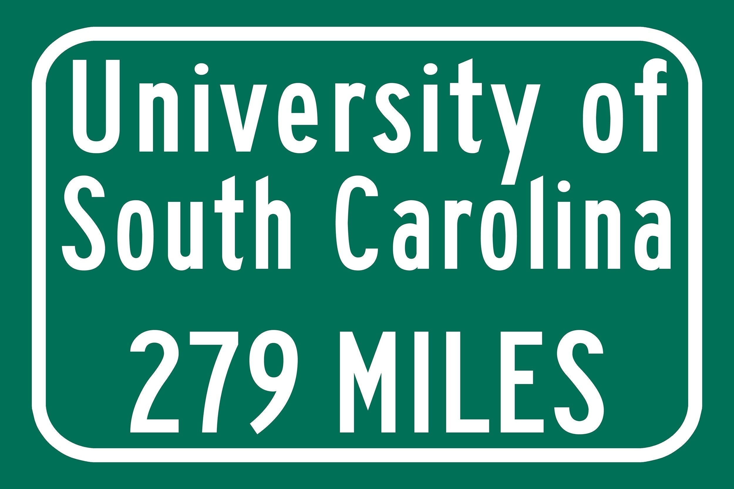 Personalized Highway Distance sign to University of South Carolina. University of South Carolina sign. USC Gamecocks sign.