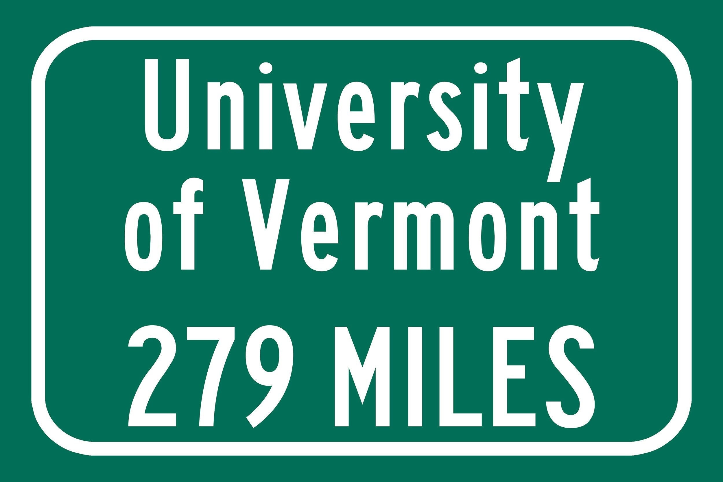 Personalized Highway Distance sign to University of Vermont, University of Vermont sign. University of Vermont Catamounts sign.
