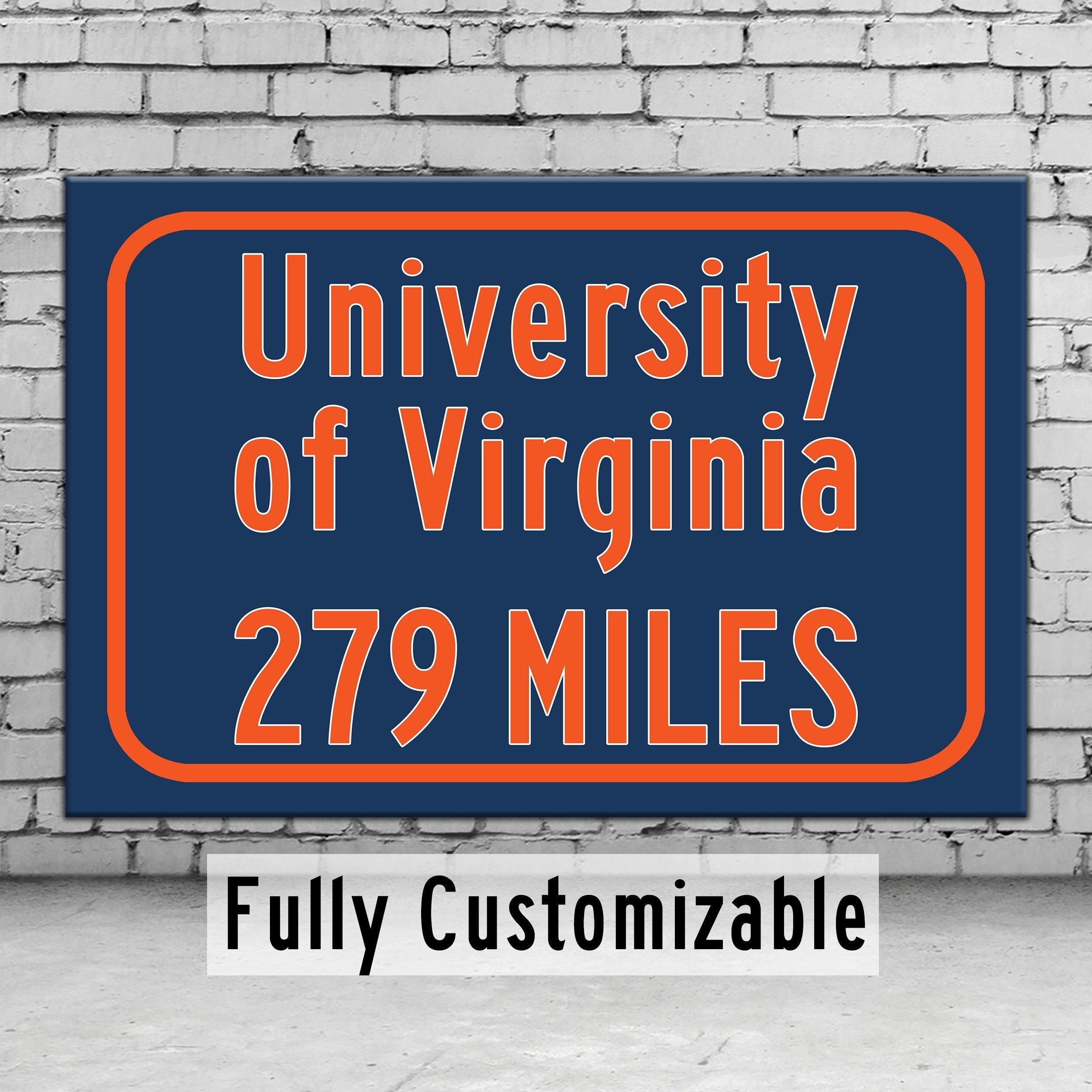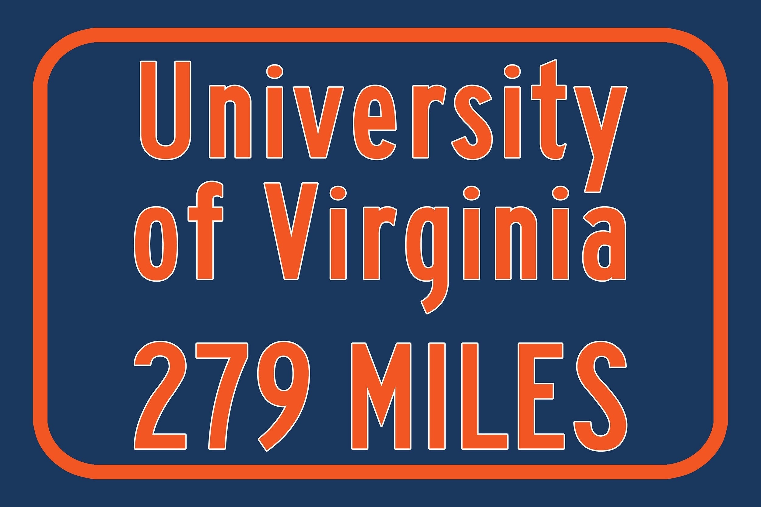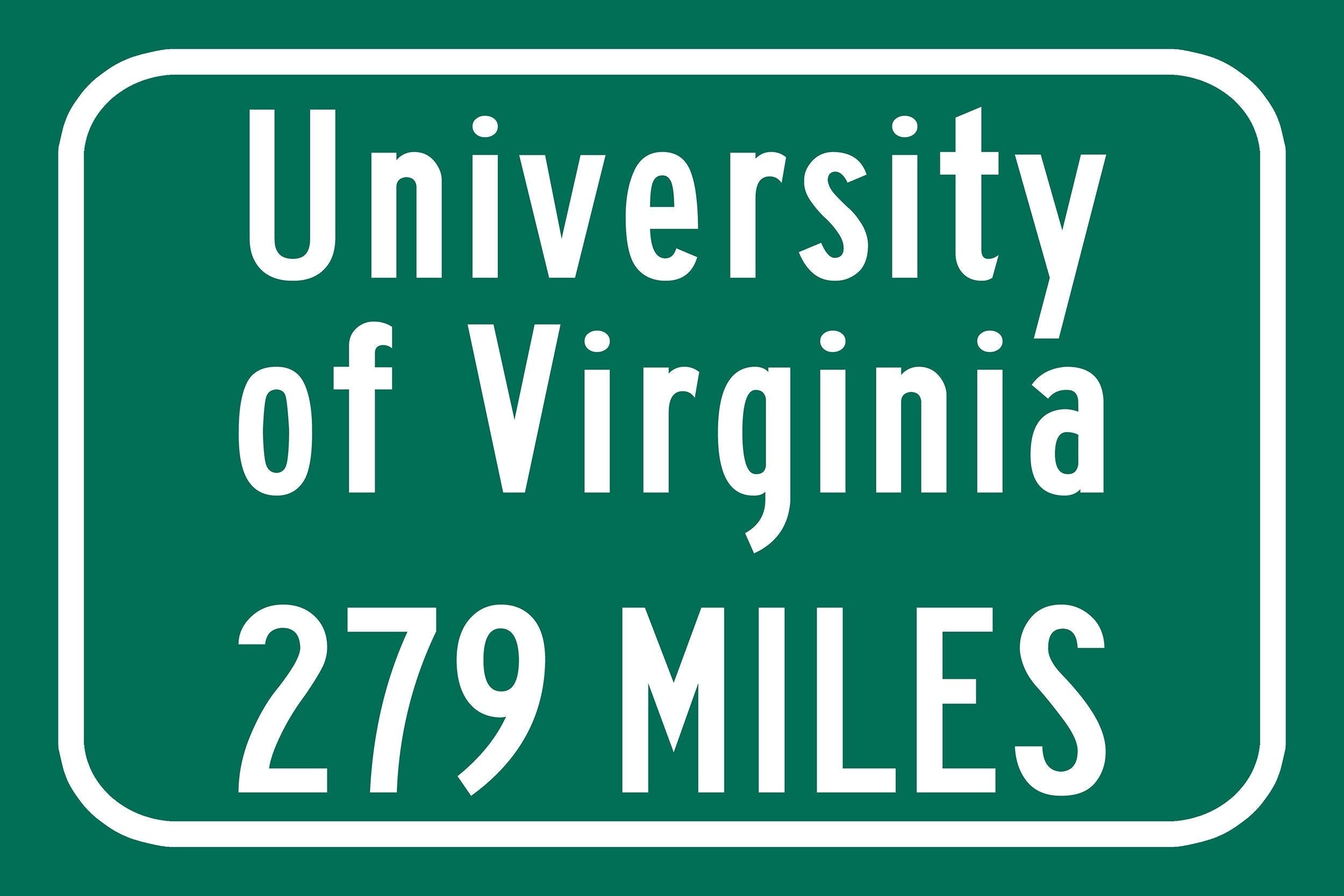 Personalized Highway Distance sign to University of Virginia. Our signs are as large as 2 x 3 feet. University of Virginia sign. Virginia Cavaliers sign.